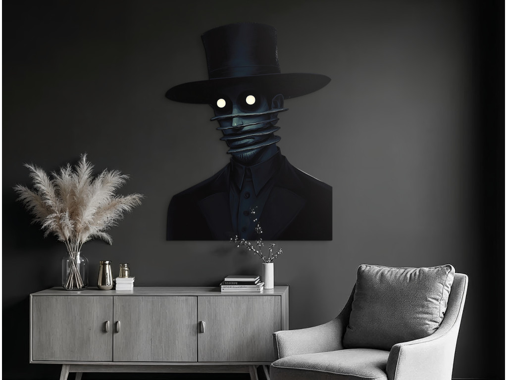 Die beunruhigende und zugleich faszinierende Figur mit dem schwarzen Zylinder besticht auf den ersten Blick. Ihr segmentierter Hals wie eine Feder und ihre leuchtenden Augen im dunklen Schatten ihres Gesichts schaffen eine besondere Atmosphäre von Geheimnis und Spannung. Das Werk balanciert auf der Grenze zwischen Surrealismus und gotischer Fantasie und wirft Fragen auf, die unbeantwortet bleiben.