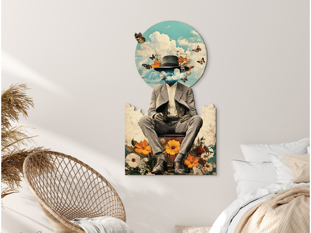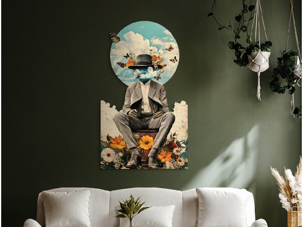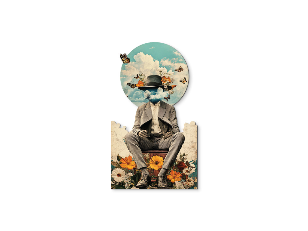 Dieses traumhafte Werk zeigt eine Figur in einem eleganten Anzug und Hut, deren Kopf sich in den Wolken verliert – als Metapher für Nachdenklichkeit, Freiheit und Sehnsucht nach Flucht. Vor dem Hintergrund des blauen Himmels flattern Schmetterlinge, die zusammen mit dem Blumenpodest in warmen Orange- und Weißtönen den Frühling, die Erneuerung und die friedliche Verbindung des Menschen mit der Natur symbolisieren.