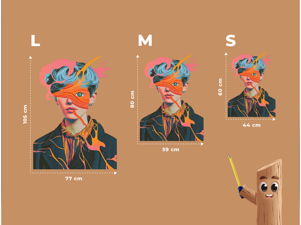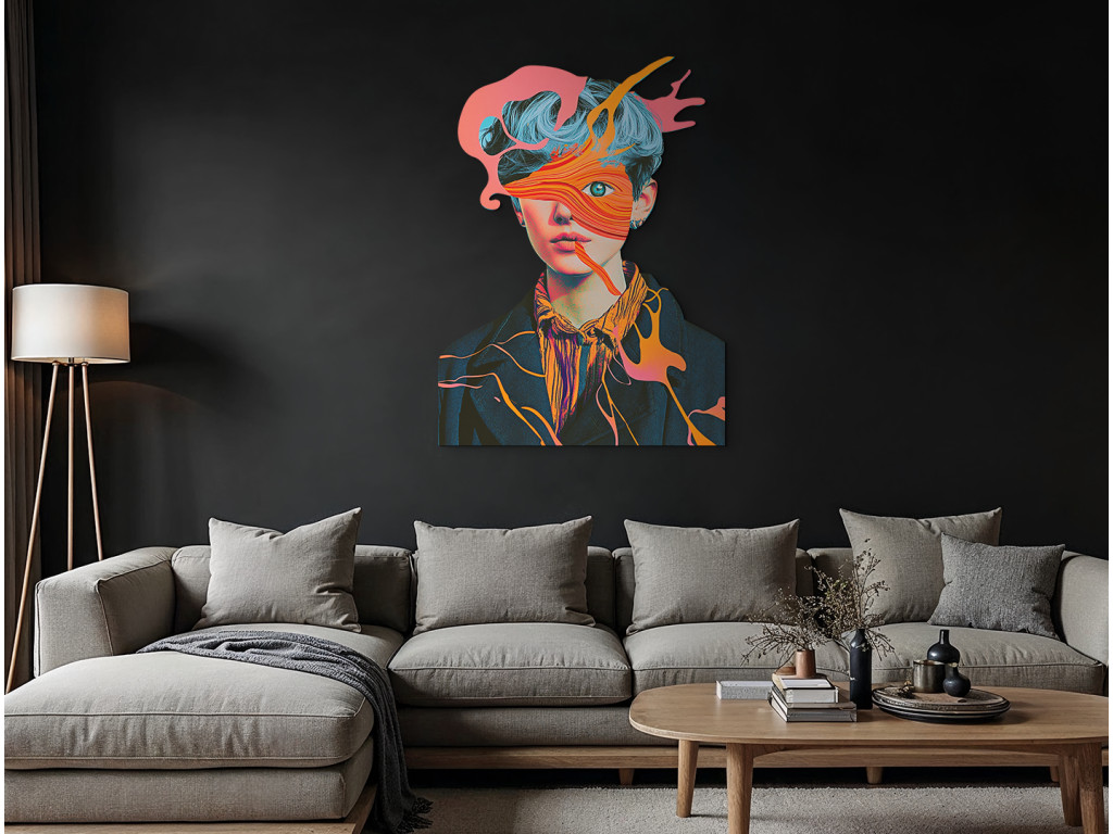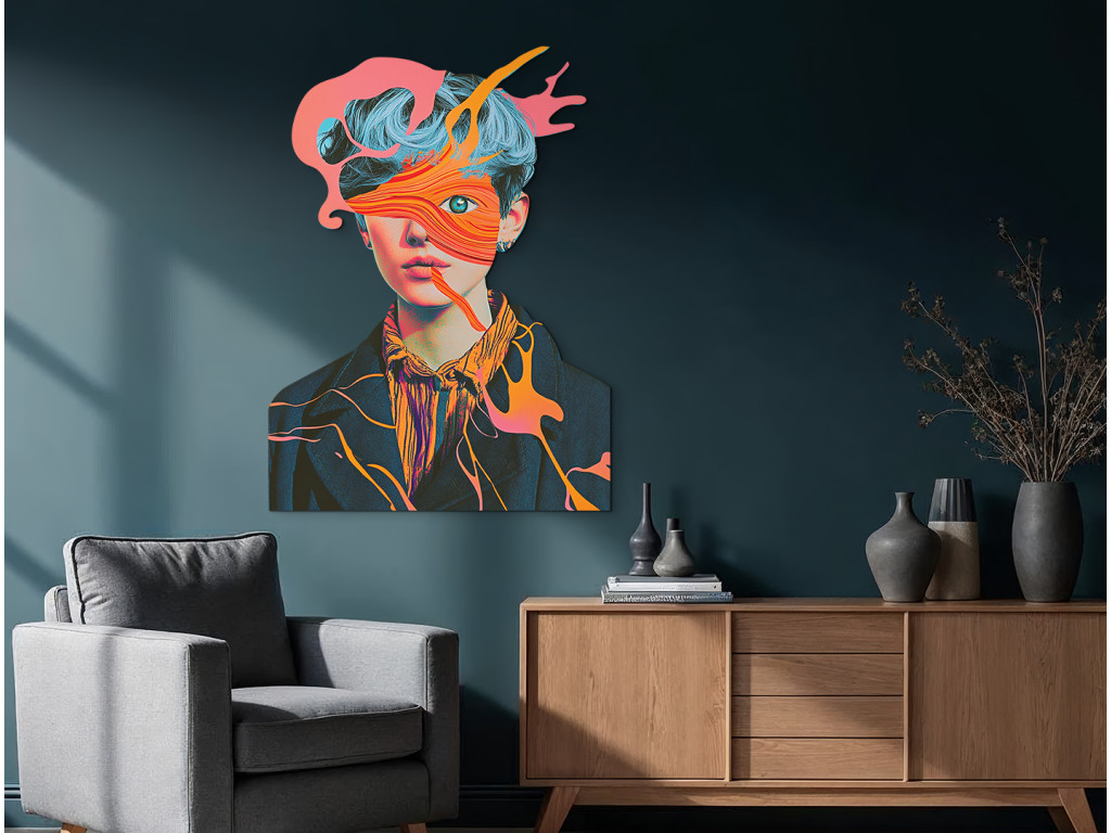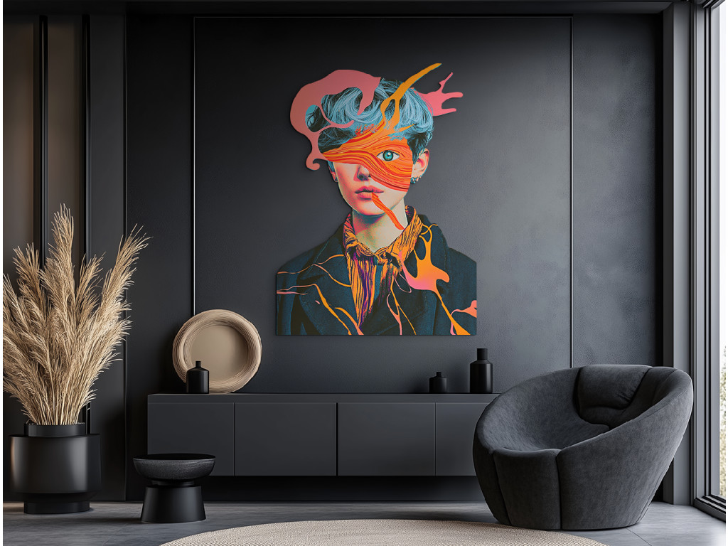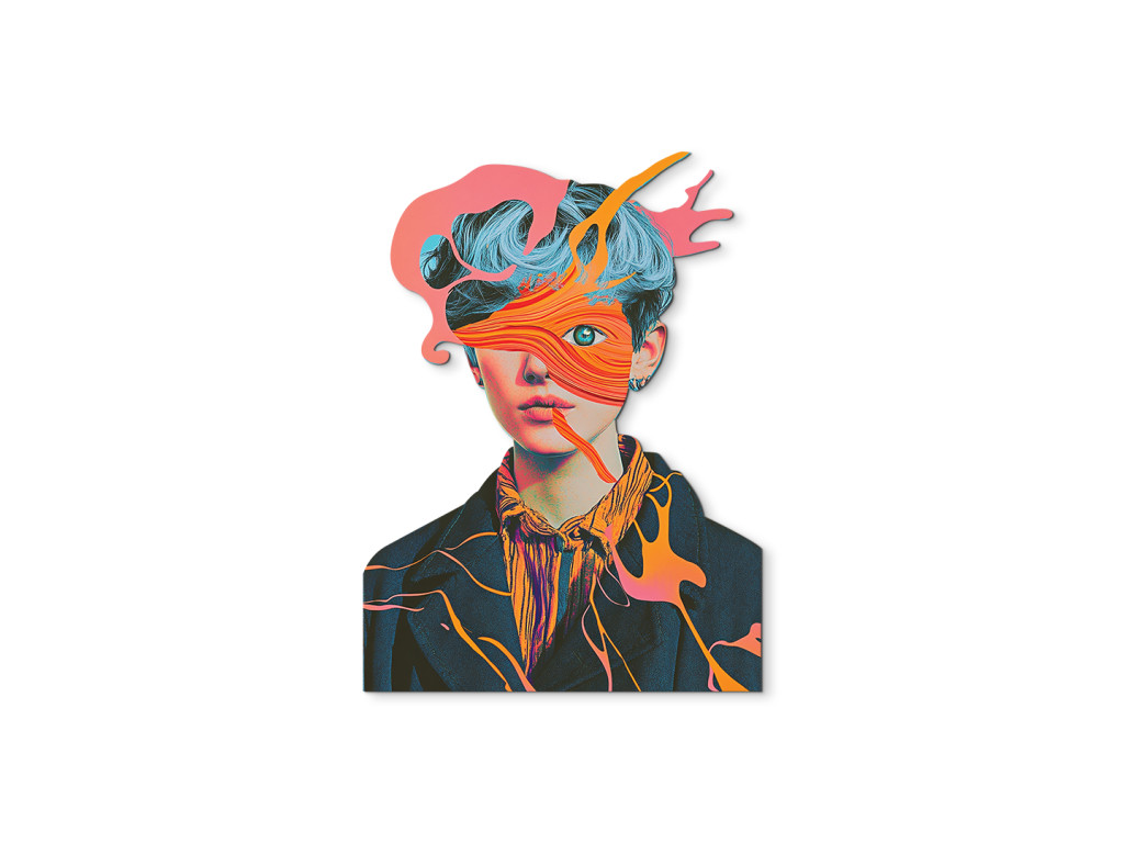 Das ausdrucksstarke Porträt einer Figur mit blauen Haaren und durchdringenden grünen Augen, die unter Schichten abstrakter Farbformen hervortreten. Die rosa und orangefarbenen Formen im Gesicht wirken wie aufgelöste Emotionen, eingefangen in Bewegung.