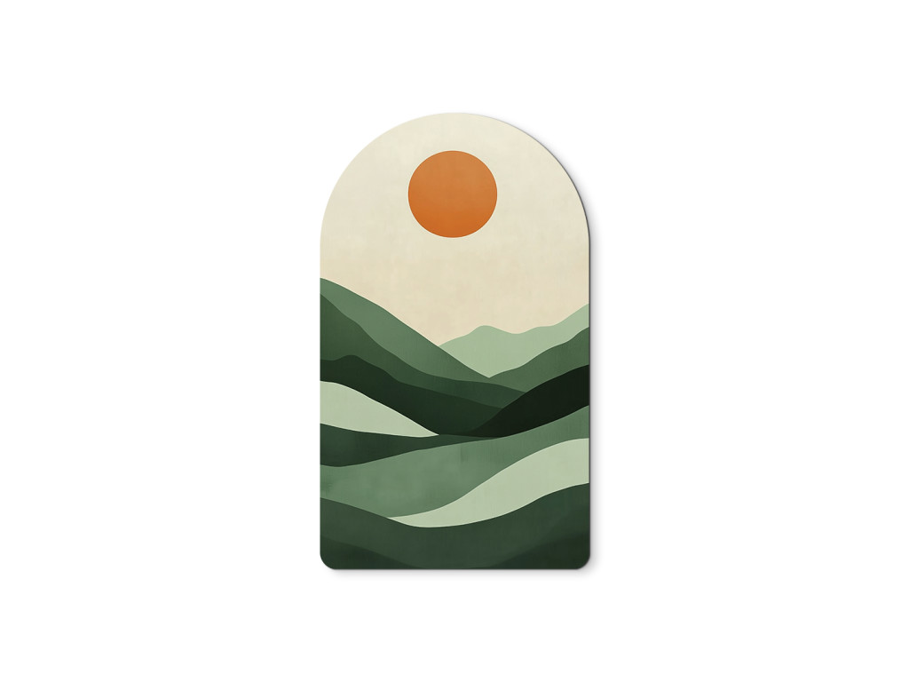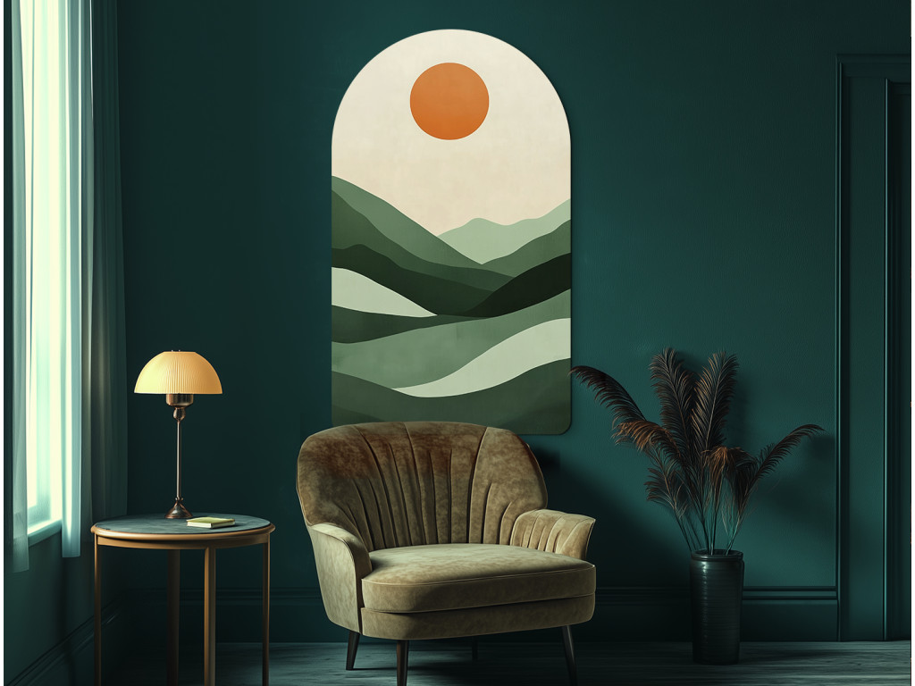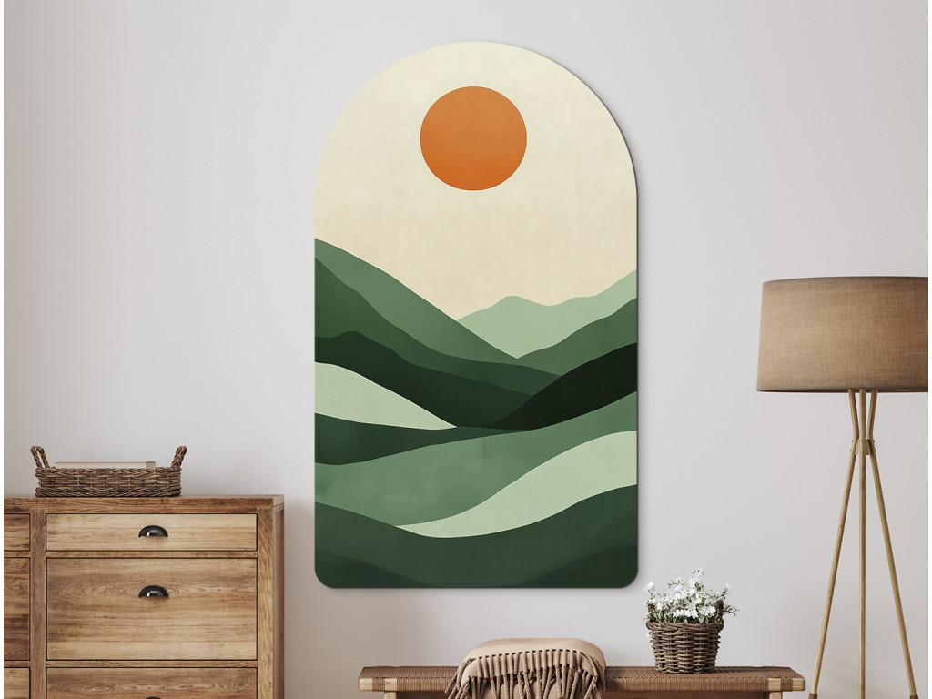 Dieses abstrakte Bild im modernen Stil zeigt eine ruhige Landschaft in minimalistischer Darstellung. Die geschichteten grünen Hügel und die orangefarbene Sonne bilden eine harmonische Komposition im Bogenformat, ideal als Wanddekoration für ein modernes Ambiente.