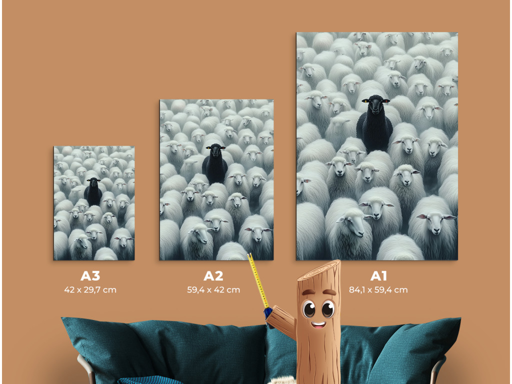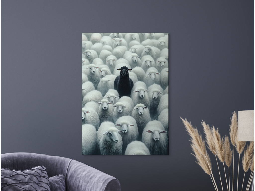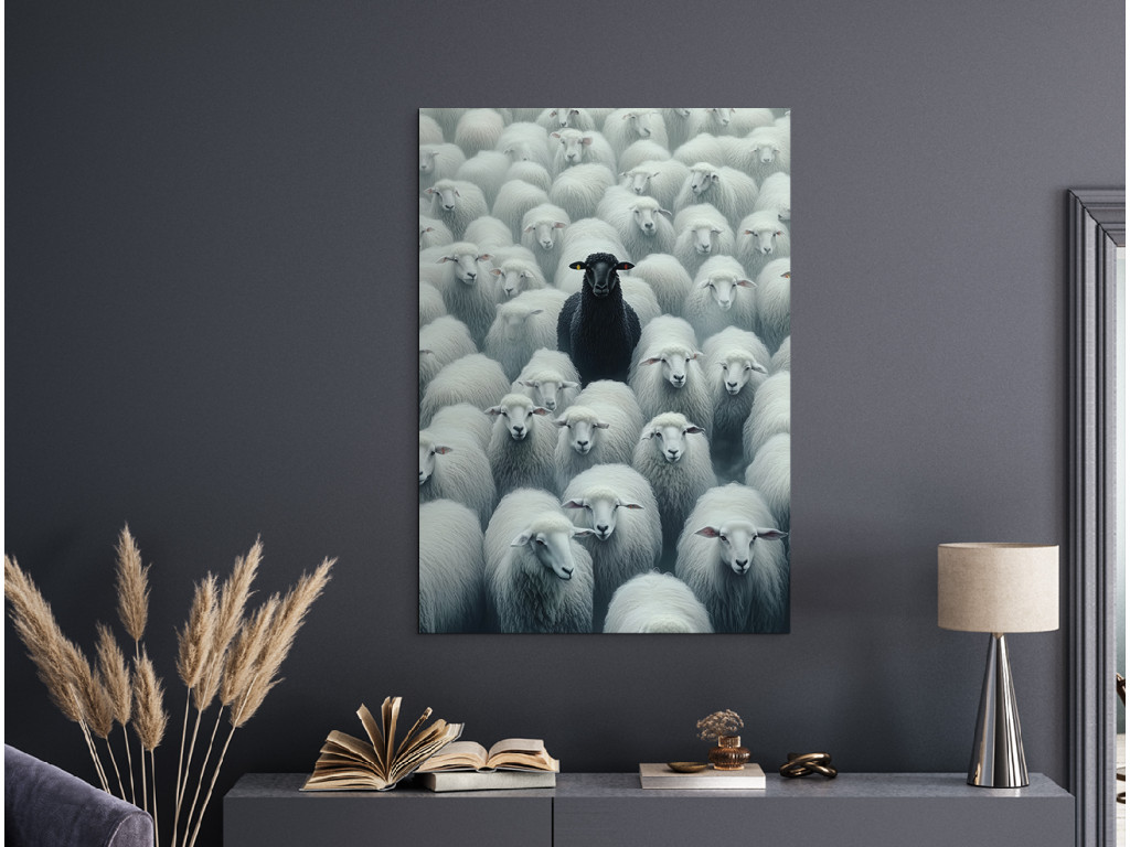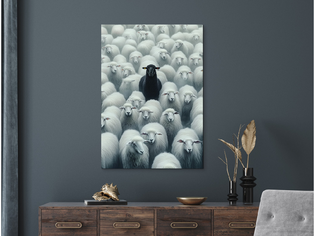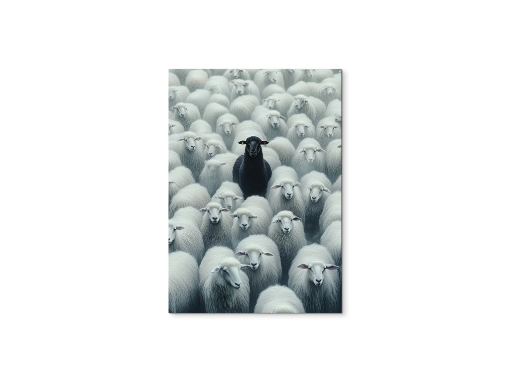 Das Bild zeigt ein schwarzes Schaf unter weißen und verdeutlicht damit auf eindrucksvolle Weise das Thema der Andersartigkeit und Individualität. Die Komposition drückt den Kontrast zwischen Konformität und dem eigenen Weg aus.