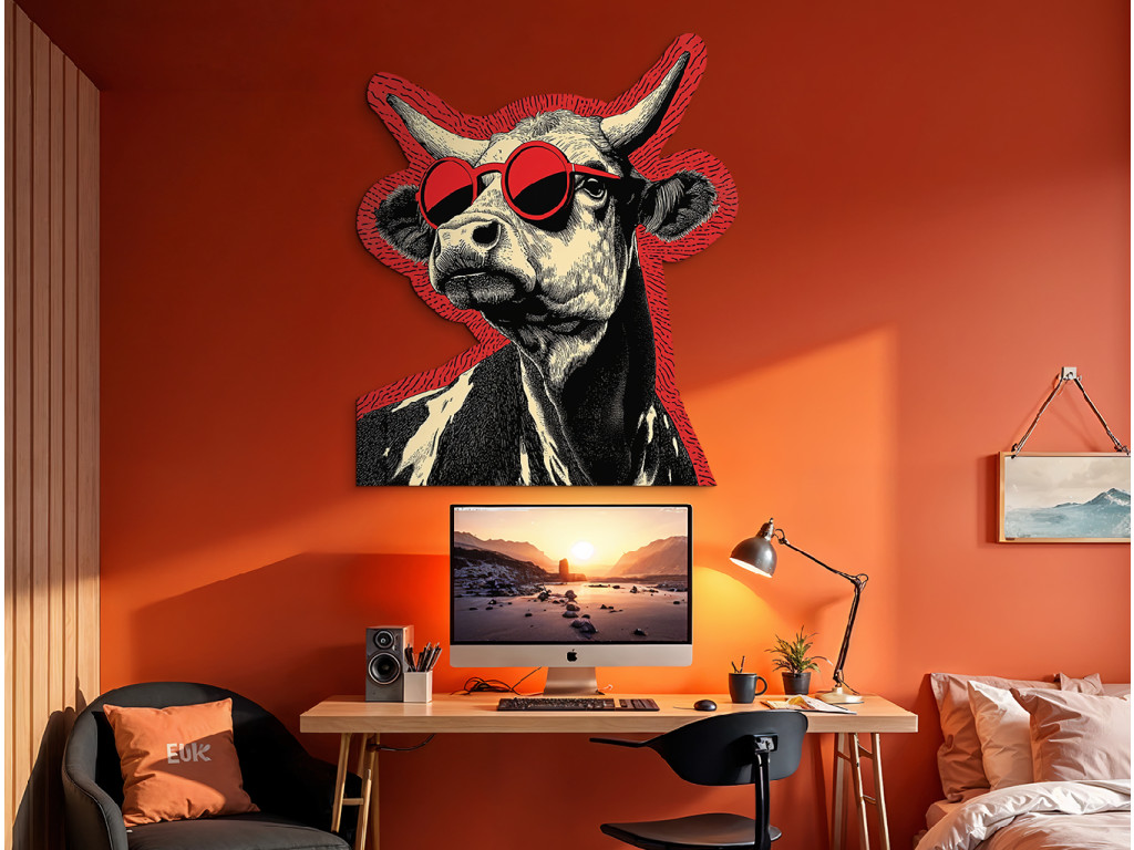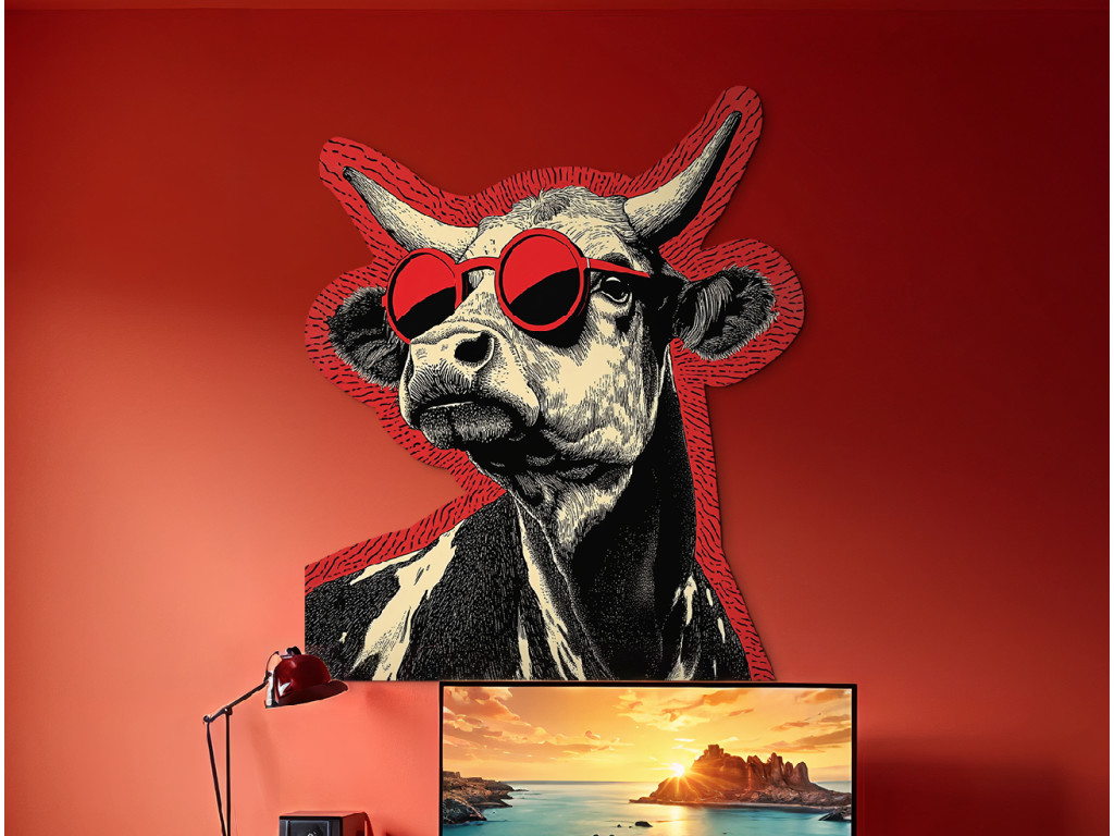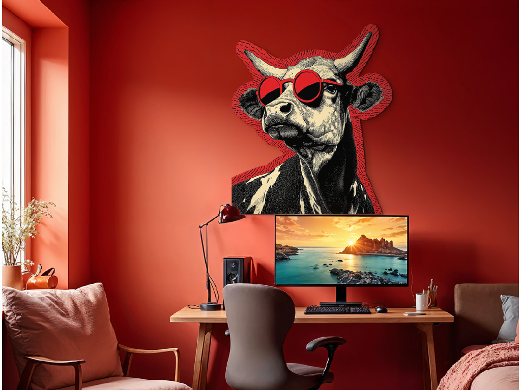 Der Wandsticker zeigt eine stilvolle Kuh mit einer auffälligen roten runden Sonnenbrille, die ihr ein modernes und witziges Aussehen verleiht. Die Kombination aus traditionellem Kunststil und modernem Element schafft eine unterhaltsame und originelle Komposition.