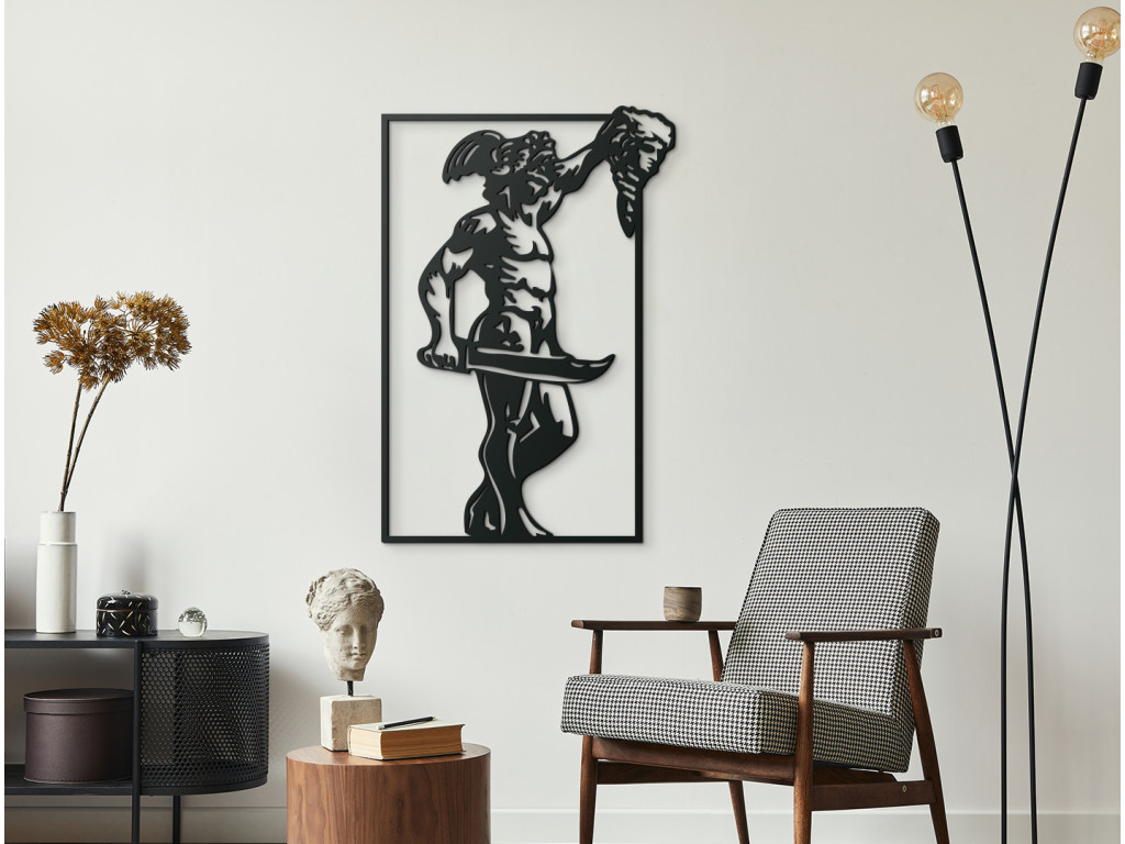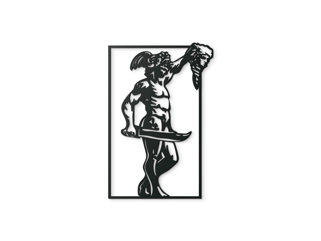 Dieses Holzbild entführt Sie in eine mythologische Geschichte, in der ein Held siegesbewusst den Kopf seines besiegten Gegners emporhebt. Die Dramatik der Szene wird durch die energischen Linien und die kontrastvollen Formen betont. Das Ergebnis ist eine eindrucksvolle Dekoration mit dem Flair weit zurückliegender Legenden.