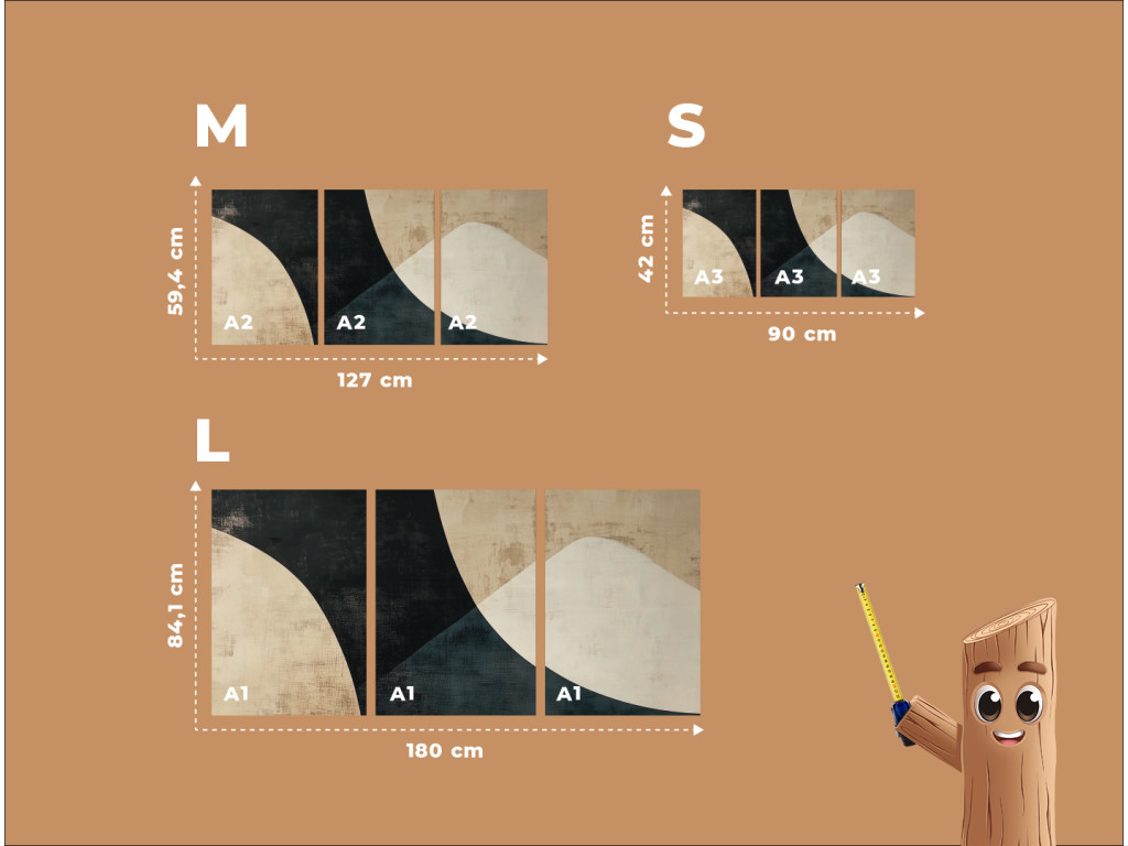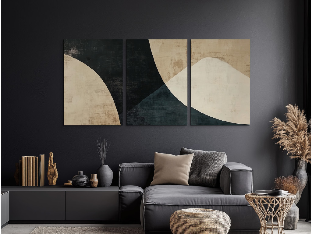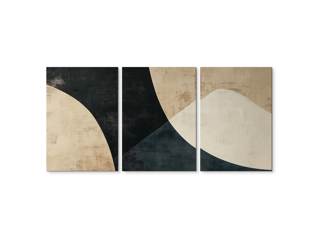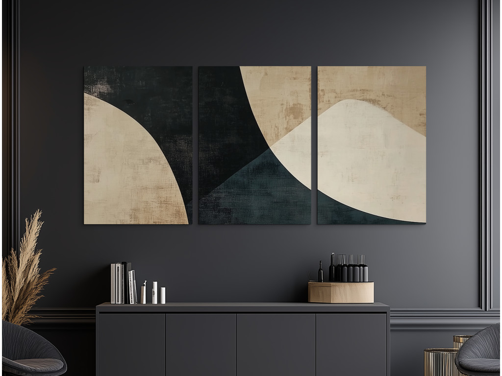 Elegantes dreiteiliges Bild im Stil der modernen abstrakten Kunst. Die Komposition kombiniert geometrische und organische Formen in harmonischer Ausgewogenheit. Es dominieren neutrale Farbtöne – dunkle Kontraste von Schwarz und die Sanftheit von Sand- oder Beigetönen. Geeignet als Dekoration für moderne Innenräume, Wohnzimmer oder Büros.