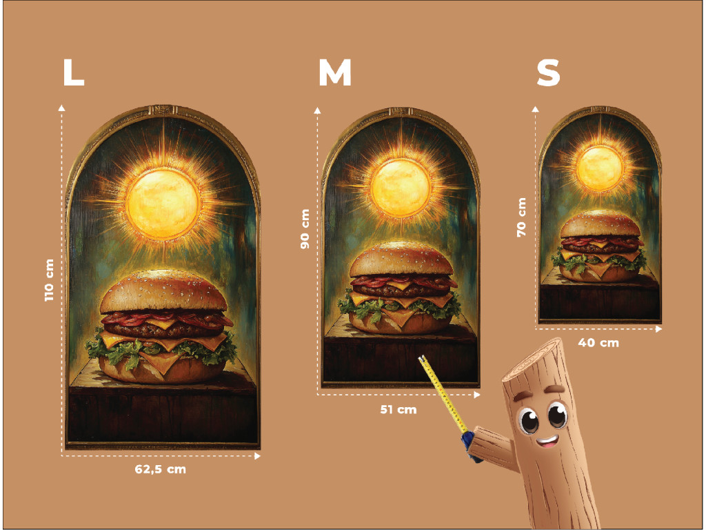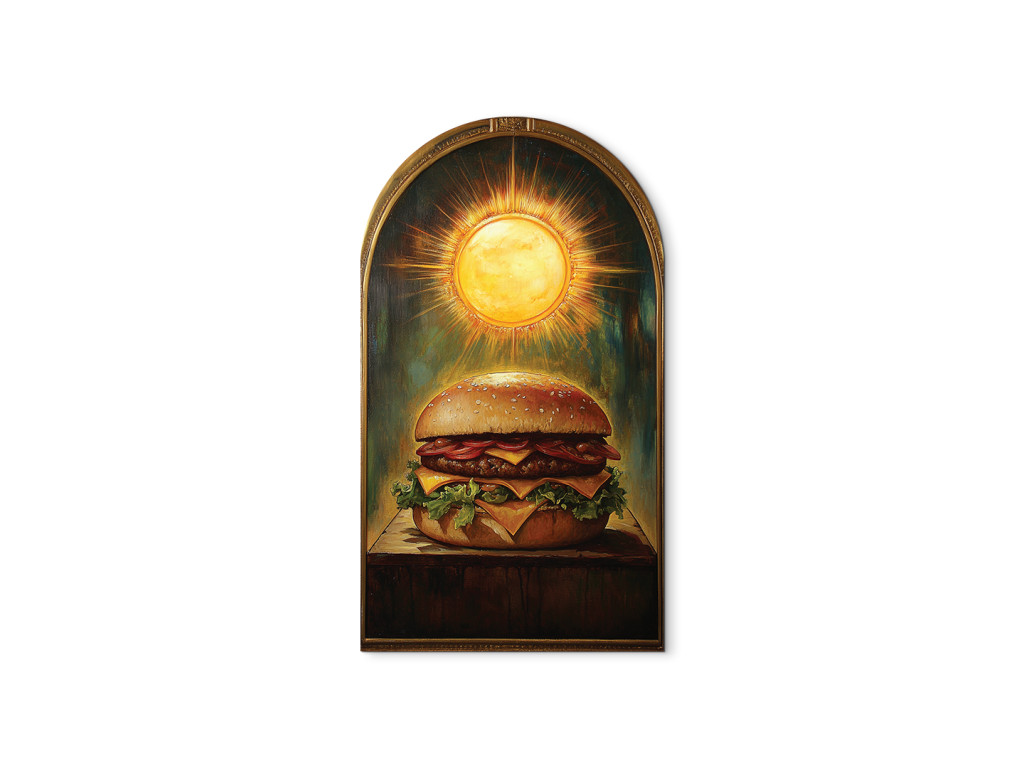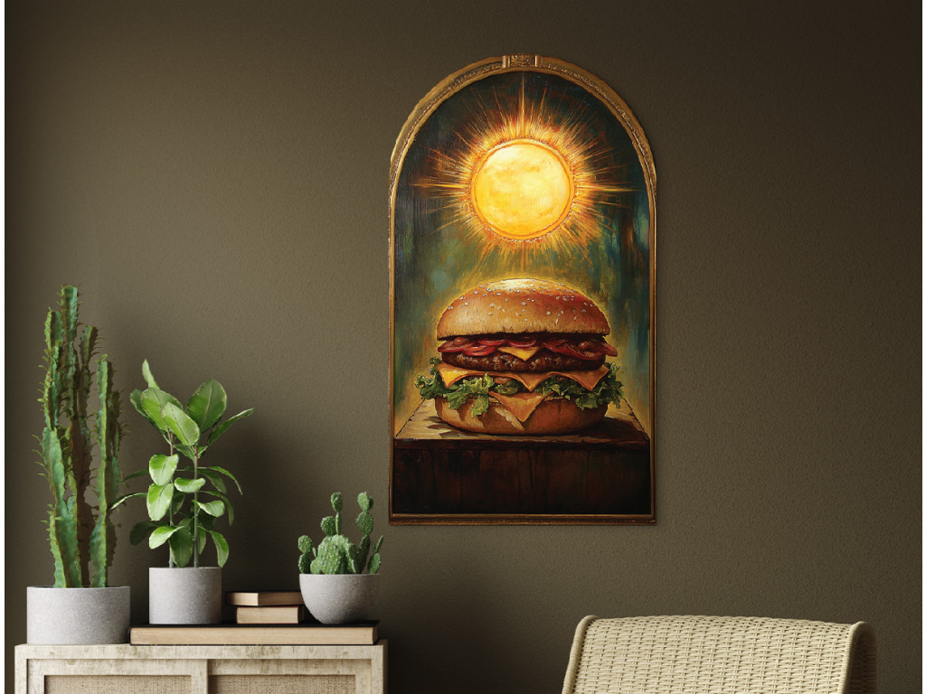 Das Bild zeigt einen Hamburger als Symbol der heutigen Zeit – in einem goldenen Rahmen und von oben beleuchtet. Im Kontrast zum dunklen Hintergrund wirkt er wie ein Symbol der modernen Kultur, deren Ruhm nur vorübergehend sein kann.