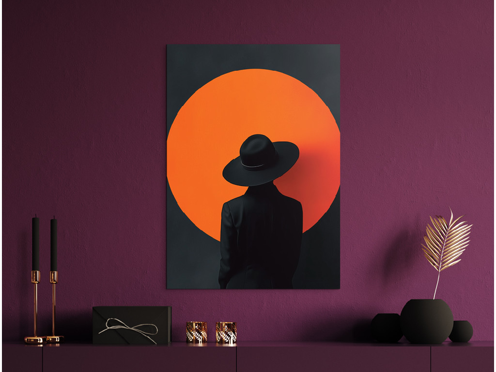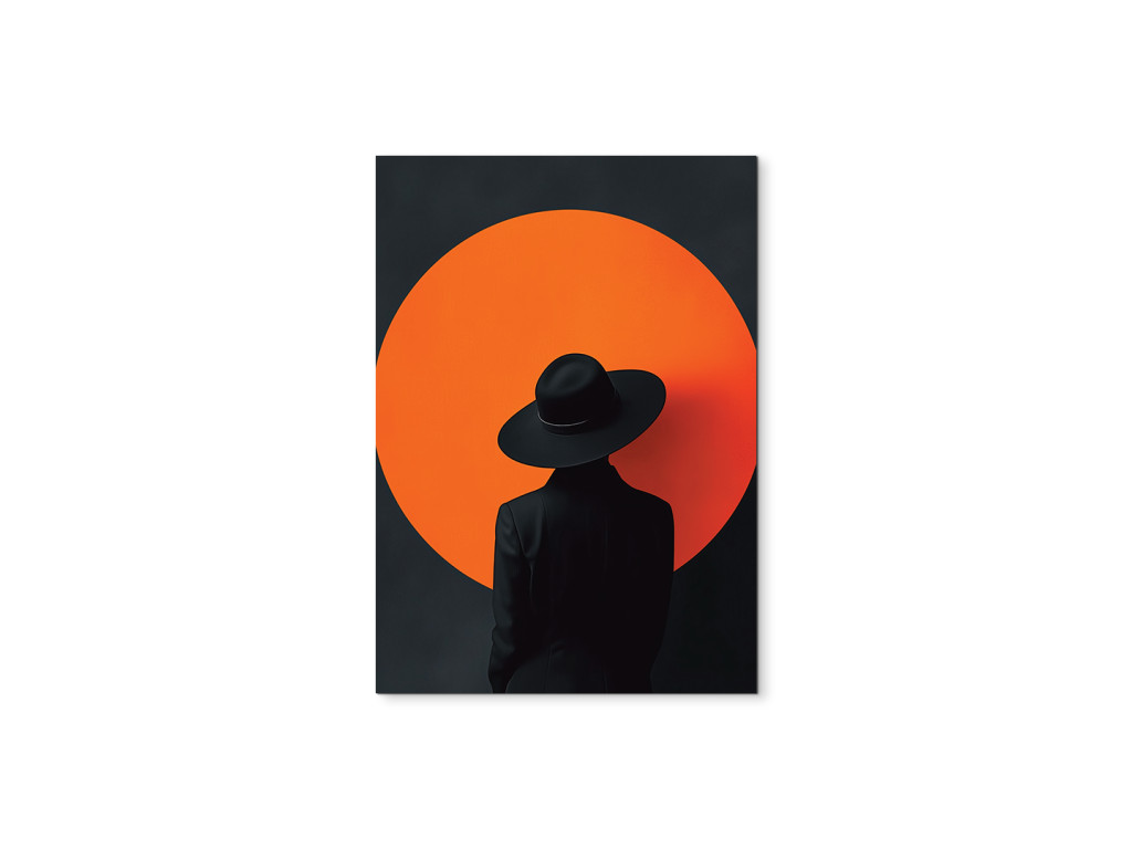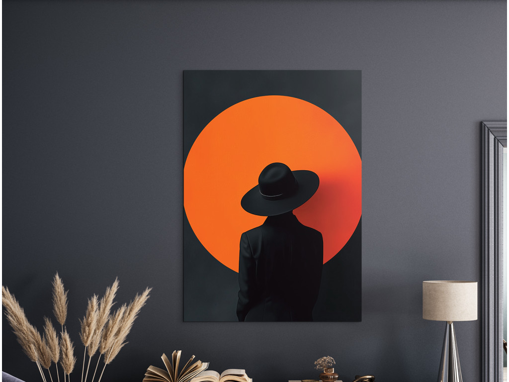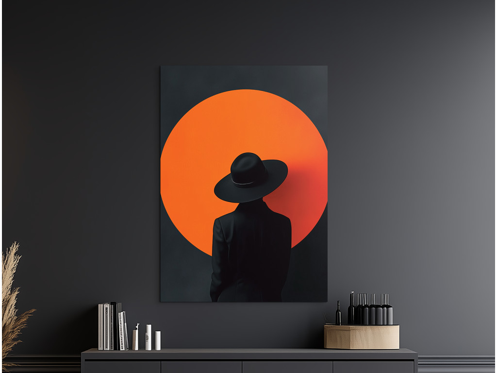 Das minimalistische Bild zeigt die Silhouette einer Frau mit einem Hut, die vor einem auffälligen orangefarbenen Kreis steht, der an die Sonne oder den Mond erinnert. Das Bild verwendet einfache Linien, gedämpfte Farben und den Kontrast zwischen Figur und Hintergrund, wodurch eine elegante und zeitlose Komposition entsteht.