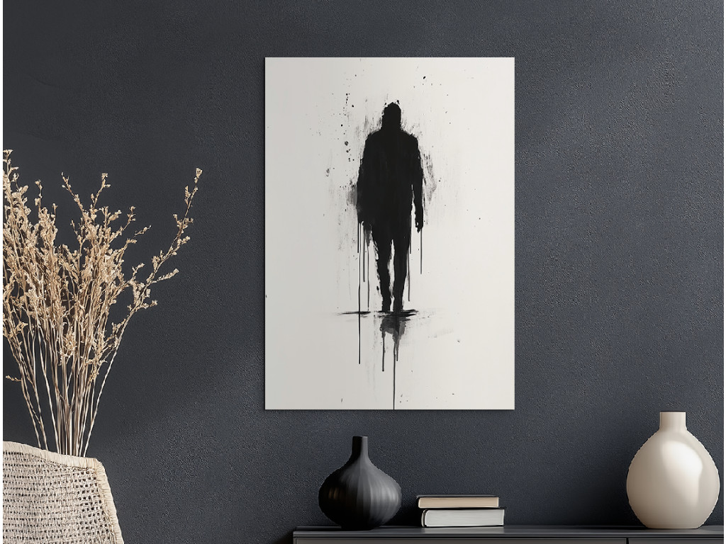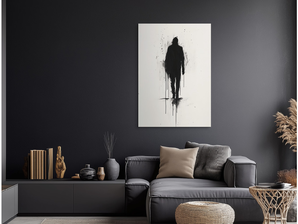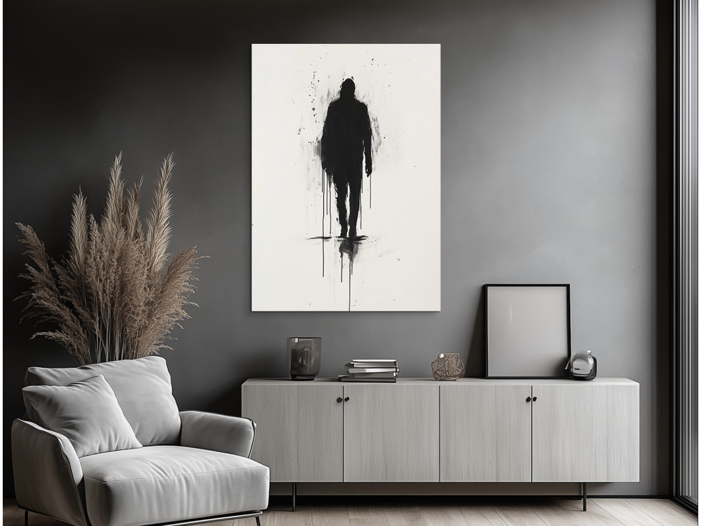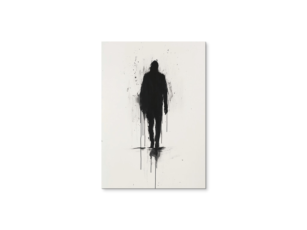 Das abstrakte Gemälde zeigt die schwarze Silhouette einer gehenden Figur vor einem hellen Hintergrund, mit verschwommenen und verlaufenden Effekten, die Bewegung und emotionale Tiefe betonen. Das Werk ruft Gefühle der Einsamkeit, der Verwandlung oder der inneren Reise hervor.
