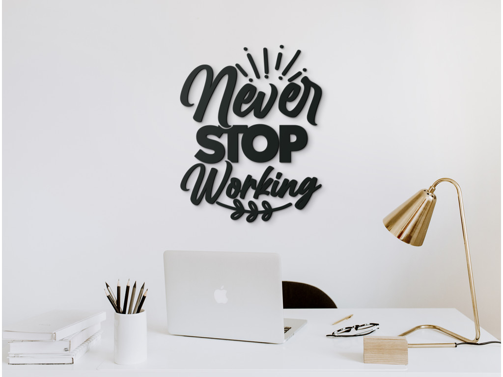Die Arbeit an sich selbst ist zugleich ein Lebenswerk. Die englische Aufschrift aus Holz Never stop working kann Sie daran erinnern, niemals aufzuhören zu arbeiten. Sie kann Ihnen im Arbeitszimmer, Ihren Kindern über dem Schreibtisch, der Gruppe im Fitnessstudio oder Ihren Kollegen im Büro eine tägliche Portion Motivation geben. Mit 2 Größen und 8 Farben kann man sie leicht an jede Einrichtung anpassen.