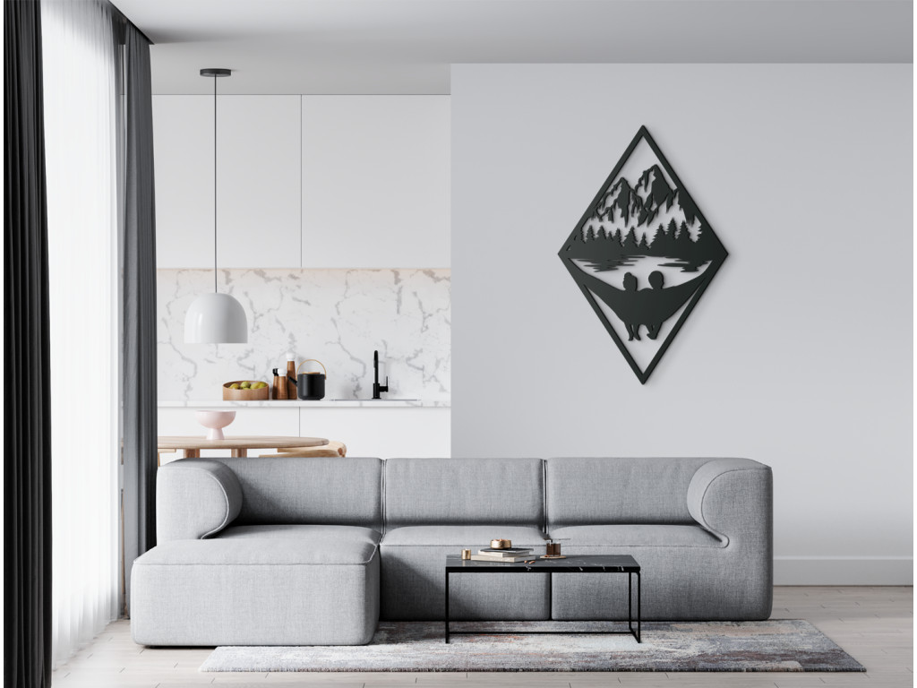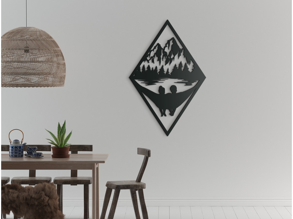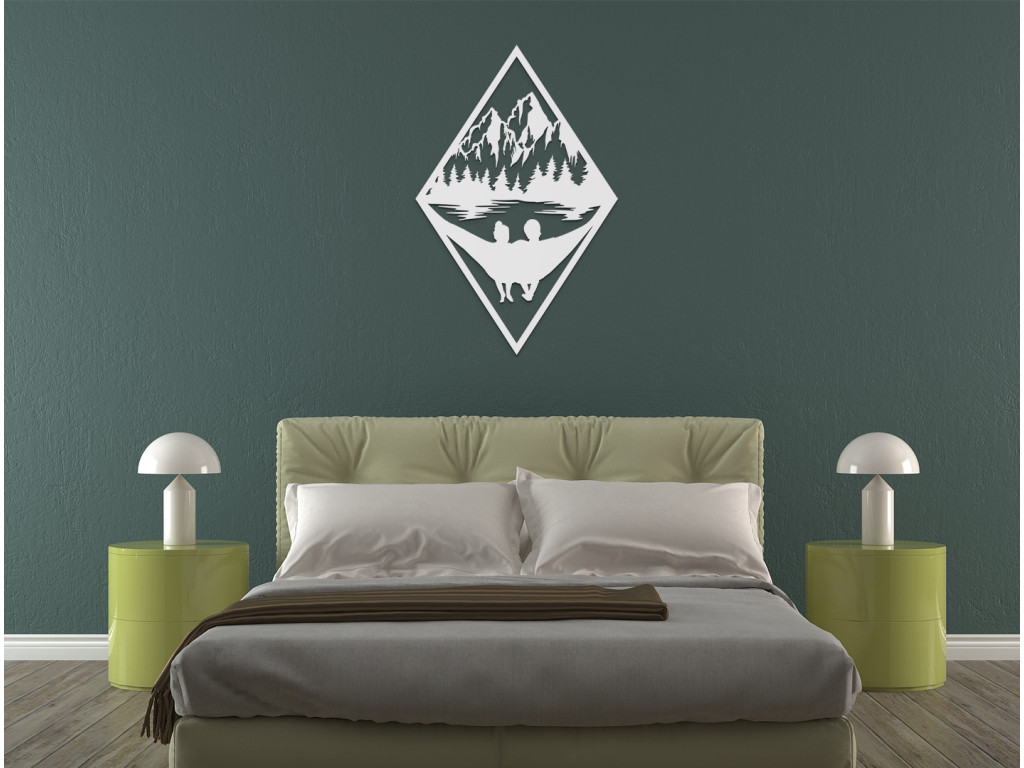 Dieses originelle Holzbild kann auch Ihre Wohnzimmerwand verschönern. Das verliebte Paar, das darauf abgebildet ist, genießt vom Schaukelnetz aus einen wunderbaren Ausblick. Das Bild besteht aus einer hochwertigen HDF-Platte mit 3 mm Stärke. Sie können unter mehreren Farbdekors und Größen wählen.