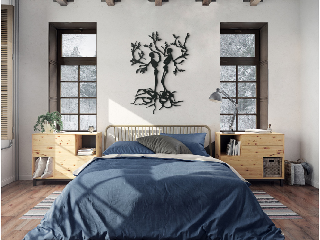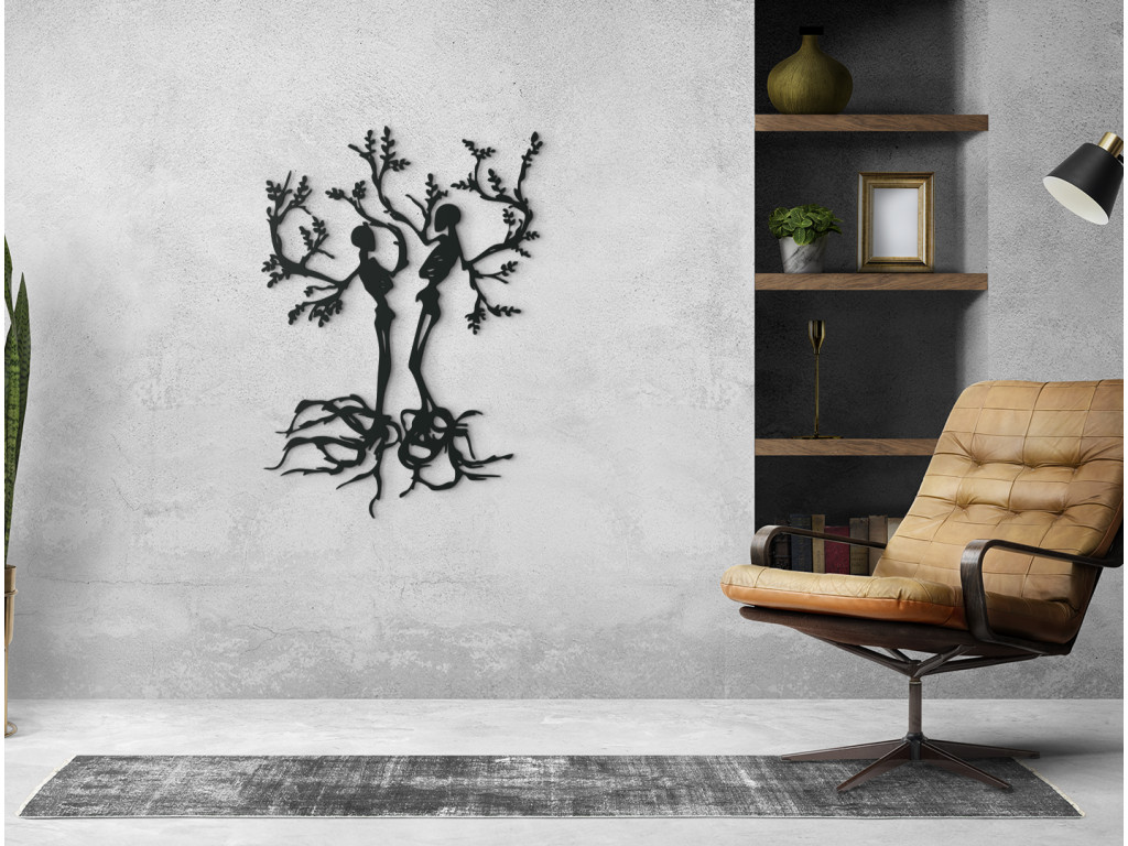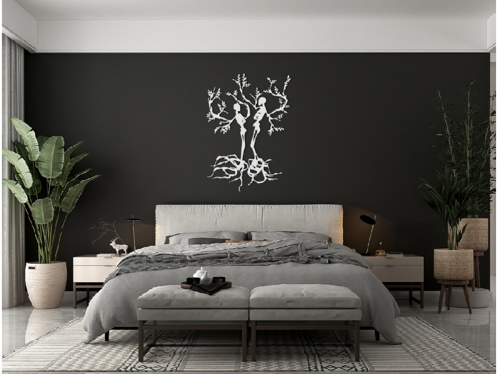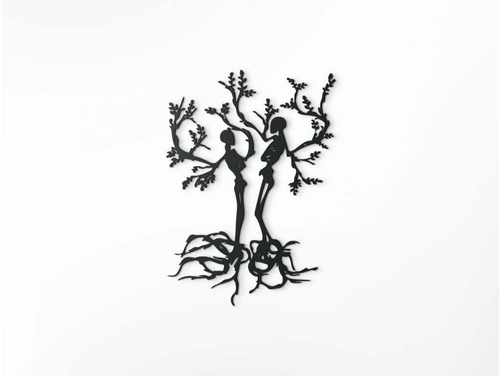 Das dekorative Holzbild mit Bäumen für die Wand mit den Figuren von Menschen ist ein hervorragendes Geschenk. Es zeigt einen Mann und eine Frau, aus denen die Äste von Bäumen wachsen. Die Dekoration eignet sich für kleine und auch für große Räume.