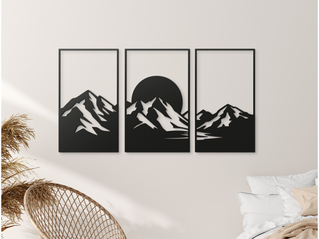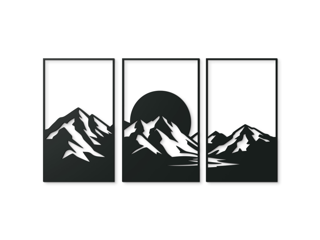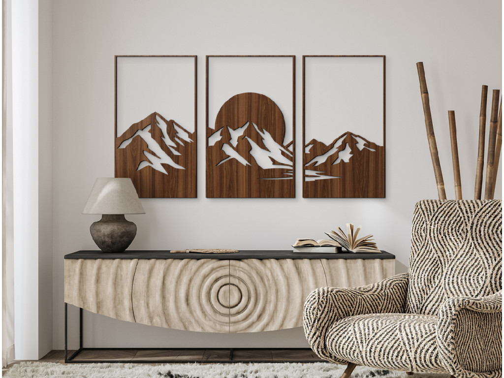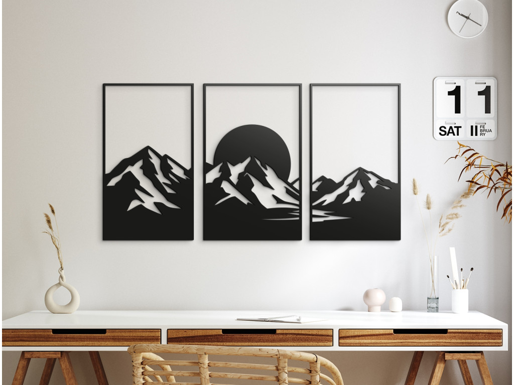 Das Bild „Berghorizont“ besteht aus drei vertikalen Paneelen, die die Schönheit der Berge in minimalistischer Ausführung einfangen. Das dunkle Holz kontrastiert mit dem hellen Hintergrund und erzeugt einen sanften 3D-Effekt, der den Blick auf sich zieht. Auf der mittleren Tafel sticht das Motiv der Sonne hervor, das Wärme und Ausgeglichenheit symbolisiert. Sie können aus mehreren Farbvarianten wählen, die Ihr Ambiente perfekt ergänzen.