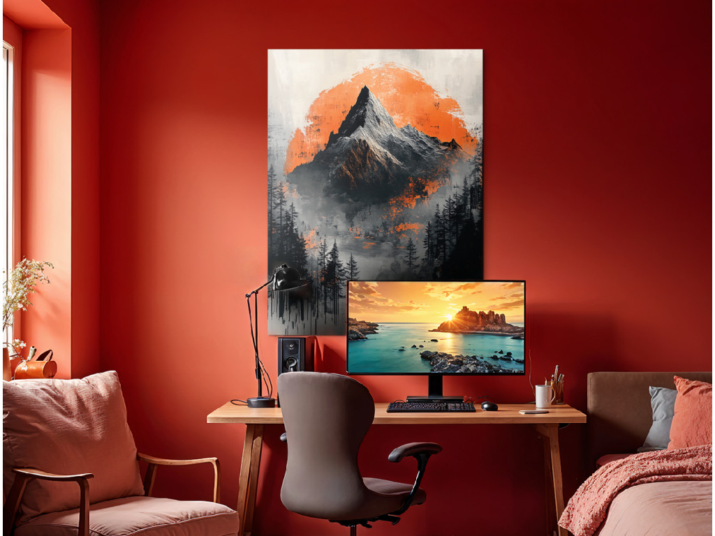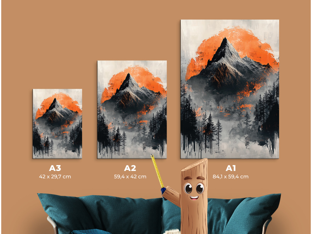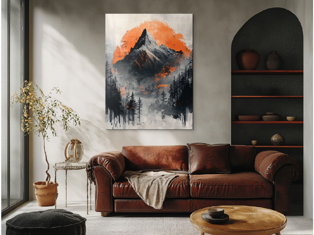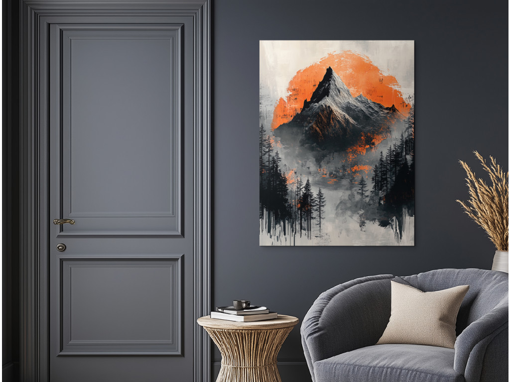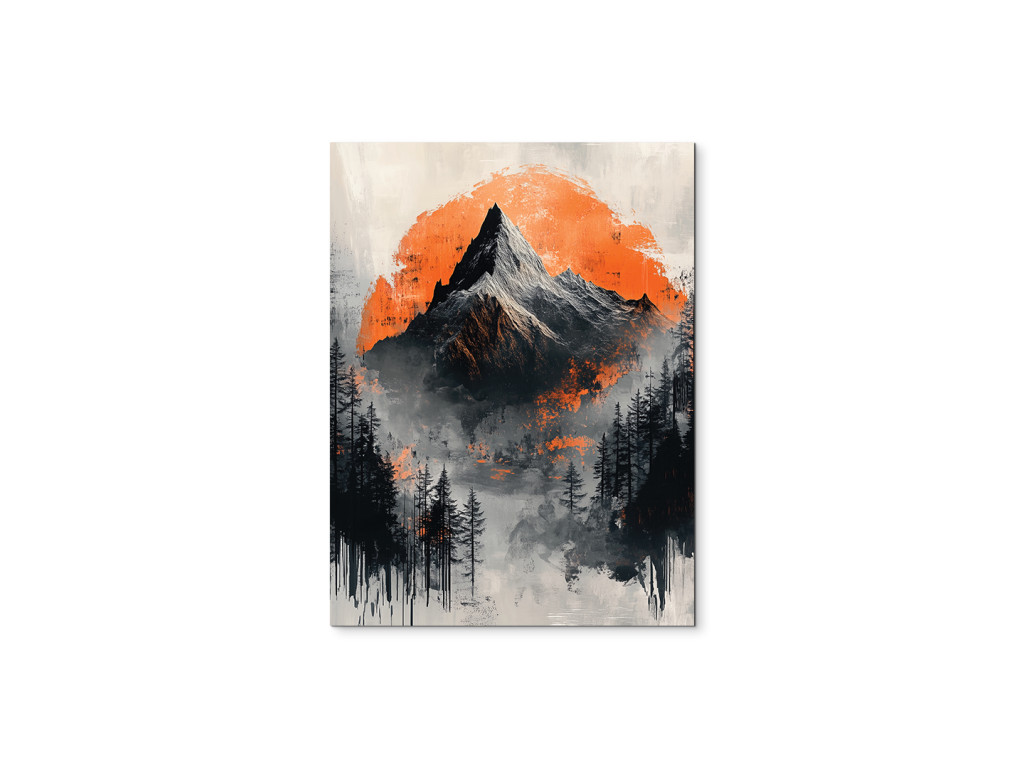 Das abstrakte Bild zeigt einen dramatischen Berggipfel, der aus einem nebligen Wald hervortritt und einen Kontrast zum feuerorangen Himmel bildet. Die dunklen Silhouetten der Bäume im Vordergrund erzeugen einen starken visuellen Kontrast, während markante Pinselstriche und verschwommene Strukturen dem Werk Energie und expressive Tiefe verleihen. Dieses Bild evoziert das Geheimnis der Natur und die Kraft des Lichts im Kontrast zum Schatten.