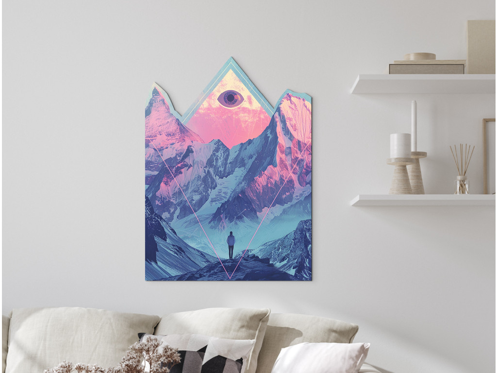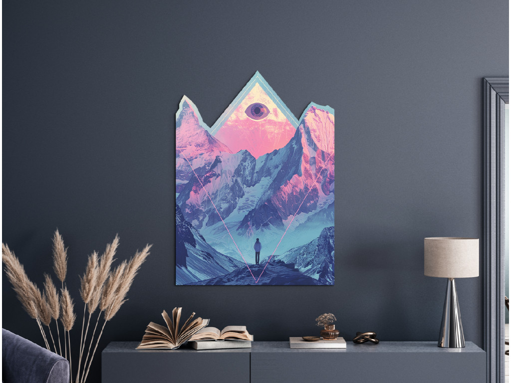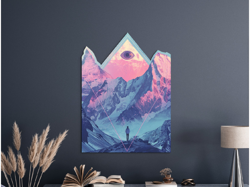 Das surrealistische Digitalgemälde verbindet majestätische Berge in zarten Rosa- und Blautönen mit mystischen Symbolen und einer introspektiven Atmosphäre. Eine einsame Gestalt im Vordergrund blickt zu den Höhen, wo über den Gipfeln ein Auge in einem Dreieck schwebt – Symbol der Erleuchtung und der spirituellen Verbindung.