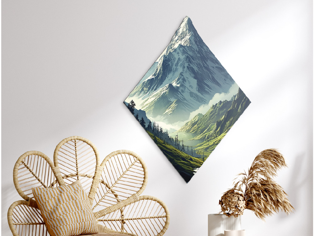Das Bild zeigt eine malerische Berglandschaft in Form eines Diamanten, in der grüne Hänge mit Bäumen zu einem ruhigen See hin abfallen. In der Ferne dominieren schneebedeckte Berggipfel, die einen Kontrast zu den warmen Farbtönen der Natur im Vordergrund bilden. Das ungewöhnliche Format verleiht dem Werk einen modernen und außergewöhnlichen Charakter.