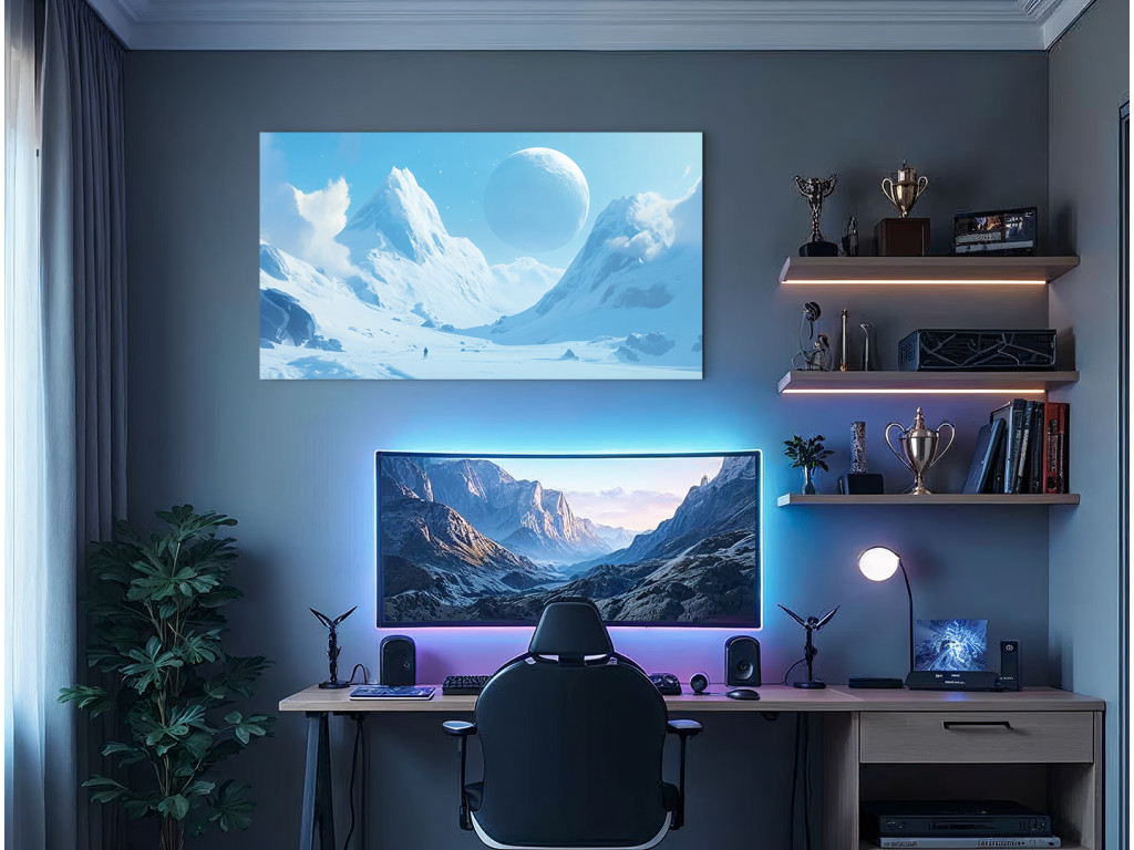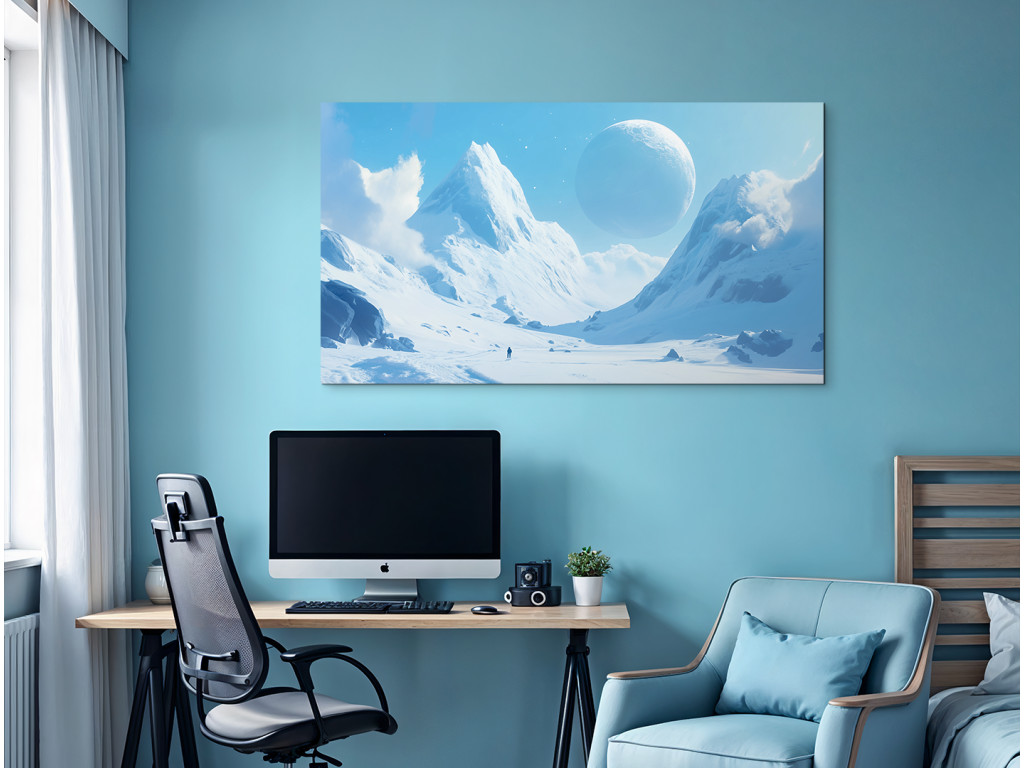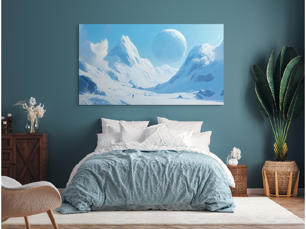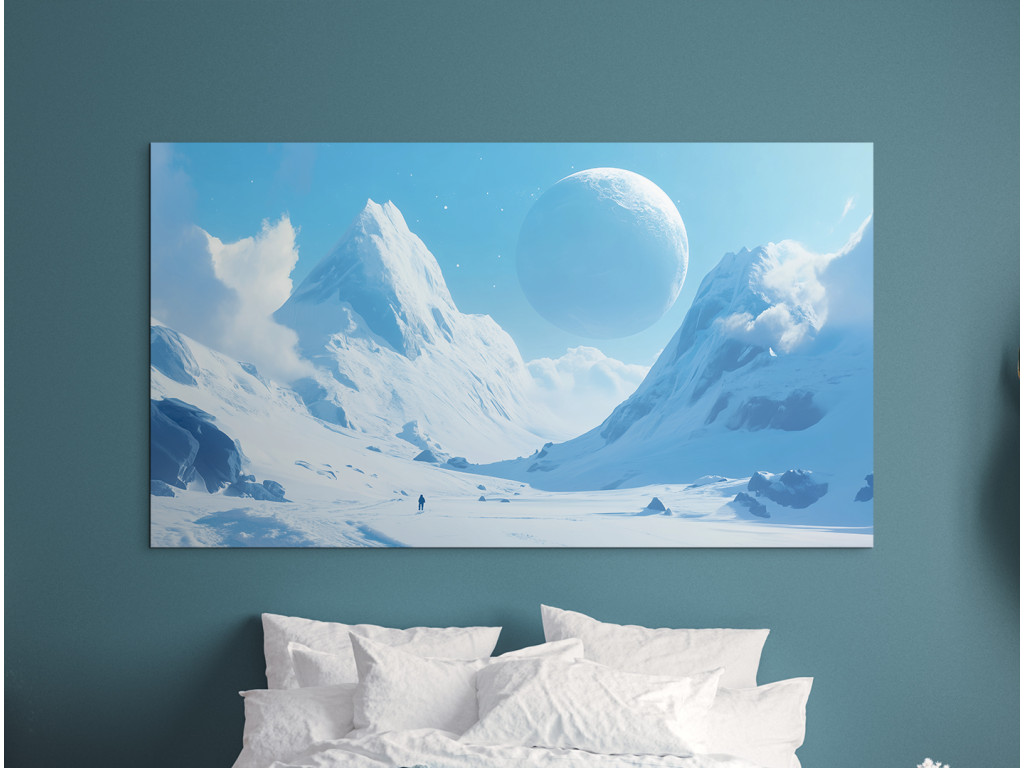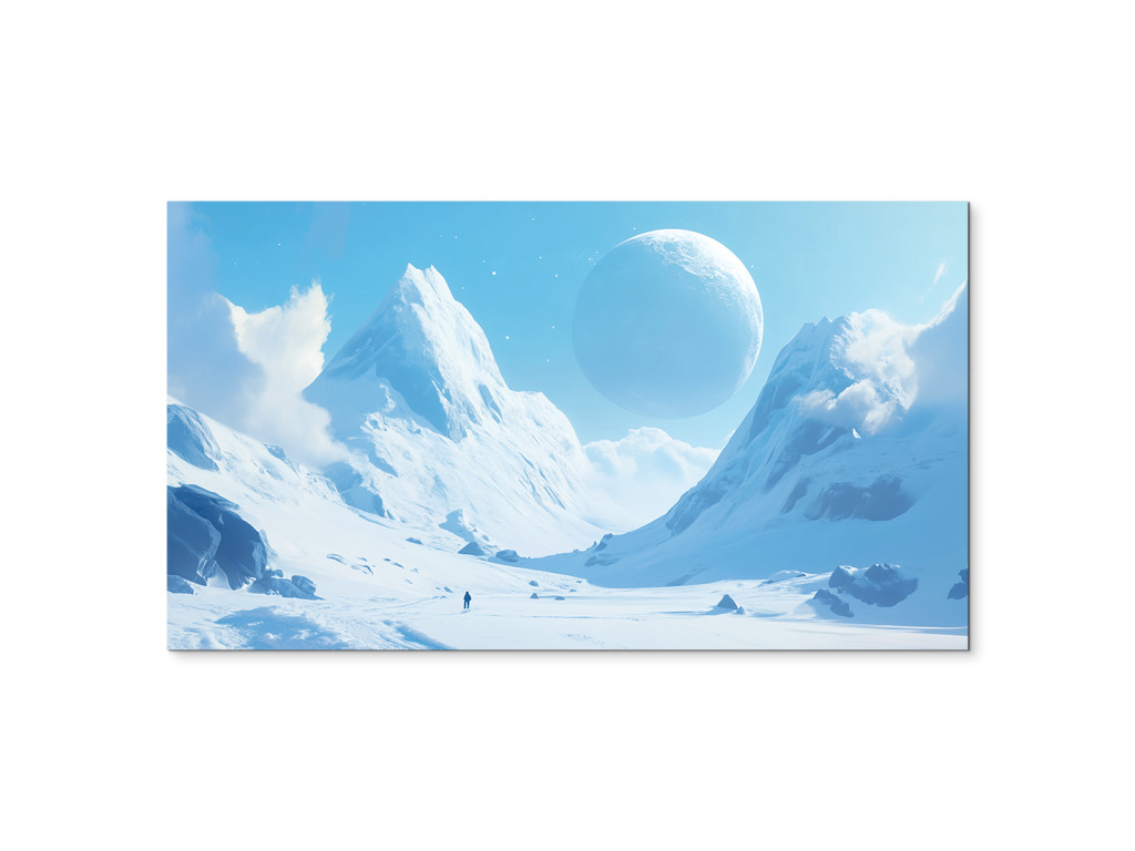 Die futuristische Berglandschaft unter einem riesigen Mond vermittelt den Eindruck einer fernen Planetenwelt. Eine Figur wandert durch die verschneite Landschaft, während über ihr ein unheimlicher Himmelskörper schwebt. Das Bild verbindet die Themen Einsamkeit und Unendlichkeit.