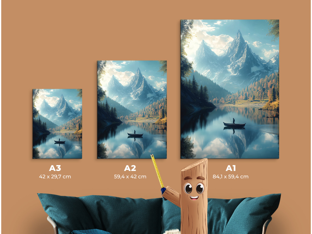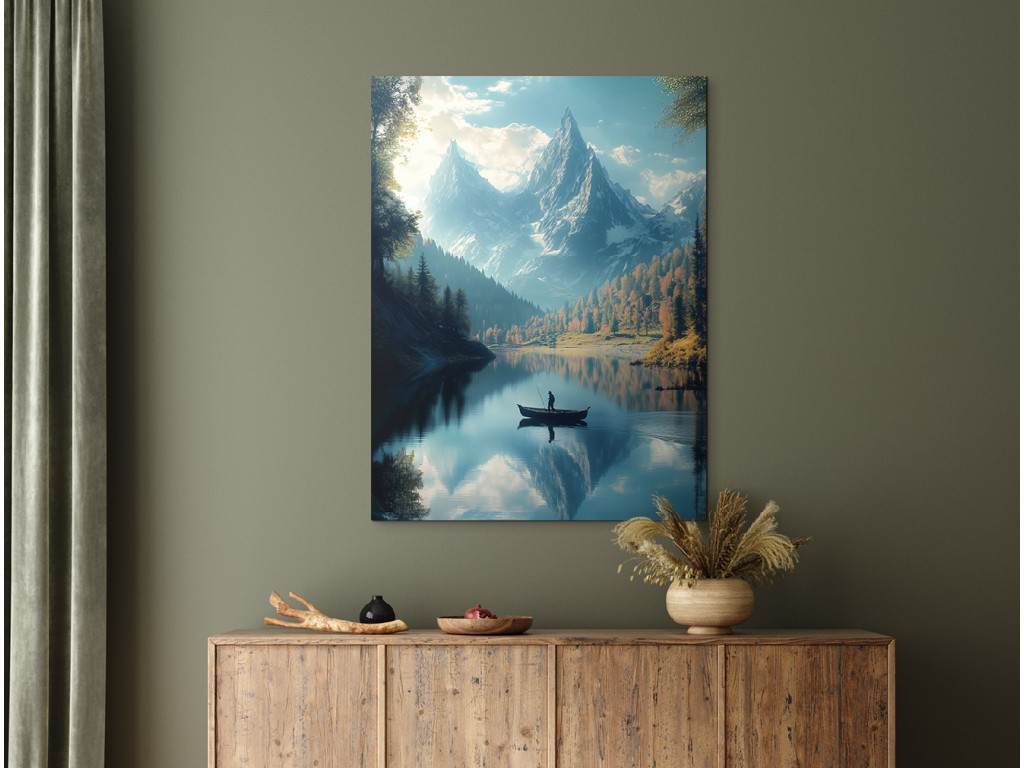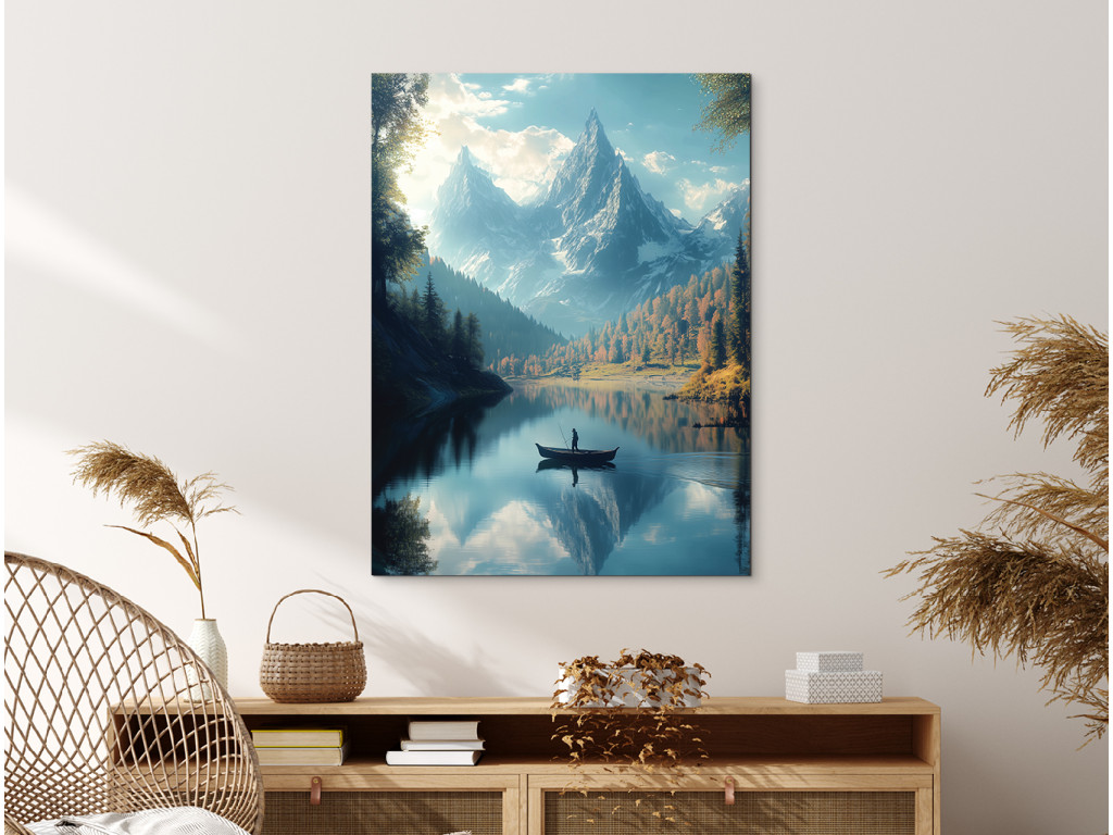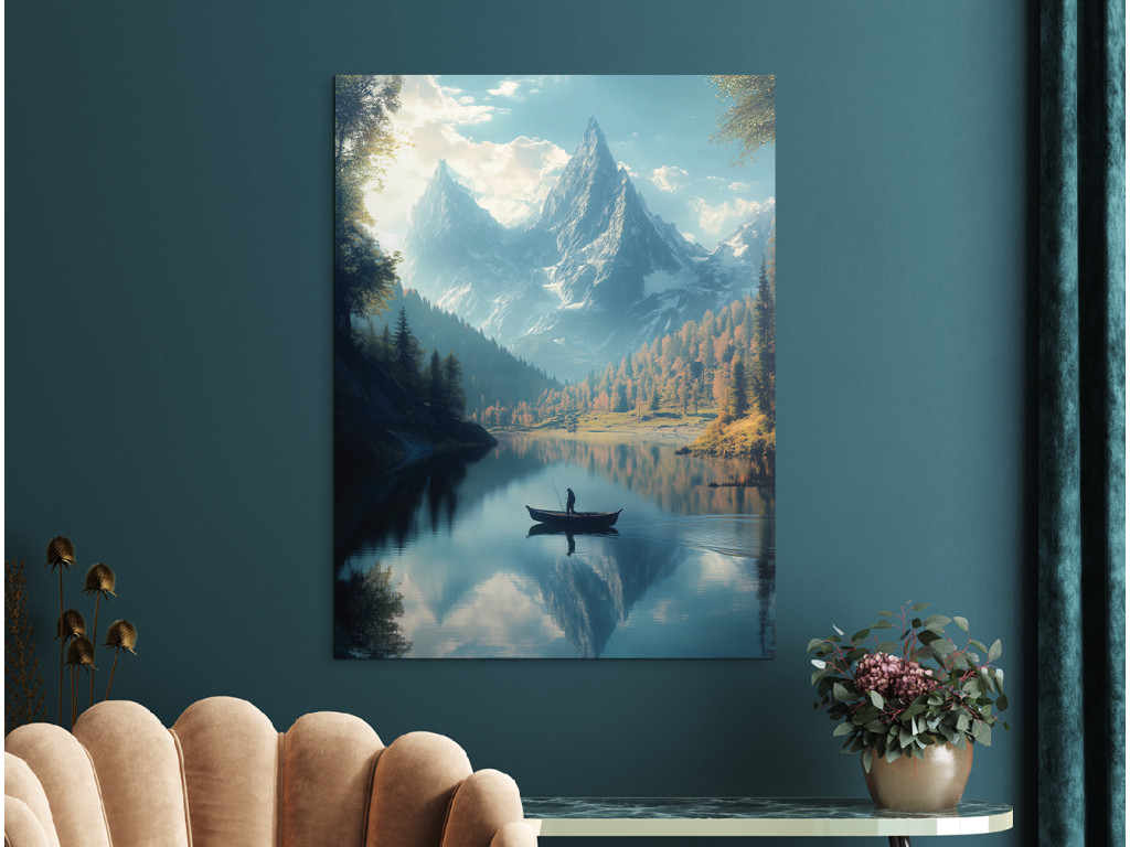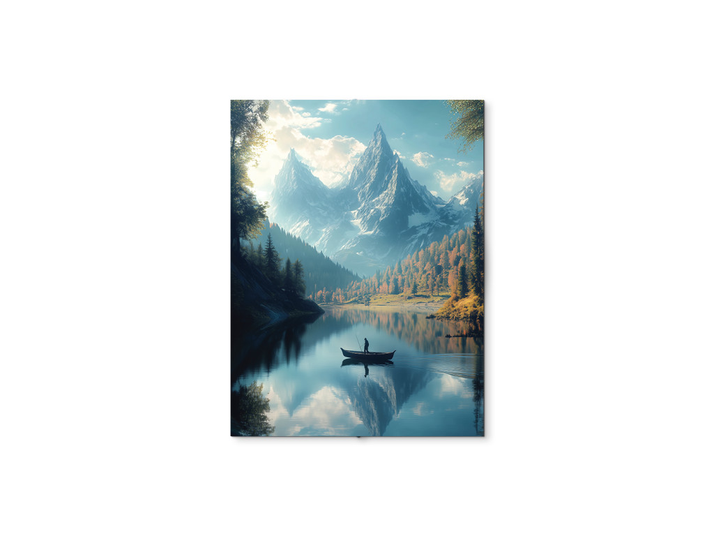 Das Bild zeigt eine malerische Berglandschaft mit einem ruhigen See und einem einsamen Boot, das als Symbol für Stille und innere Besinnung wirkt. Die verschneiten Berggipfel spiegeln sich auf der Wasseroberfläche, während die farbenfrohen Herbstbäume der Szene einen warmen, melancholischen Touch verleihen. Das Bild strahlt ein Gefühl der Einsamkeit, Ruhe und Verbundenheit mit der Natur aus.