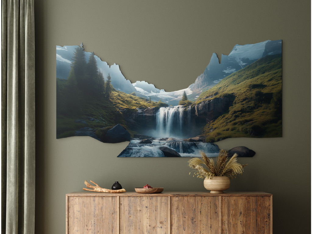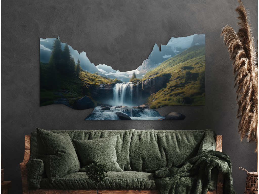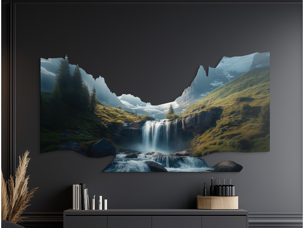 Das Bild zeigt eine malerische Berglandschaft, die von einem mächtigen Wasserfall dominiert wird, der über Felsen in einen ruhigen Fluss stürzt. Der Wasserfall ist umgeben von einem dichten Nadelwald und hohen Bergen im Hintergrund, die in sanften Nebel gehüllt sind. Die gesamte Szene wirkt ruhig und majestätisch und betont die Kraft der Natur und die Harmonie der Landschaft.