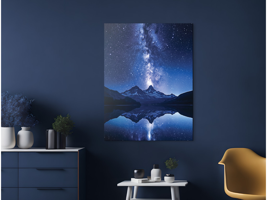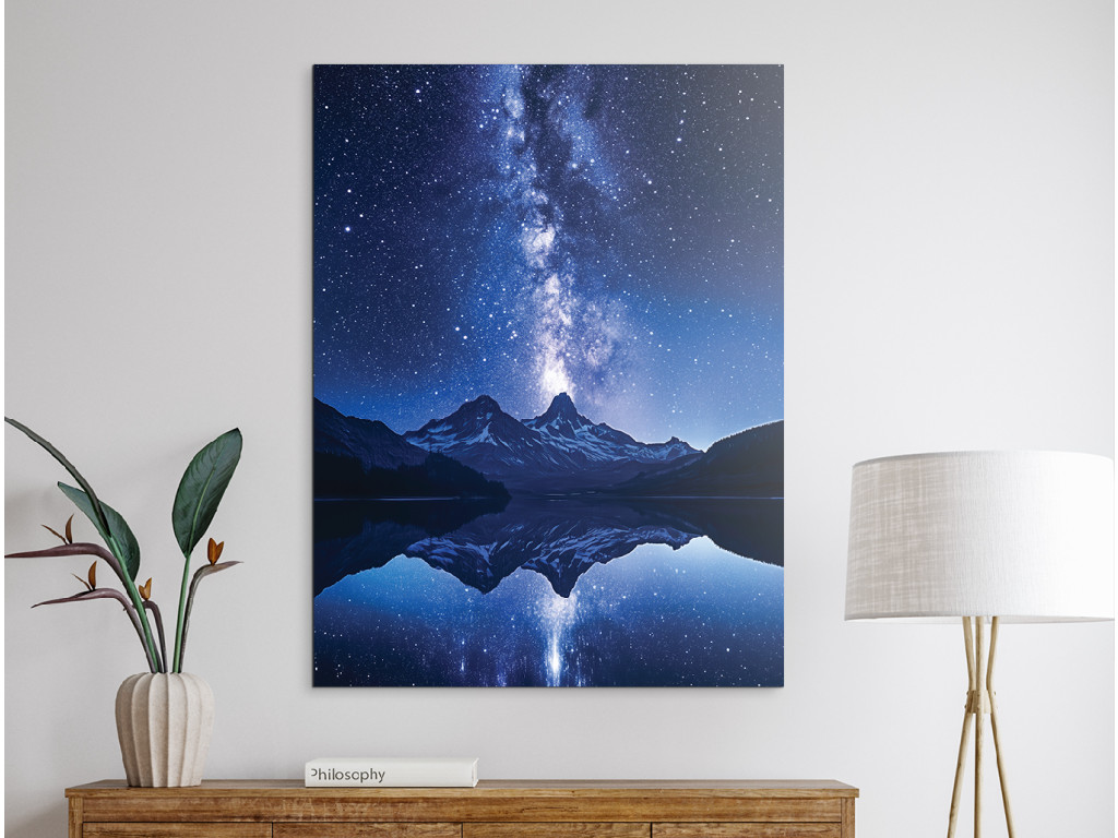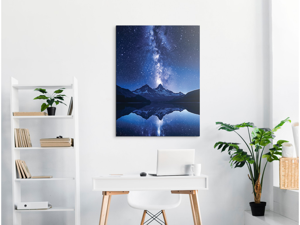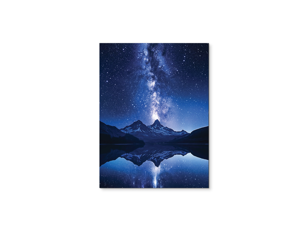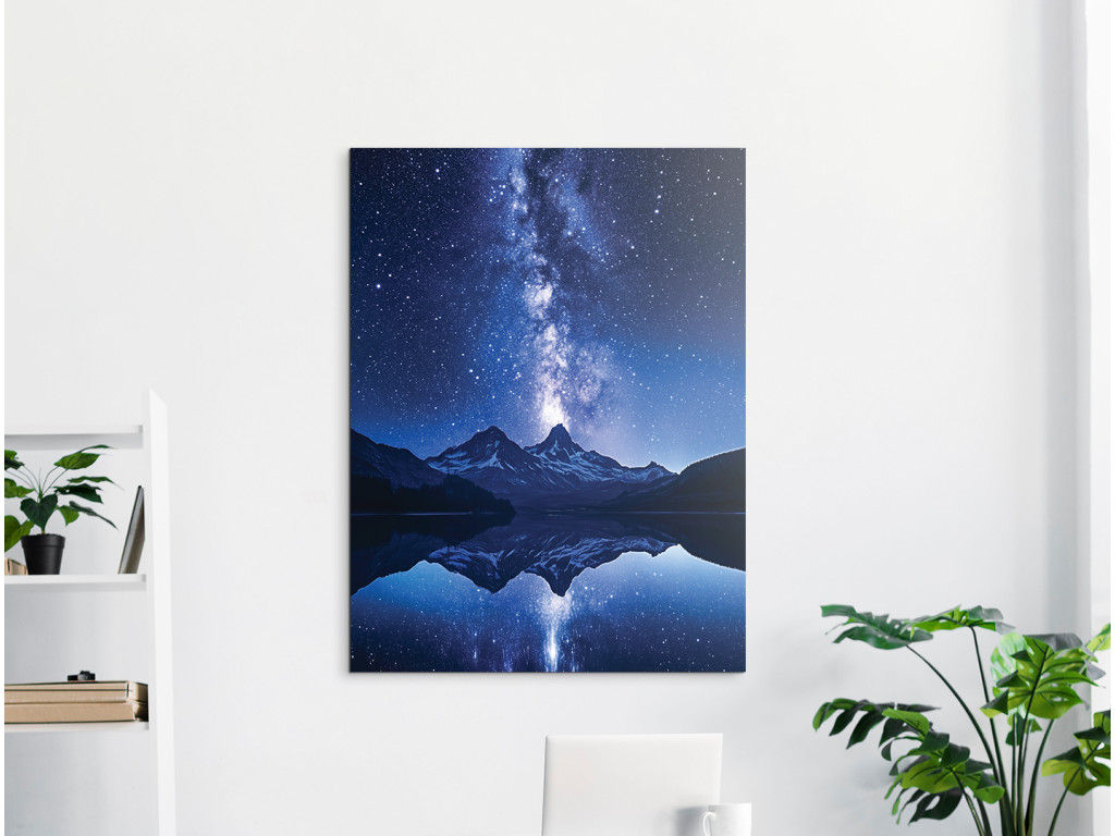 Das Bild fängt einen faszinierenden Blick auf die Milchstraße ein, die sich über den majestätischen Berghorizont erstreckt und sich in der Oberfläche eines stillen Sees spiegelt. Das Bild besticht durch die Harmonie zwischen Himmel und Erde und schafft eine traumhafte und meditative Atmosphäre unter dem Nachthimmel.