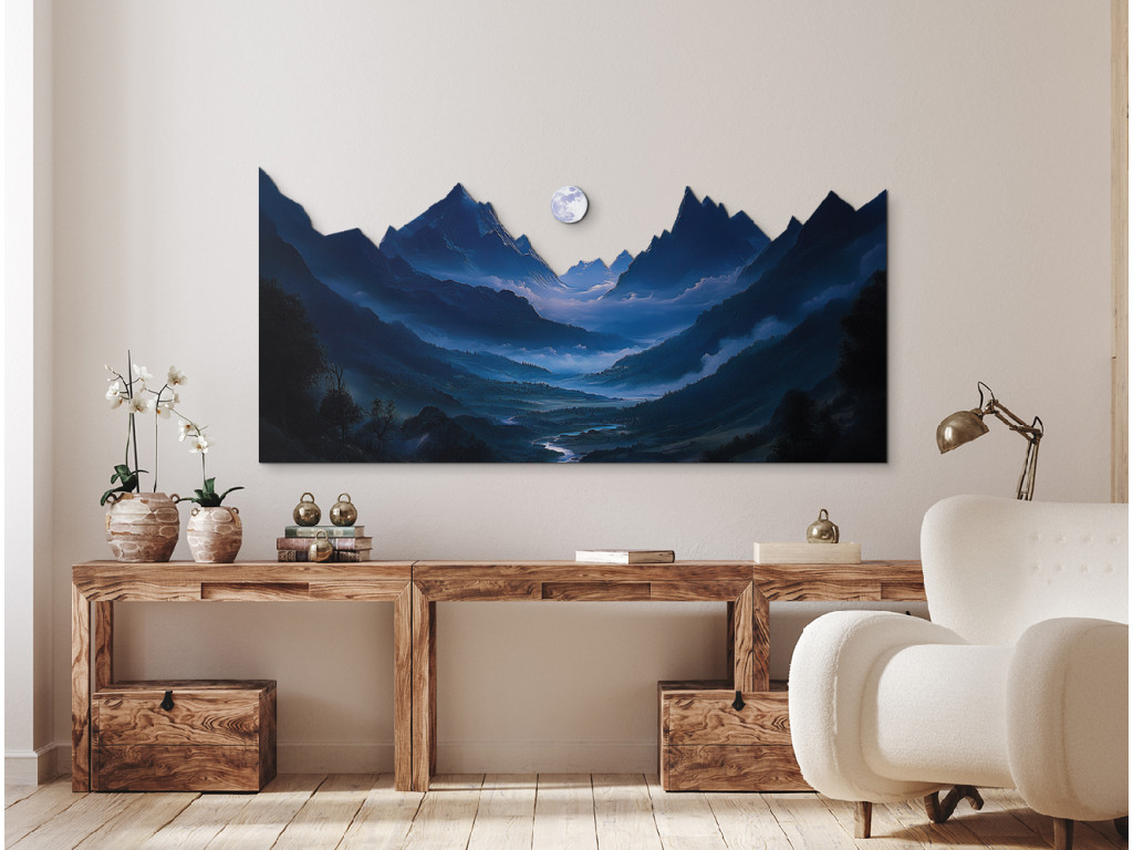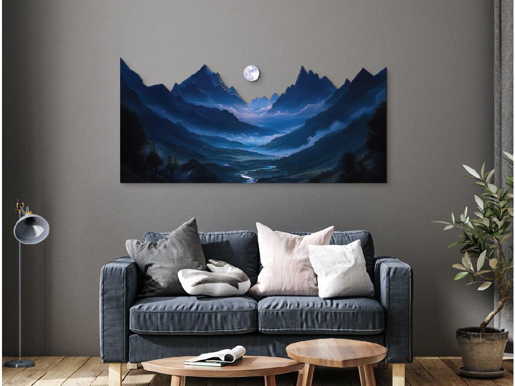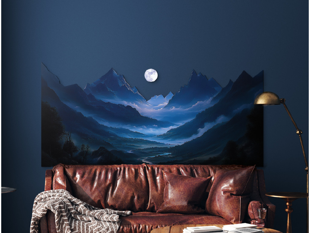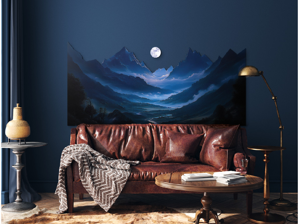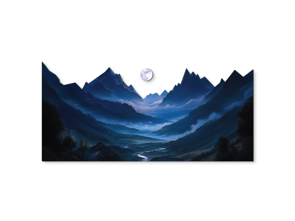 Das Bild zeigt eine geheimnisvolle Nachtszene, in der der helle Mond einen scharfen Bergkamm beleuchtet und sanfte Schatten in das Tal mit dem Fluss wirft. Die Szene ist in dunkelblauen und violetten Tönen gehalten, die das Gefühl der ruhigen Einsamkeit und Stille der Natur verstärken. Der sanfte Nebel im Hintergrund verleiht dem Werk eine traumhafte Tiefe und eine meditative Atmosphäre.