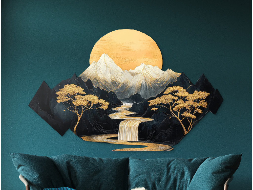 Das minimalistische Kunstwerk zeigt eine ruhige Landschaft mit Bergen, einem Fluss und einem Wasserfall, ergänzt durch eine große goldene Sonne oder einen Mond. Die stilisierte Komposition in dunklen und goldenen Tönen wirkt harmonisch und ausgewogen. Geeignet als moderne Wanddekoration, die Ruhe und Eleganz in den Raum bringt.
