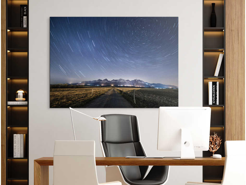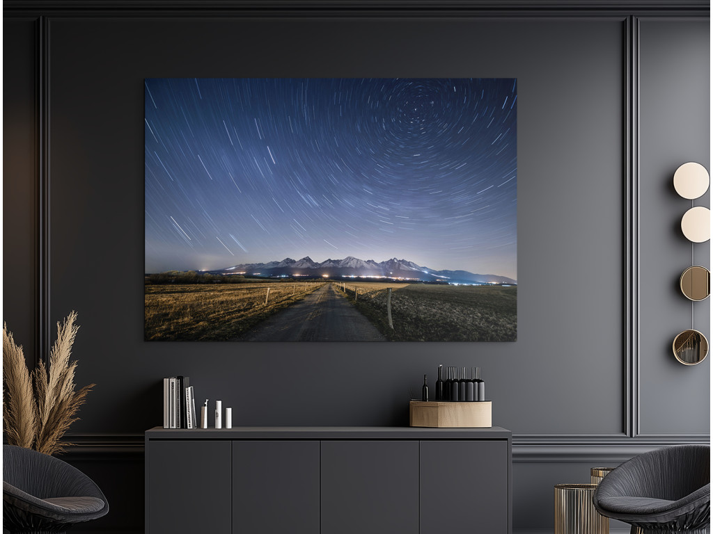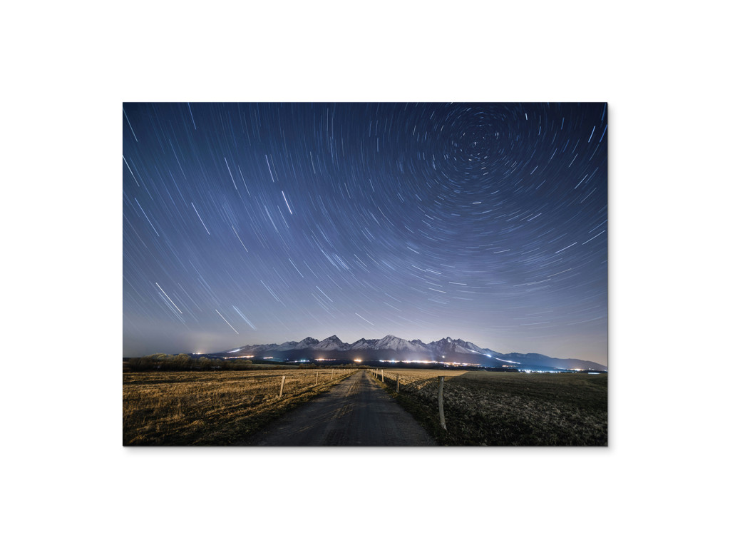 Das Foto zeigt den faszinierenden Nachthimmel mit Sternen über der Tatra. Die lange Belichtungszeit vermittelt den Eindruck, als würden sich die Sterne um einen Punkt – den Polarstern – drehen, während der ruhige Weg im Vordergrund zu den Gipfeln führt. Der Kontrast zwischen dem leuchtenden Himmel und der dunklen Silhouette der Berge unterstreicht die stille Erhabenheit der nächtlichen Natur.