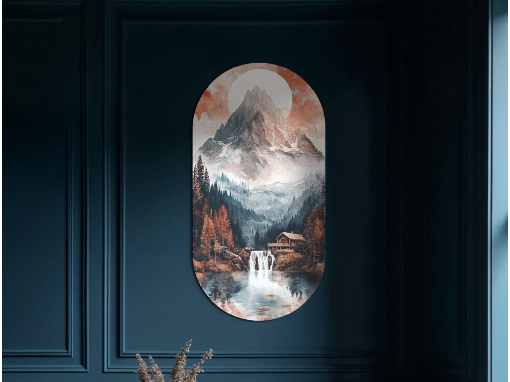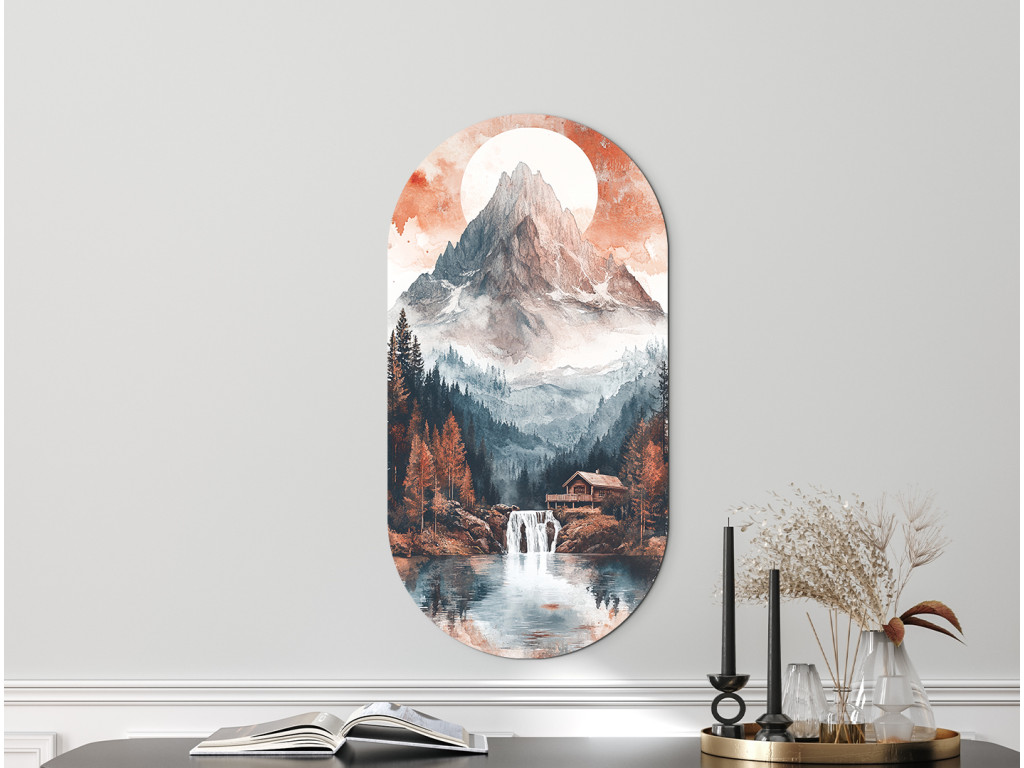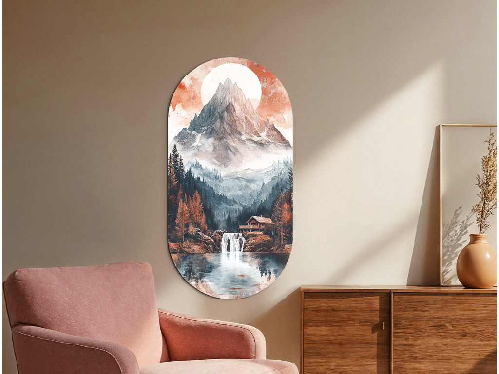 Das ovale Bild Stille unter dem Gipfel zeigt einen majestätischen, nebelverhangenen Berggipfel, über dem die Sonne oder der Mond in rötlichen Tönen strahlt. Im Vordergrund erstreckt sich ein See mit einem Wasserfall, umgeben von einem dichten Wald, in dem sich Herbstfarben mit Nadelbaumgrün vermischen. Eine kleine Holzhütte am Wasser verleiht der gesamten Szene ein Gefühl der Ruhe, Abgeschiedenheit und tiefer Verbundenheit mit der Natur.