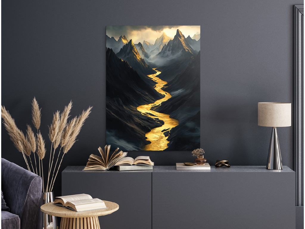 Das Bild zeigt eine dunkle Berglandschaft, durchzogen von einem leuchtend goldenen Fluss, der sich wie Licht im Schatten durch ein tiefes Tal schlängelt. Scharfe und geheimnisvolle Berggipfel ragen aus dem Nebel hervor und unterstreichen die dramatische Atmosphäre des Ganzen. Der Kontrast zwischen den dunklen Tönen und der leuchtend goldenen Farbe erzeugt einen starken visuellen und emotionalen Eindruck.