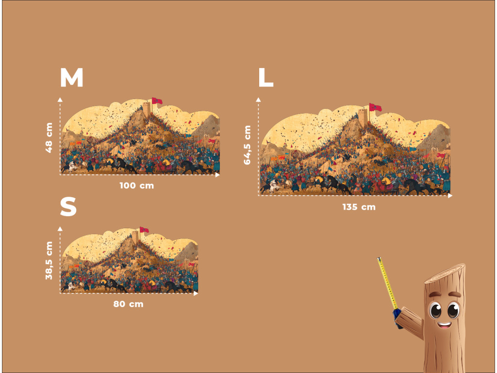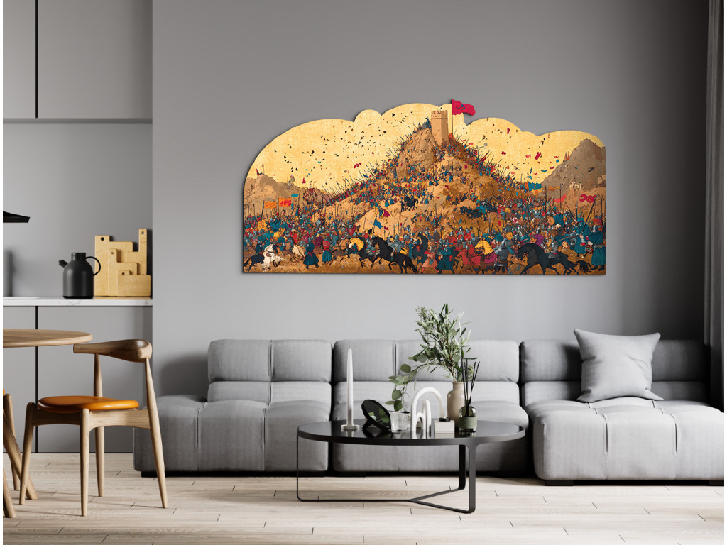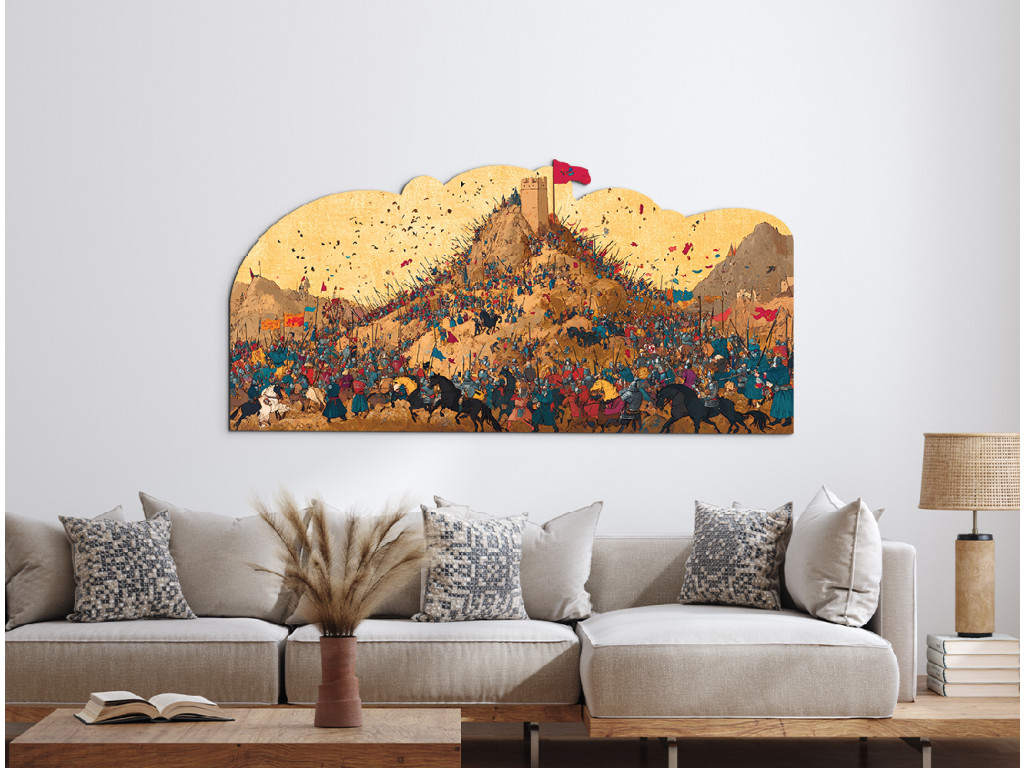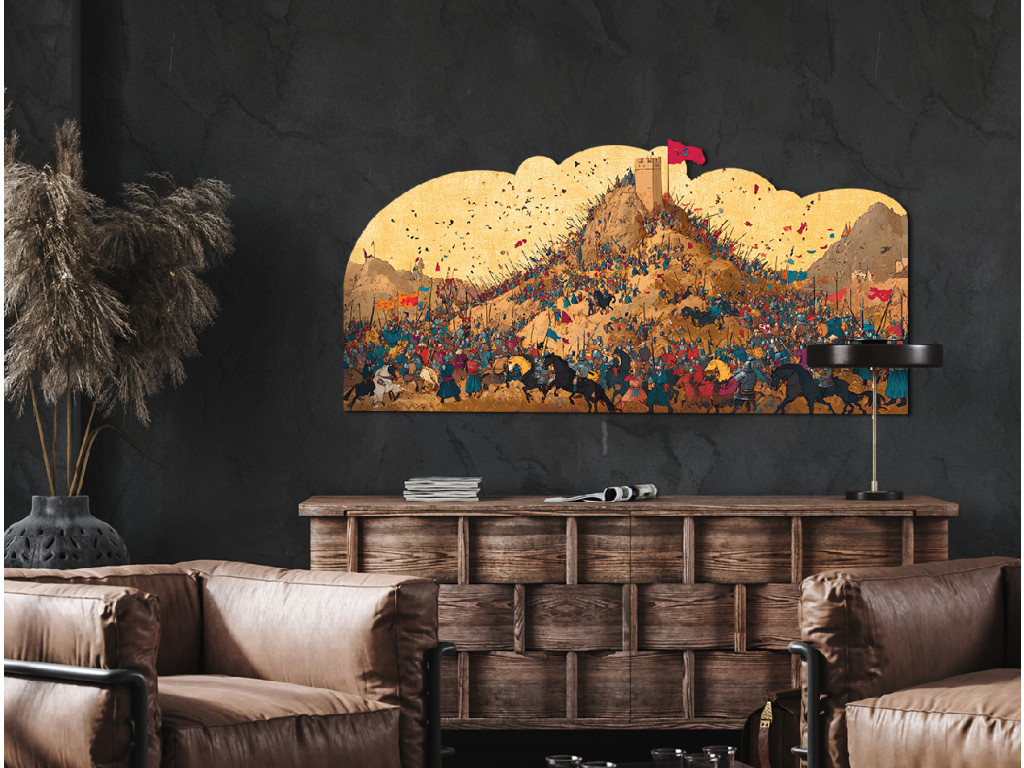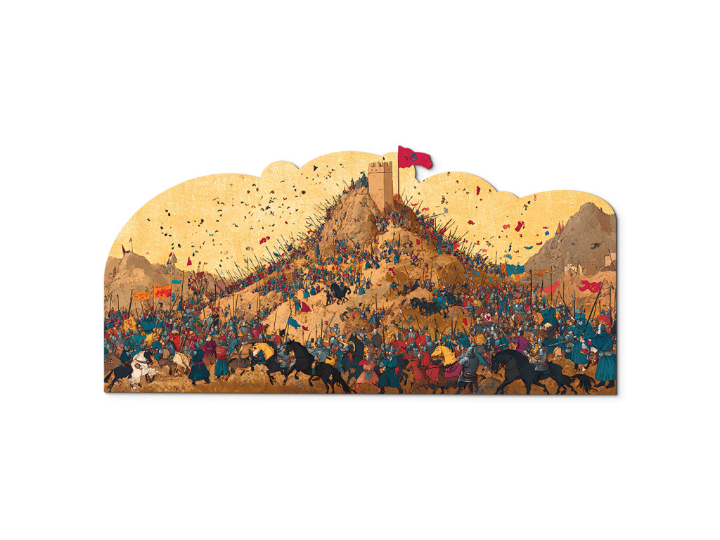 Die dynamische Illustration im unregelmäßigen Format zeigt die Szene einer historischen Schlacht oder Belagerung einer Burg, die sich auf einem Hügel erhebt. Die Befestigungsanlagen mit Flaggen, Dutzende von Figuren und Pferden bilden eine dramatische Komposition voller Bewegung, Spannung und zeitgenössischer Atmosphäre. Die unregelmäßige Form des Bildes unterstreicht die Szene wie einen Ausschnitt aus der Geschichte – ein Fragment einer großen Geschichte von Mut, Kampf und einer verlorenen Ära.