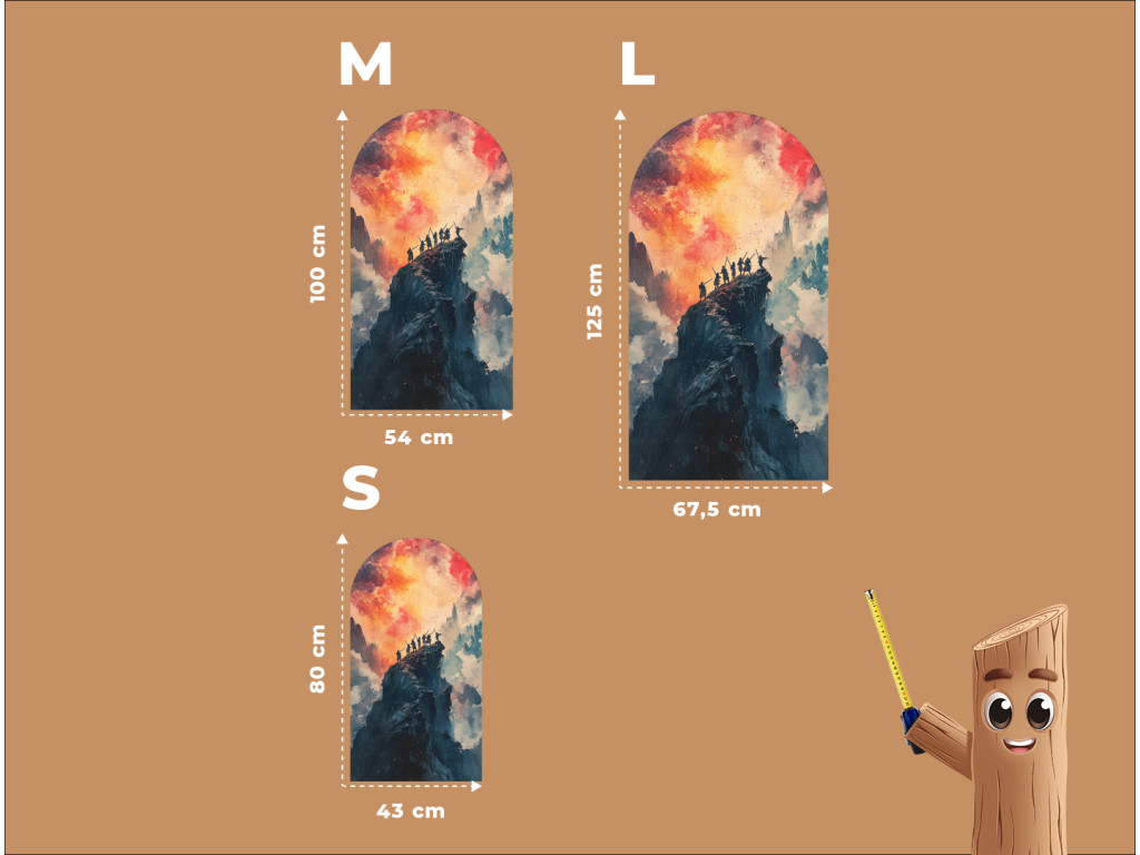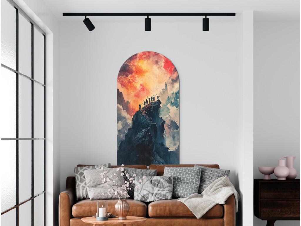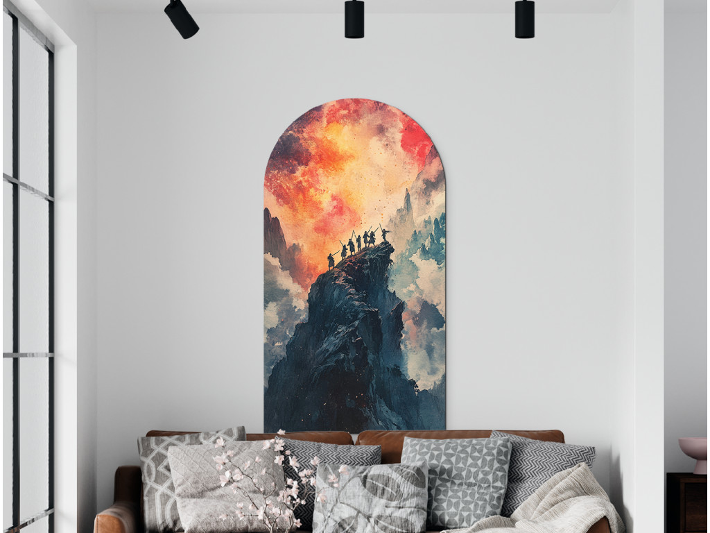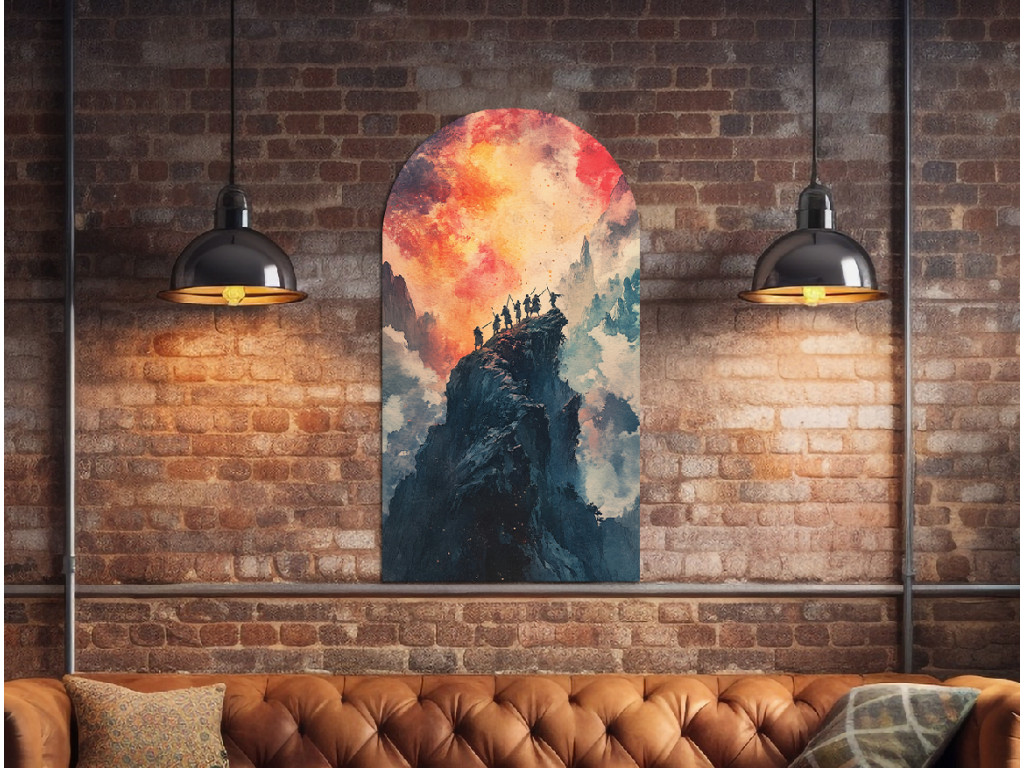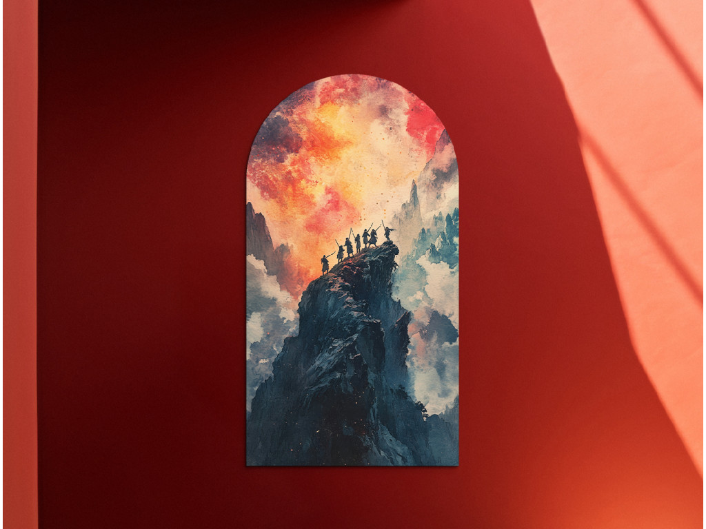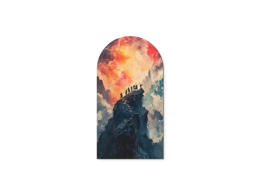 Die dramatische Illustration zeigt eine Gruppe von Figuren, die auf einer steilen Klippe stehen, untermalt von einem rot-orangefarbenen Himmel, der an einen Sonnenuntergang, einen Sonnenaufgang oder ein übernatürliches Phänomen erinnert. Das Gemälde kombiniert eine realistische Darstellung der Berge mit einer abstrakten Darstellung des Himmels und des Nebels, was ihm eine fantasievolle Atmosphäre verleiht.