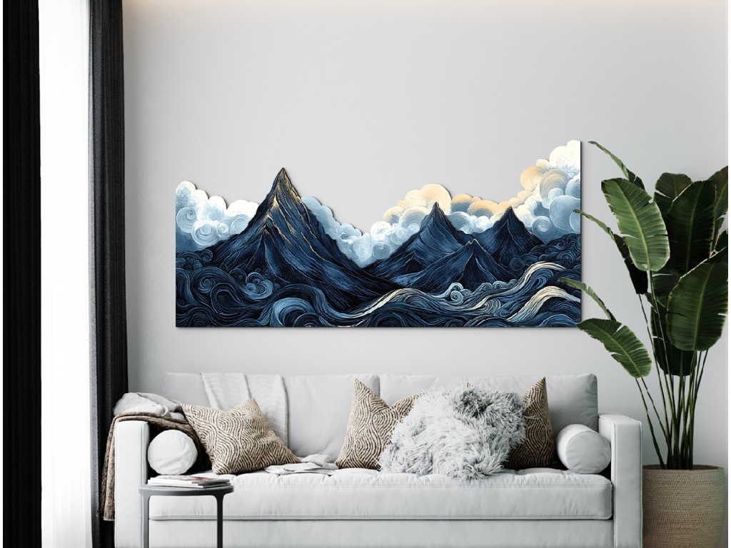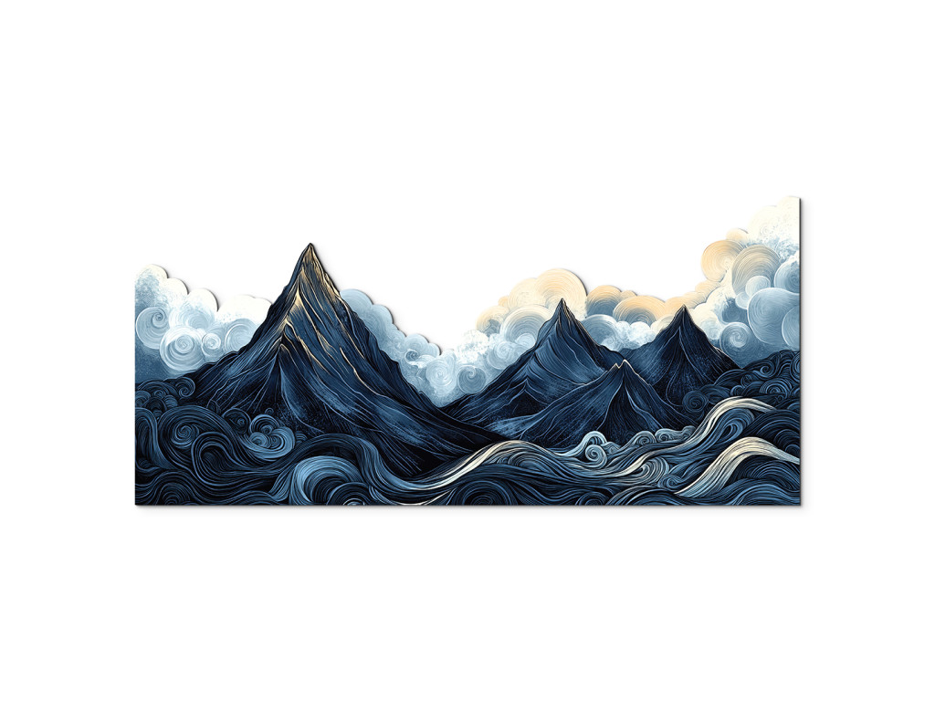 Die stilisierte Landschaft fängt die dramatische Szenerie schroffer, dunkler Berge unter einem schweren, wolkenverhangenen Himmel ein, während die welligen, wirbelnden Gewässer im Vordergrund der Komposition Bewegung und Energie verleihen. Die weichen, abgerundeten Formen der Wolken stehen im Kontrast zu den scharfen Linien der Berge und erzeugen so einen traumhaften, künstlerischen Eindruck. Die dunkelblaue und graue Farbpalette wird durch einen sanften Schimmer gelb-orangefarbenen Lichts auf den Gipfeln belebt – als Zeichen der Hoffnung inmitten des aufziehenden Sturms.