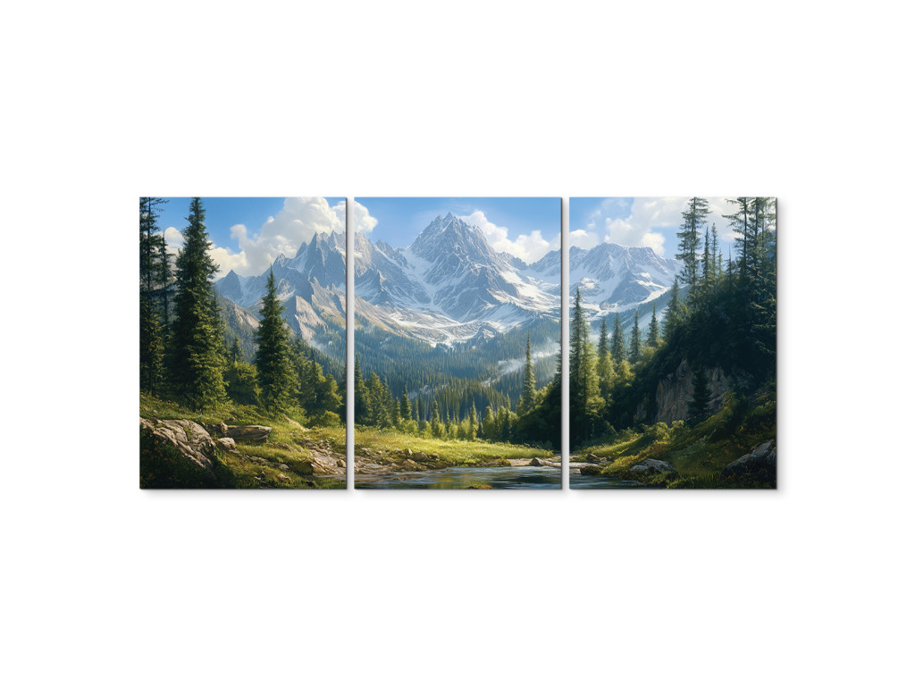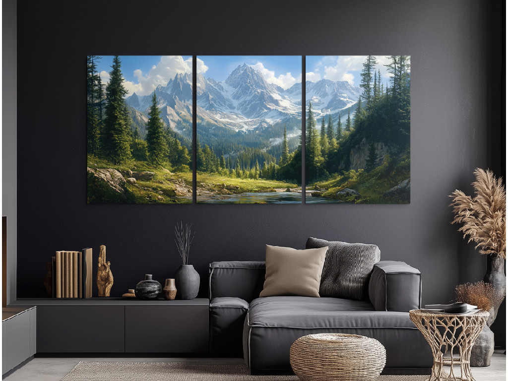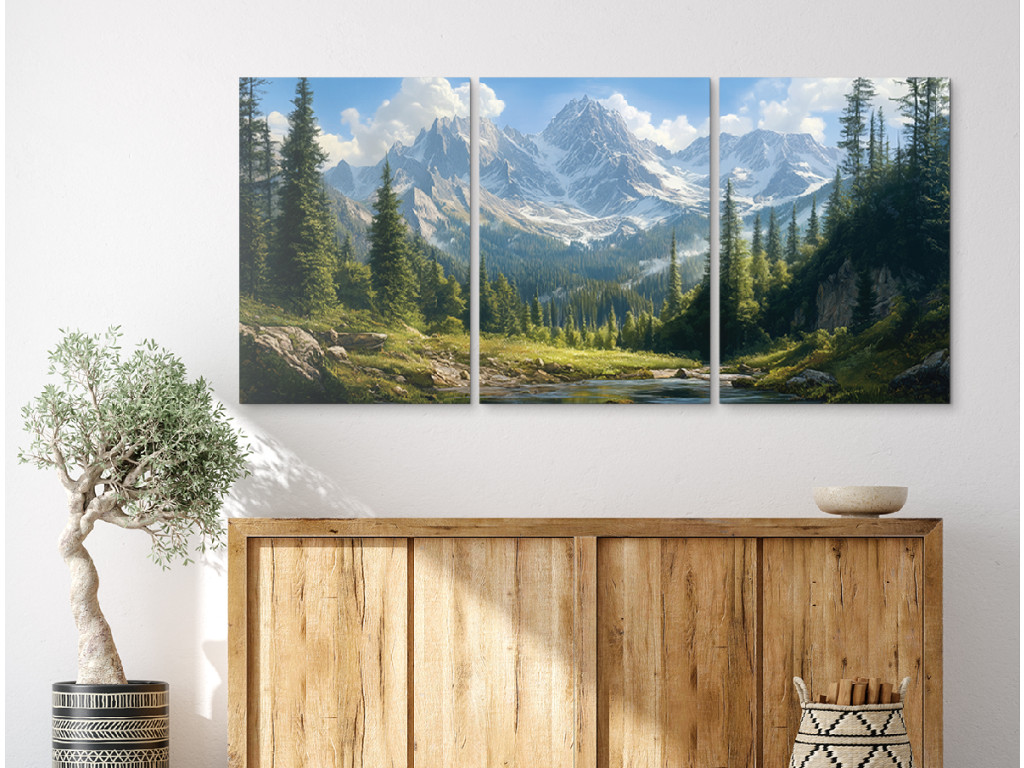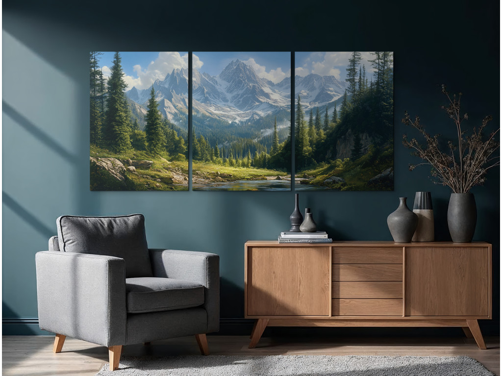 Das elegante dreiteilige Bild zeigt eine ruhige Berglandschaft mit einem See, einem Nadelwald und majestätischen Gipfeln in der Ferne. Die sanfte Farbpalette und die ausgewogene Komposition verleihen dem Innenraum ein Gefühl von Ruhe und Verbundenheit mit der Natur.