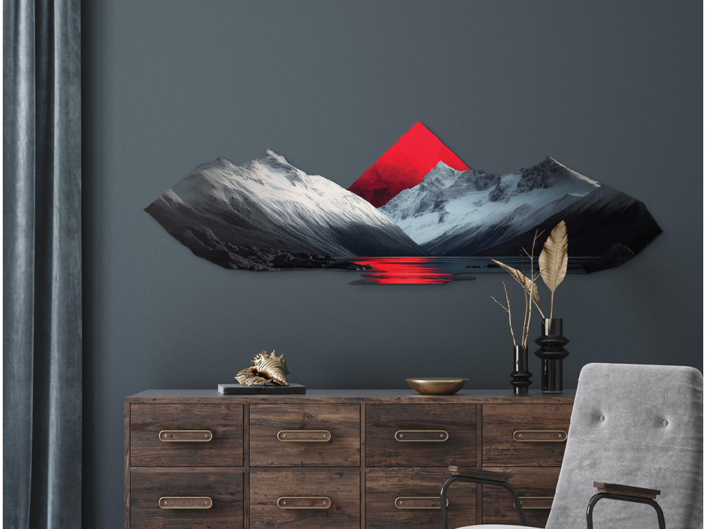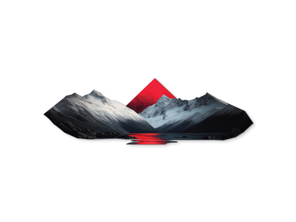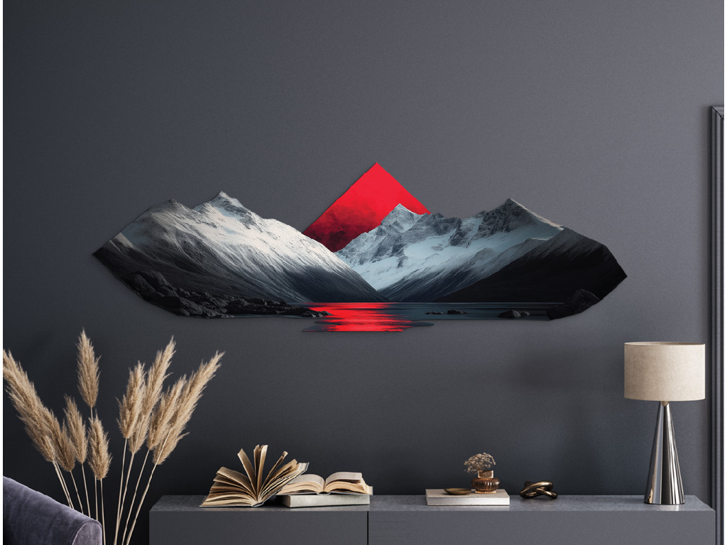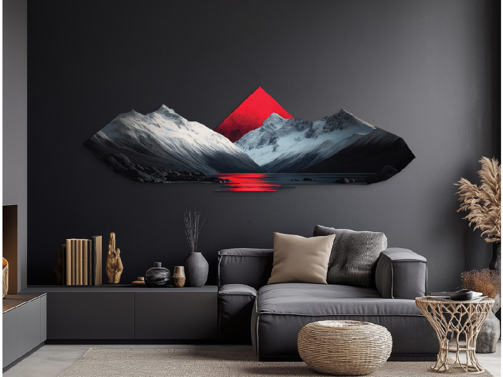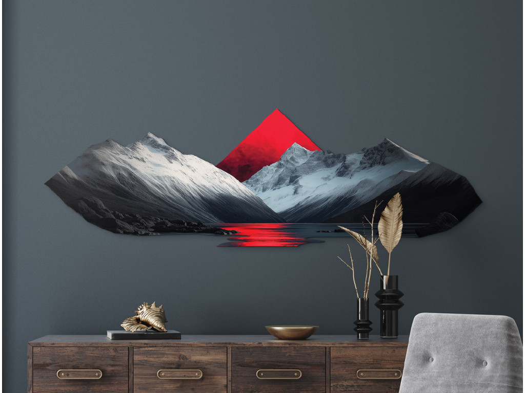 Das Bild verbindet eine realistische Berglandschaft mit schneebedeckten Gipfeln und einer ruhigen Seeoberfläche, die die Umgebung perfekt widerspiegelt. Das dominante rote Dreieck im Hintergrund bringt einen abstrakten Kontrast in die Szene und sorgt für visuelle Spannung. Diese Kombination aus Natur und Geometrie schafft eine harmonische und zugleich moderne Komposition, die sich gut in stilvolle Innenräume einfügt.