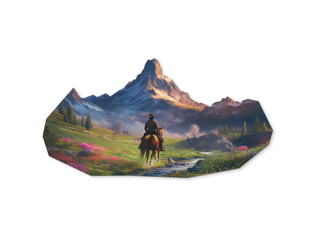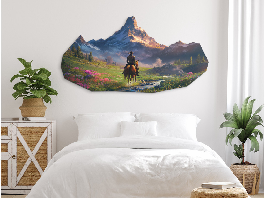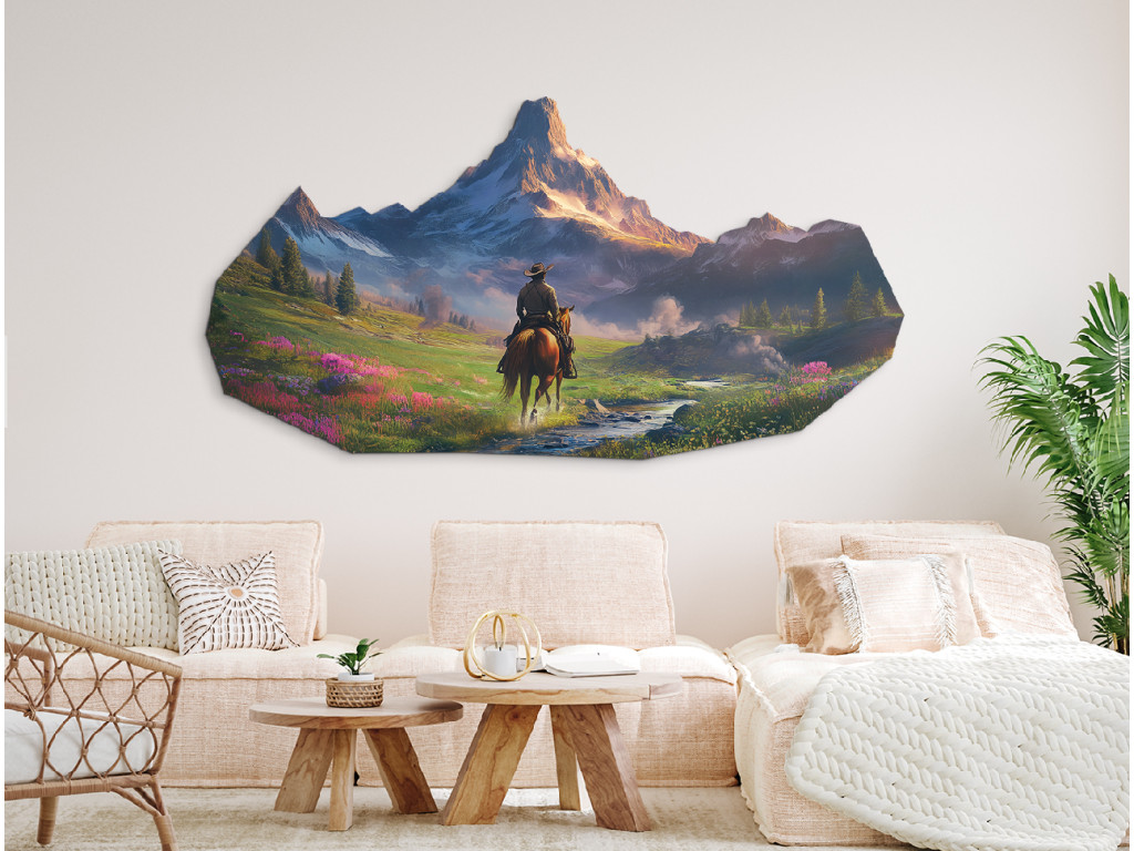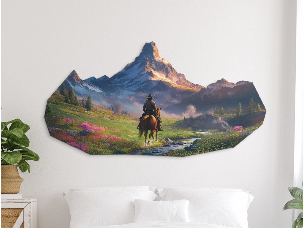 Das stilvolle Bild mit Westernmotiv zeigt einen Cowboy auf einem Pferd, der entlang eines Baches in einem malerischen Tal unter einem majestätischen Berg reitet. Satte Grüntöne, rosa Blumen und Bäume schaffen eine ruhige Atmosphäre und verleihen dem Raum einen Hauch von Freiheit und wilder Natur des amerikanischen Westens.