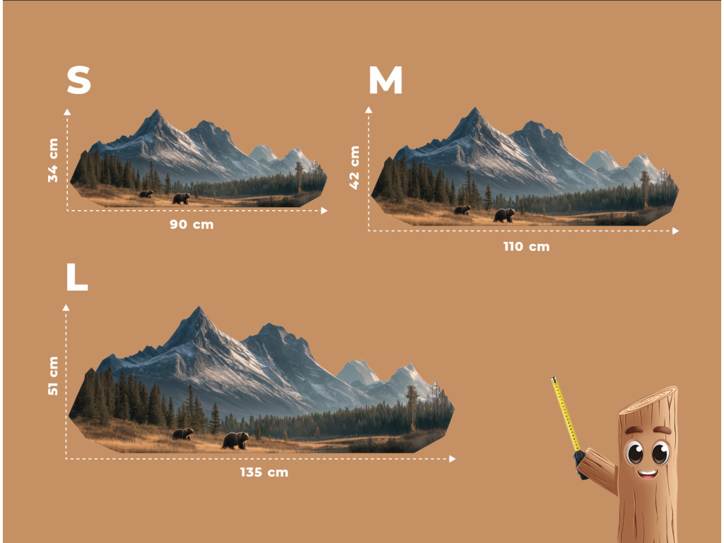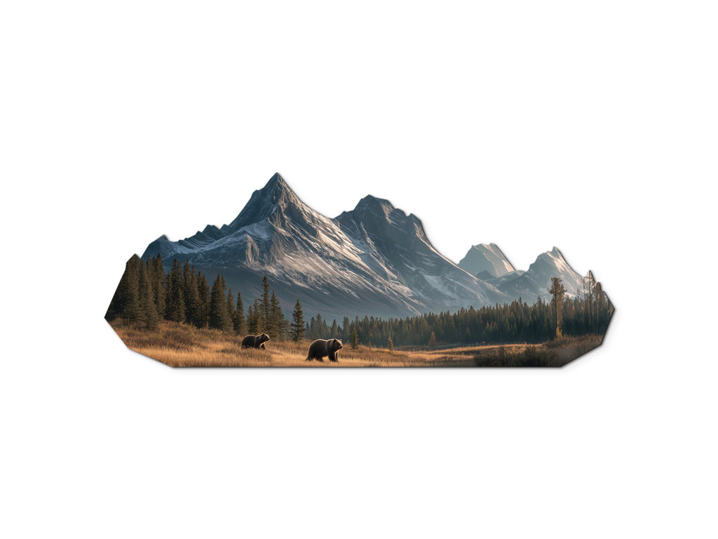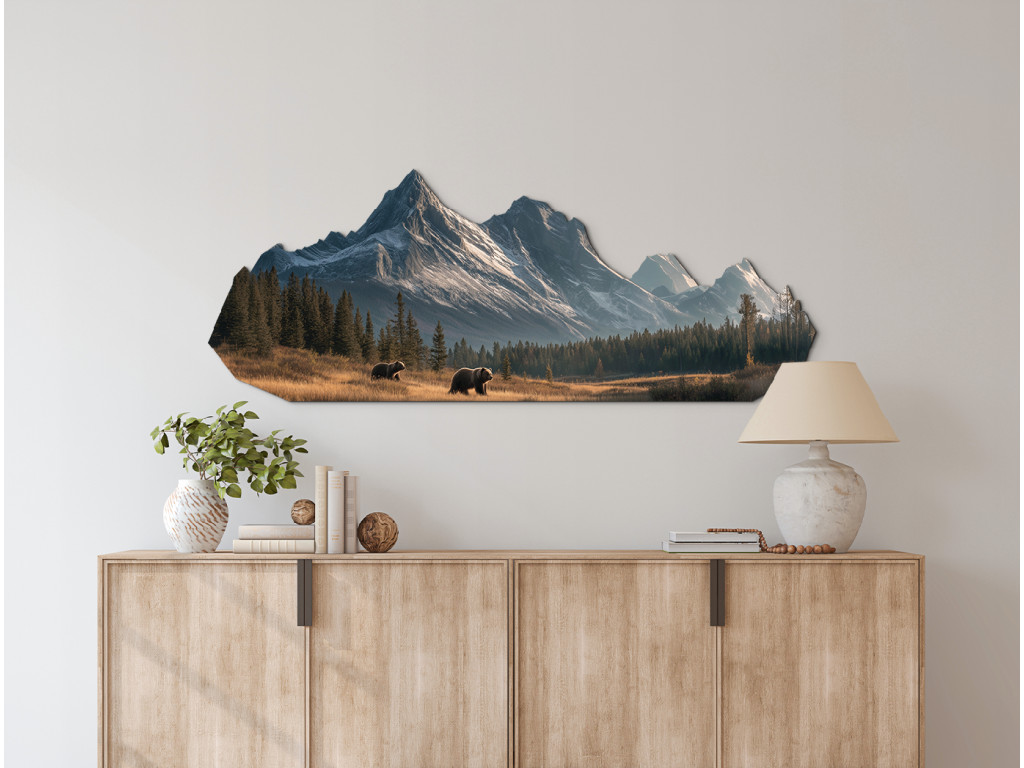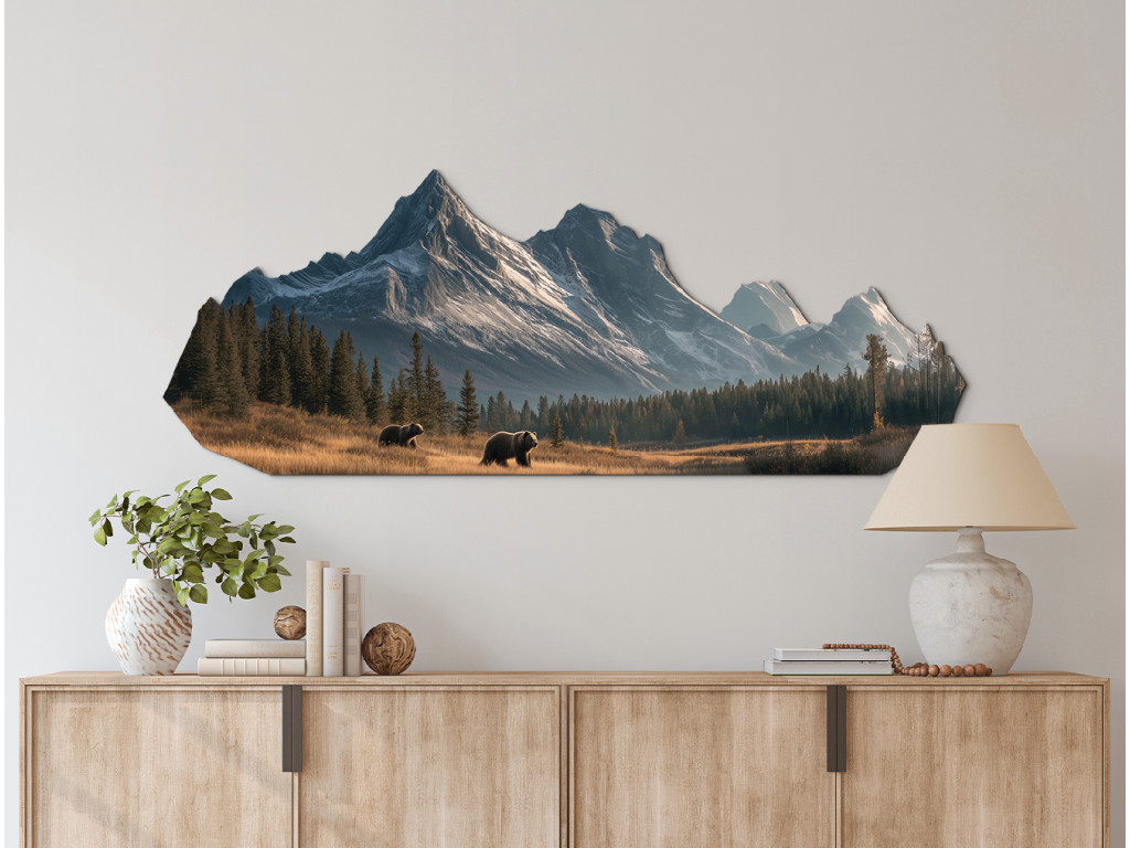 Ein faszinierendes Wandbild mit einer Berglandschaft in unregelmäßiger Form, die die Konturen der verschneiten Gipfel nachzeichnet. Im Vordergrund heben sich Nadelbäume und ein Bärenpaar ab, die der Szene Leben und Tiefe verleihen. Dieses einzigartige Kunstwerk bringt Ruhe, Stärke und einen Hauch von Natur in Ihr Zuhause.