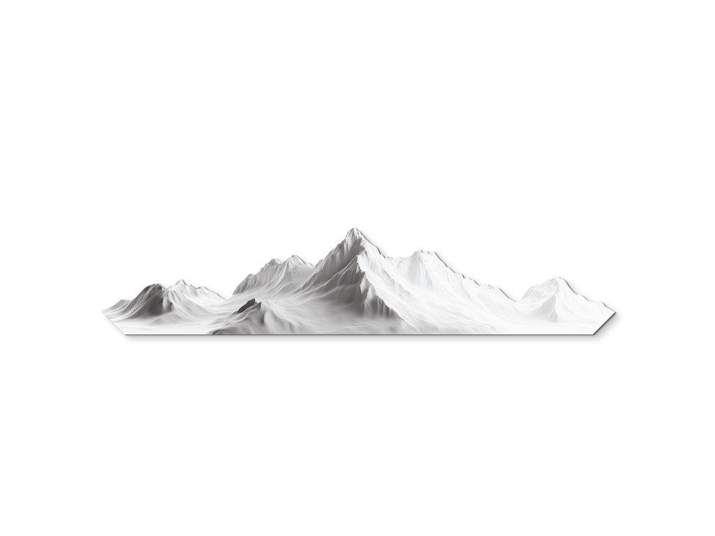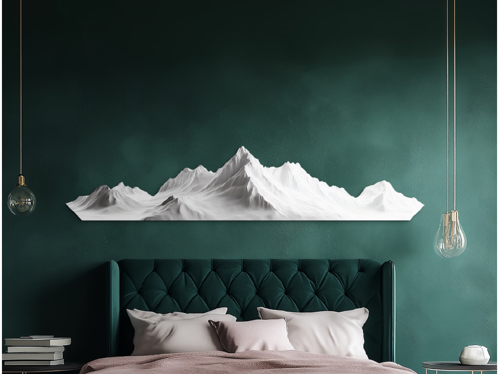 Das elegante Bild mit schneebedeckten Bergen im minimalistischen Stil fängt die Ruhe, Kraft und Erhabenheit der Natur ein. Die sanft modellierten weißen Berggipfel wirken realistisch und bewahren gleichzeitig die Reinheit und Einfachheit der Formen. Dieses Bild symbolisiert Ausgewogenheit, Harmonie und die zeitlose Schönheit der Berge, wodurch es zu einem auffälligen, aber gleichzeitig beruhigenden Element der Inneneinrichtung wird.