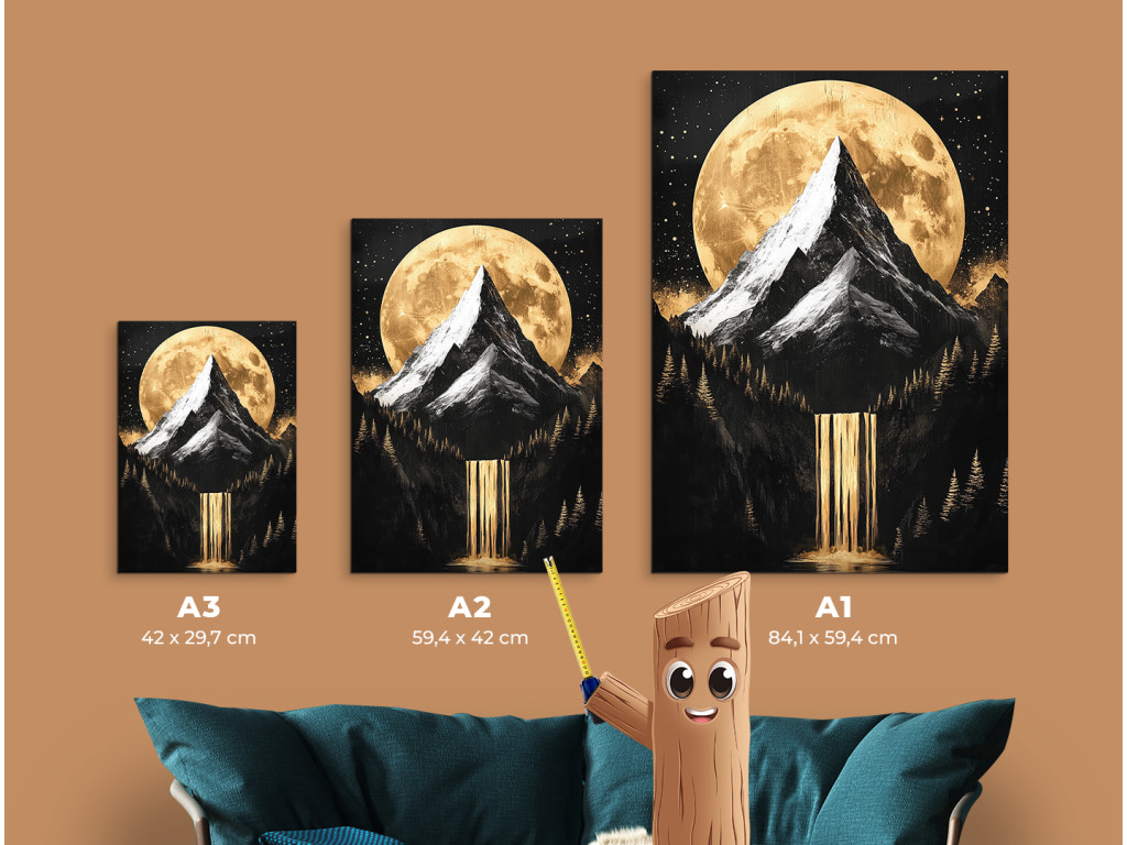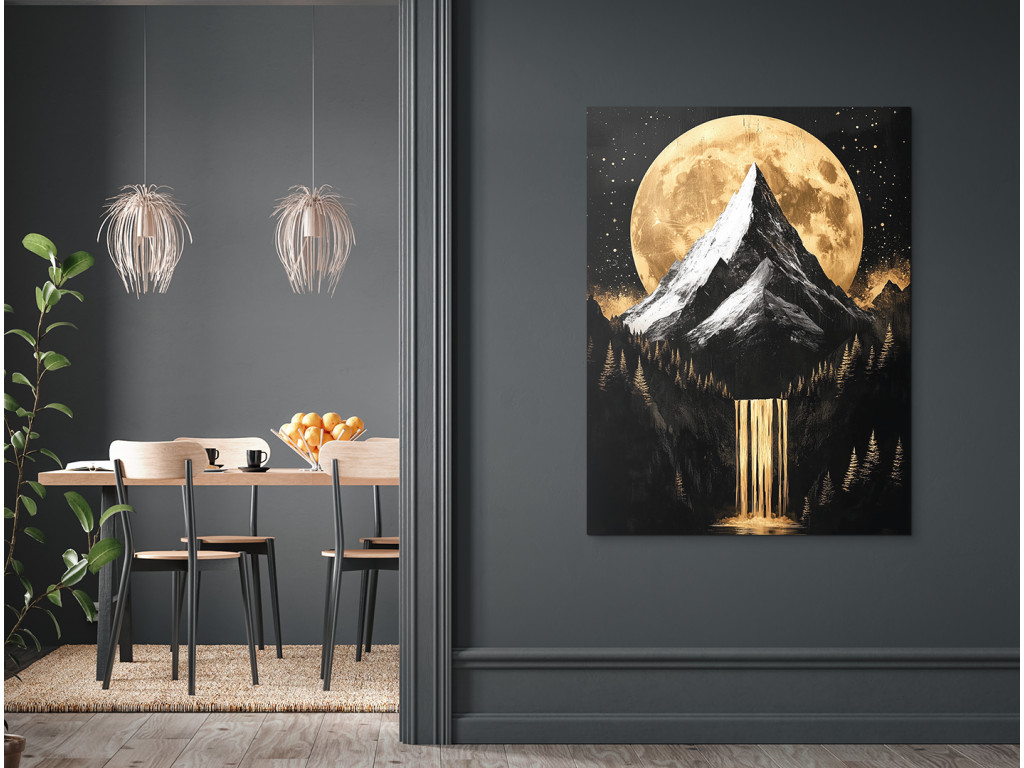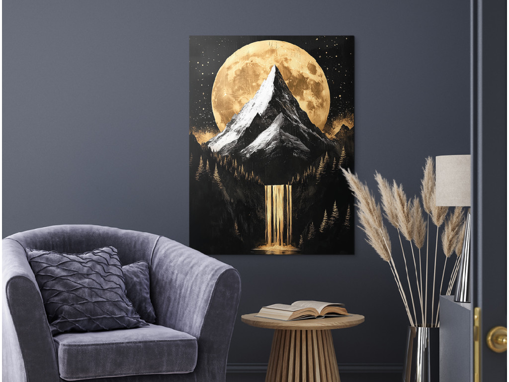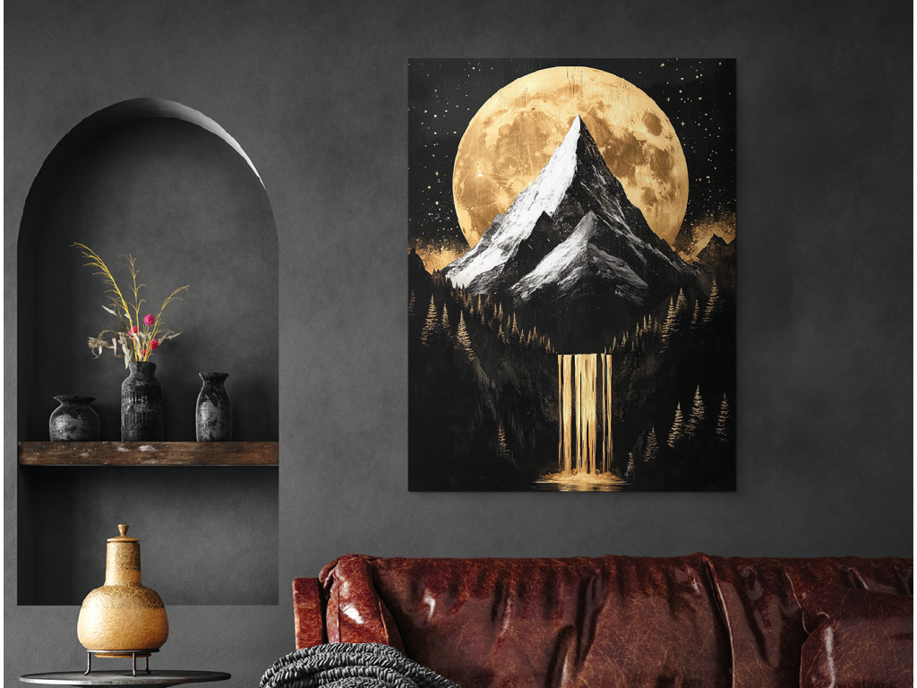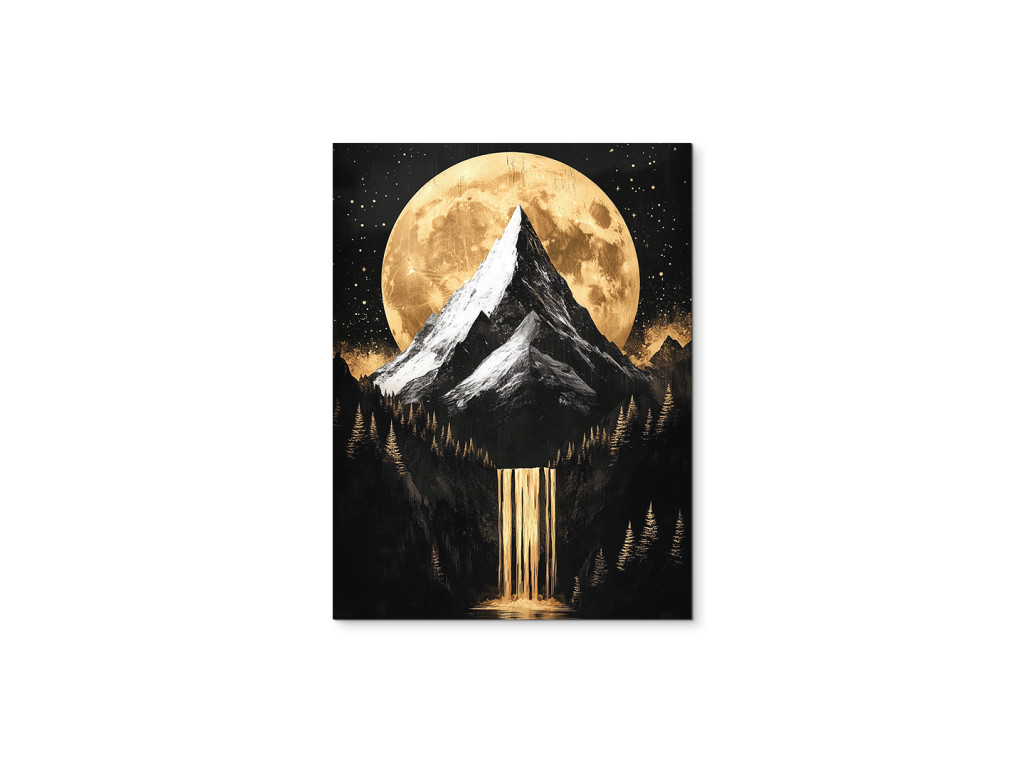 Dieses Bild zeigt eine traumhafte Nachtlandschaft, in der sich ein majestätischer Berg unter einem goldenen Vollmond erhebt. Von den Hängen des Berges fließt ein Wasserfall, der im Mondlicht zu leuchten scheint, und mündet in den stillen Fluss darunter. Die Kombination aus dunklen Wäldern, Sternenhimmel und goldenen Reflexen schafft eine mystische und friedliche Szene.