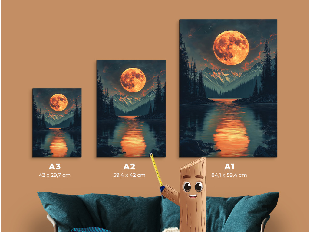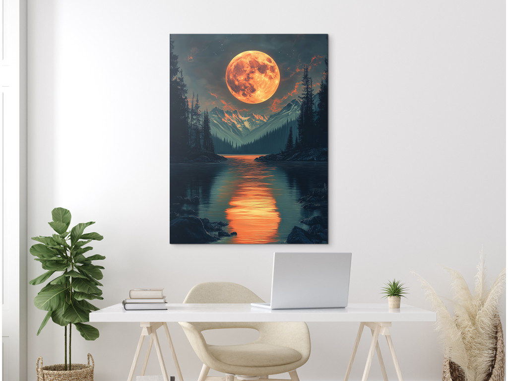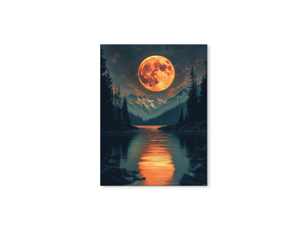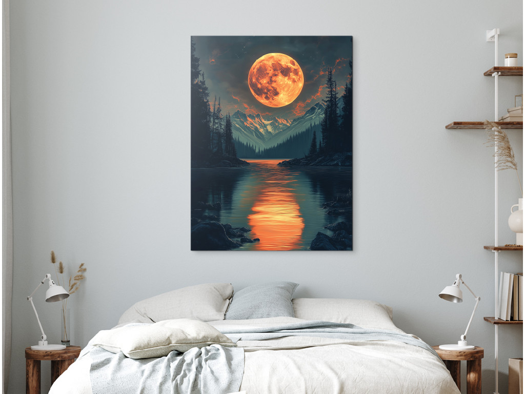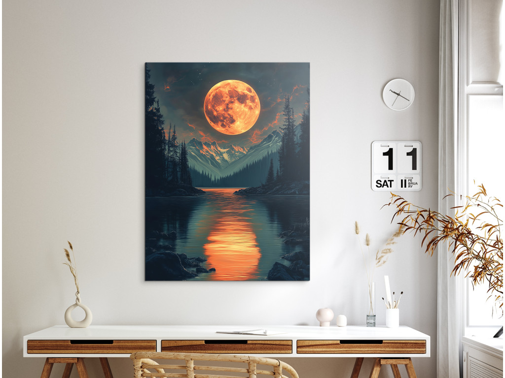 Dieses beeindruckende Bild zeigt einen riesigen orangefarbenen Mond, der majestätisch über einem Gebirgsmassiv hängt und sich auf der Oberfläche eines stillen Sees spiegelt. Der Kontrast zwischen den dunklen Silhouetten der Berge und dem Schein des Mondes schafft eine dramatische, fast traumhafte Atmosphäre. Das Werk eignet sich ideal als dominantes Element für Innenräume, denen es Ruhe, Tiefe und einen Hauch von Geheimnis verleiht.