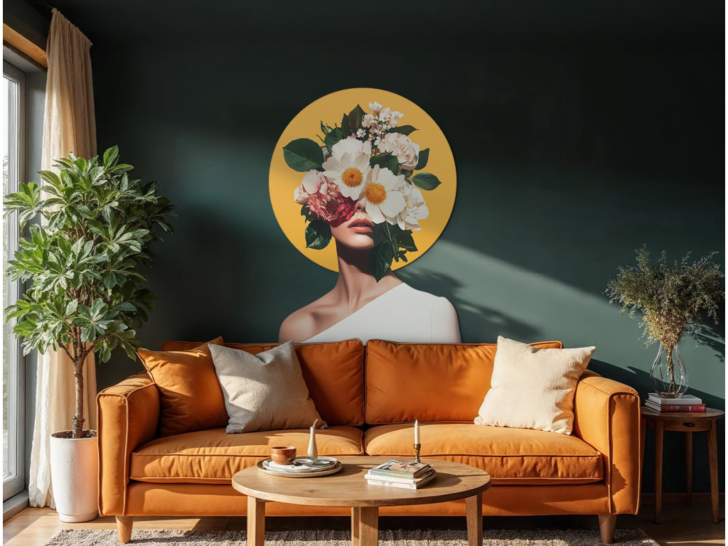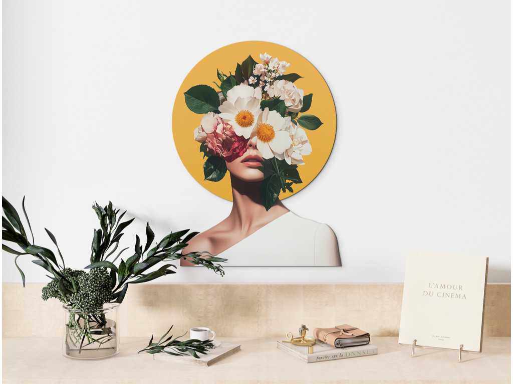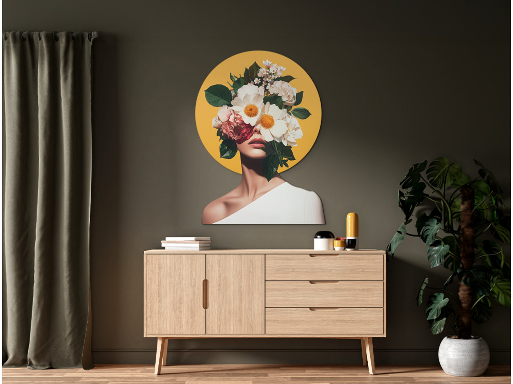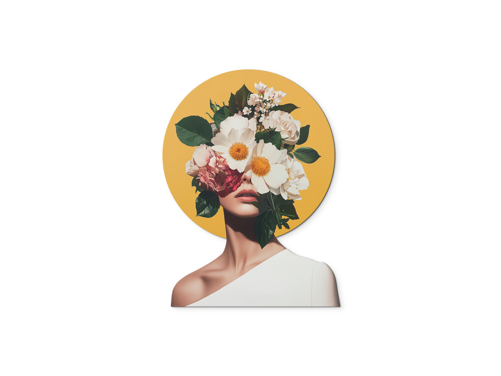 Die weibliche Figur, deren Gesicht hinter einem üppigen Strauß weißer Blumen verborgen ist, wirkt ätherisch und rein, als würde sie mit der Natur verschmelzen. Der gelbe Kreis im Hintergrund vermittelt Wärme, Licht und innere Ruhe, während die neutralen Farbtöne des Kleides und des Hintergrunds die sanfte Kraft der Komposition hervorheben. Die blumige Muse ist eine visuelle Ode an die Stille, die Sensibilität und die Schönheit, die in der Einfachheit verborgen sind.