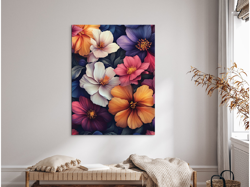 Blumiger Moment ist ein Bild, das einen Ausschnitt eines gemalten Blumenstraußes in satten, lebendigen Farben zeigt – in Violett-, Rosa-, Weiß- und zarten Orangetönen. Der dunkle Hintergrund lässt die leuchtenden Blumen hervorstechen, die wie ein eingefangener Moment voller Leben und Farben wirken. Ideal für Räume, die belebt werden sollen – zum Beispiel für das Wohnzimmer, den Flur oder das kreative Arbeitszimmer.