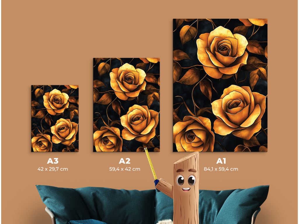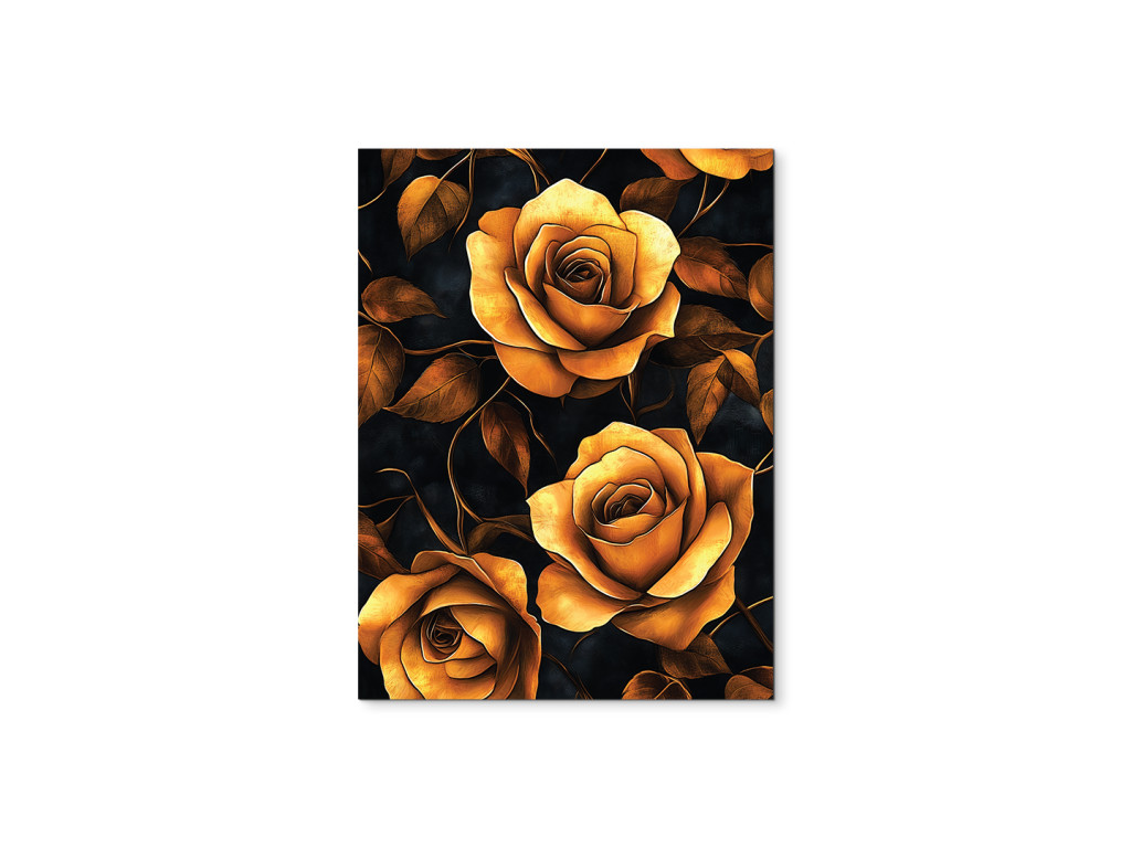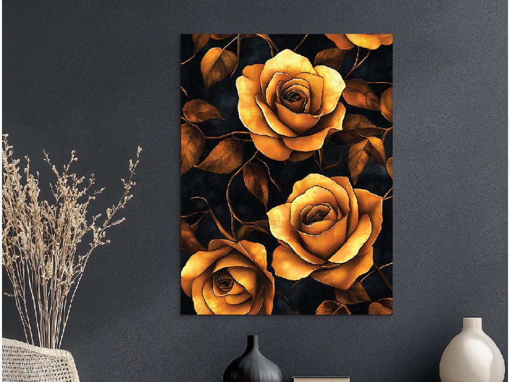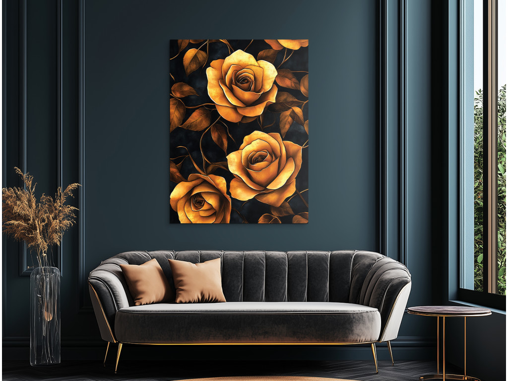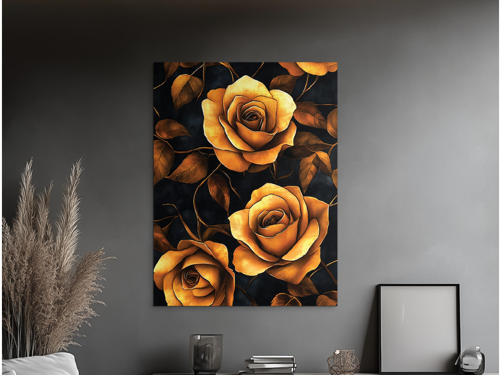 Dreierrose ist ein dekoratives Bild mit starker visueller Wirkung – drei leuchtend orangefarbene Rosen heben sich vom kontrastreichen schwarzen Hintergrund ab und vermitteln einen Eindruck von Tiefe und Intensität. Der dunklere Farbton des Bildes verleiht ihm Eleganz und Dramatik, wodurch es zu einem markanten Element im Raum wird. Es eignet sich hervorragend für die Wand in einem modernen Wohnzimmer, Schlafzimmer oder stilvollen Flur.