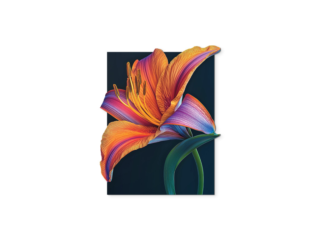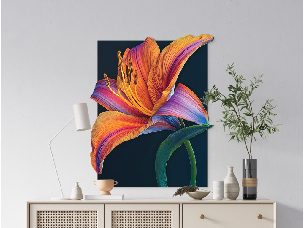 Die künstlerische Darstellung einer orangefarbenen Lilie auf schwarzem Hintergrund erzeugt einen starken visuellen Kontrast, der die Schönheit und Energie der Blume unterstreicht. Die leuchtenden Blütenblätter wirken wie Flammen, die in der Dunkelheit leuchten und Leidenschaft, Kraft und Lebensfreude symbolisieren. Dieses dramatische Motiv ist ein markantes dekoratives Element mit modernem Touch.