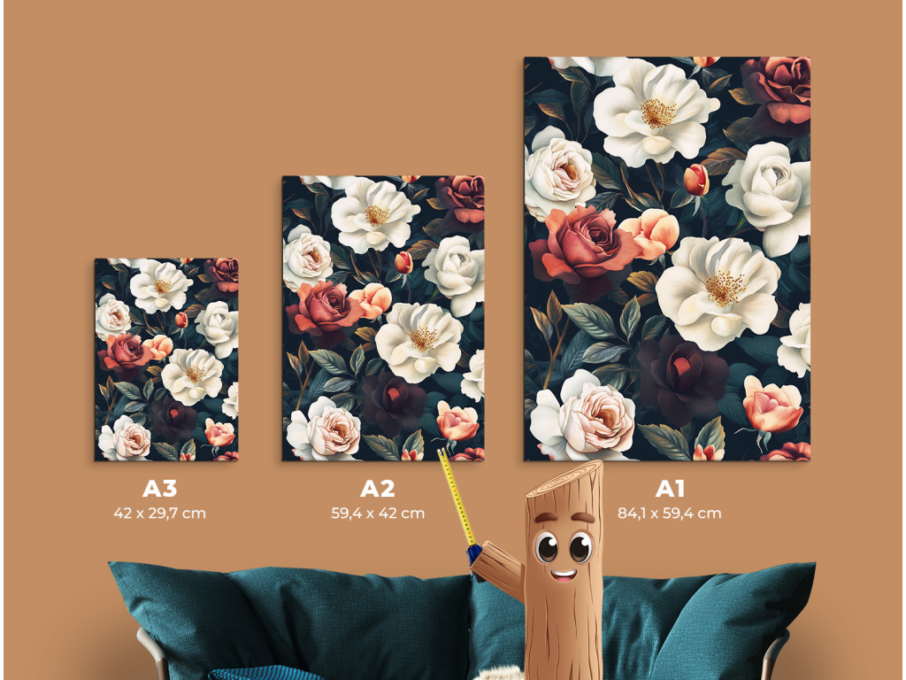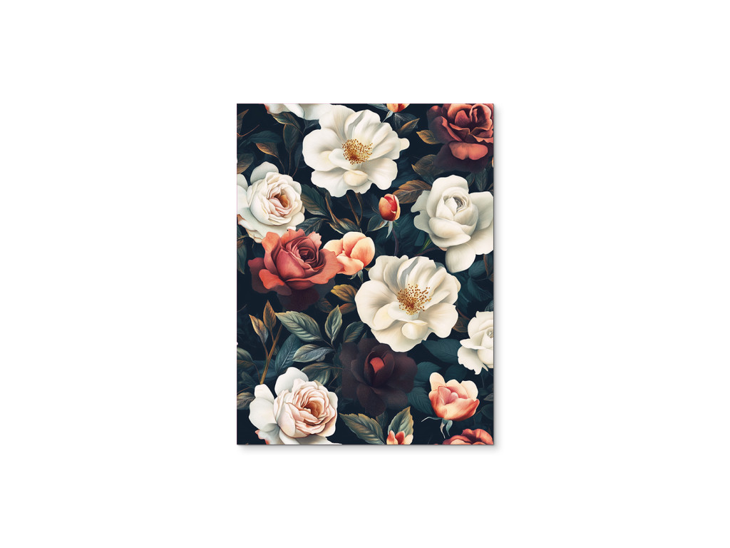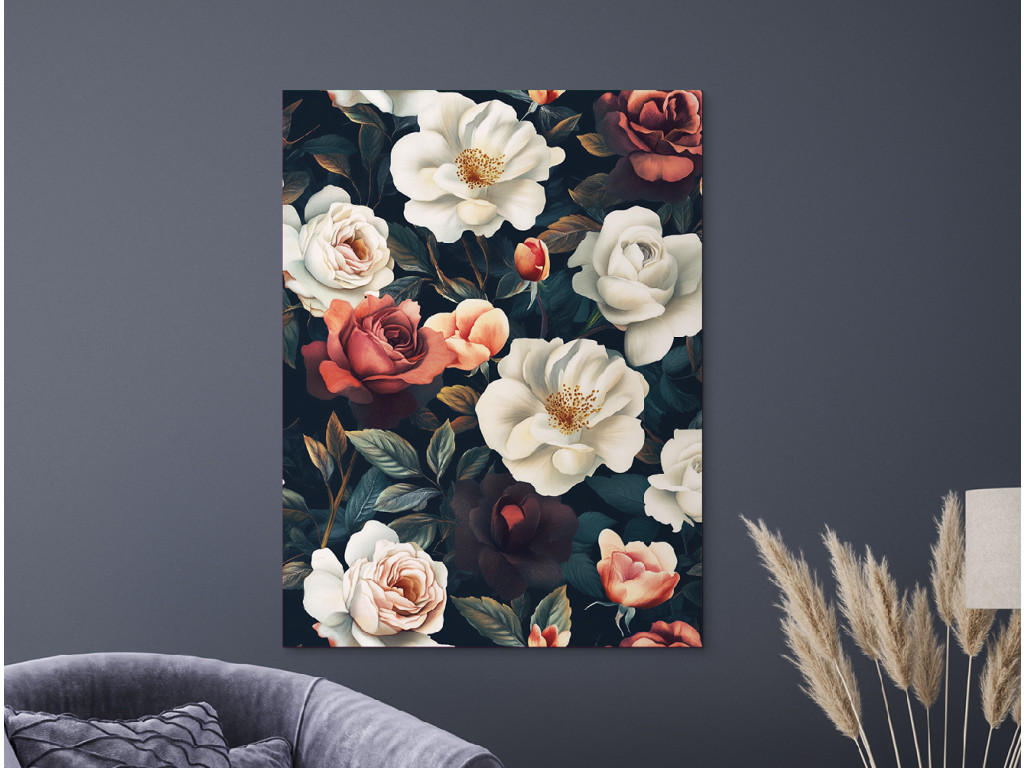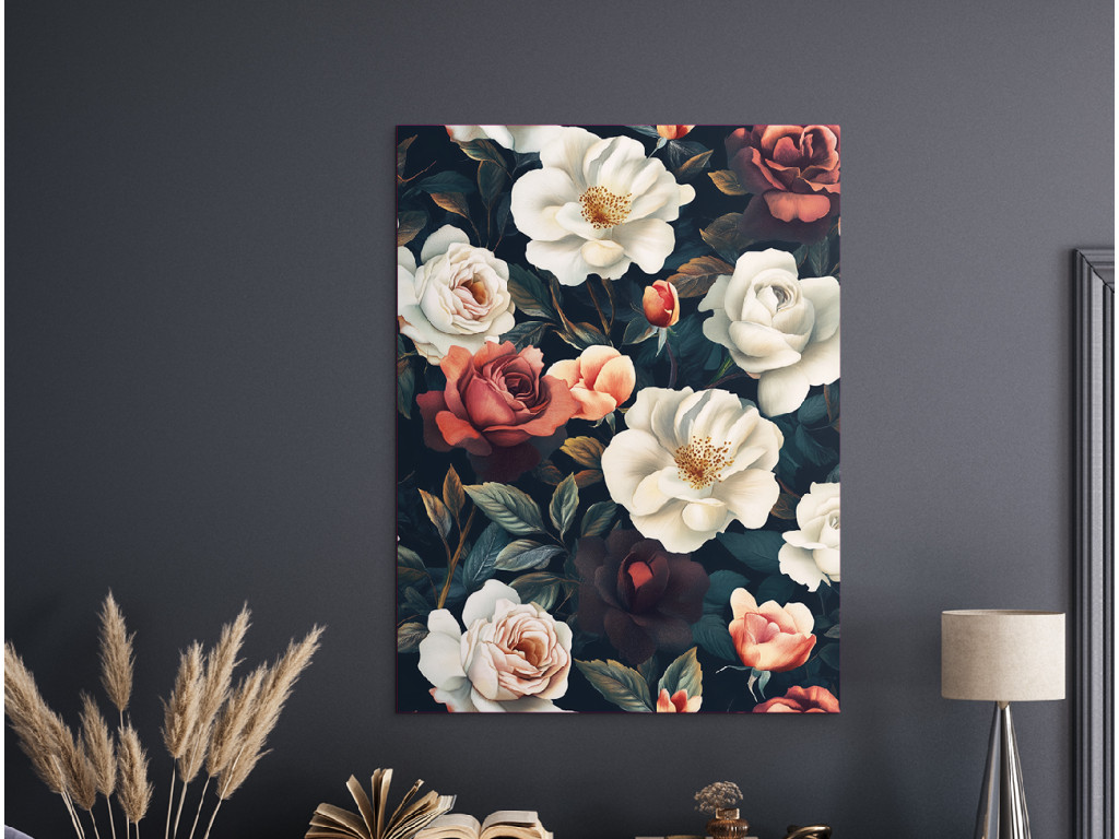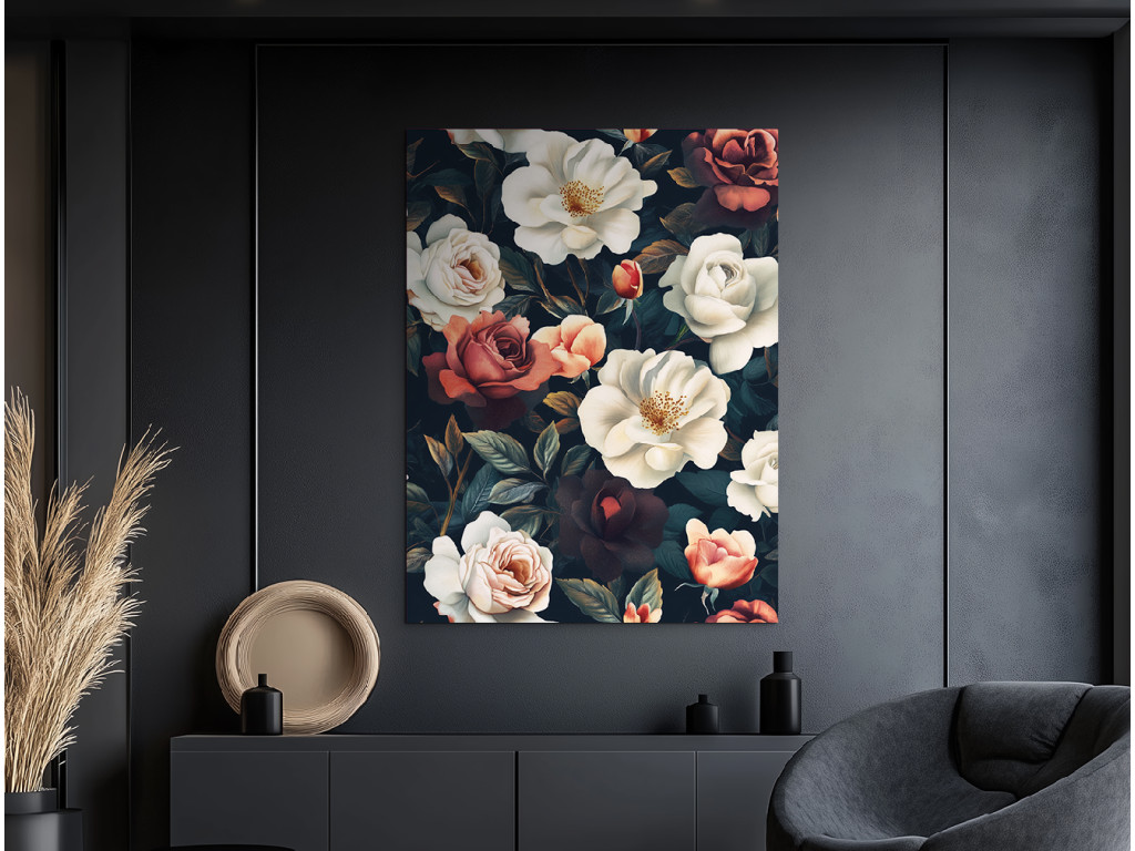 Farbige Rosen sind ein Bild mit einem leicht dramatischen Touch, auf dem weiße und rote gemalte Rosen vor einem dunkleren Hintergrund mit einem sanften Filtereffekt hervorstechen. Die dunkle Farbpalette verleiht dem klassischen Motiv Tiefe, Eleganz und eine leicht geheimnisvolle Atmosphäre. Es eignet sich hervorragend für Schlafzimmer, Bibliotheken oder Innenräume mit Vintage- oder Glamour-Elementen.