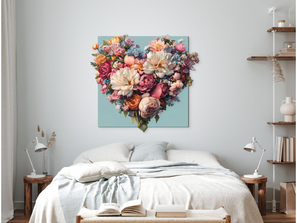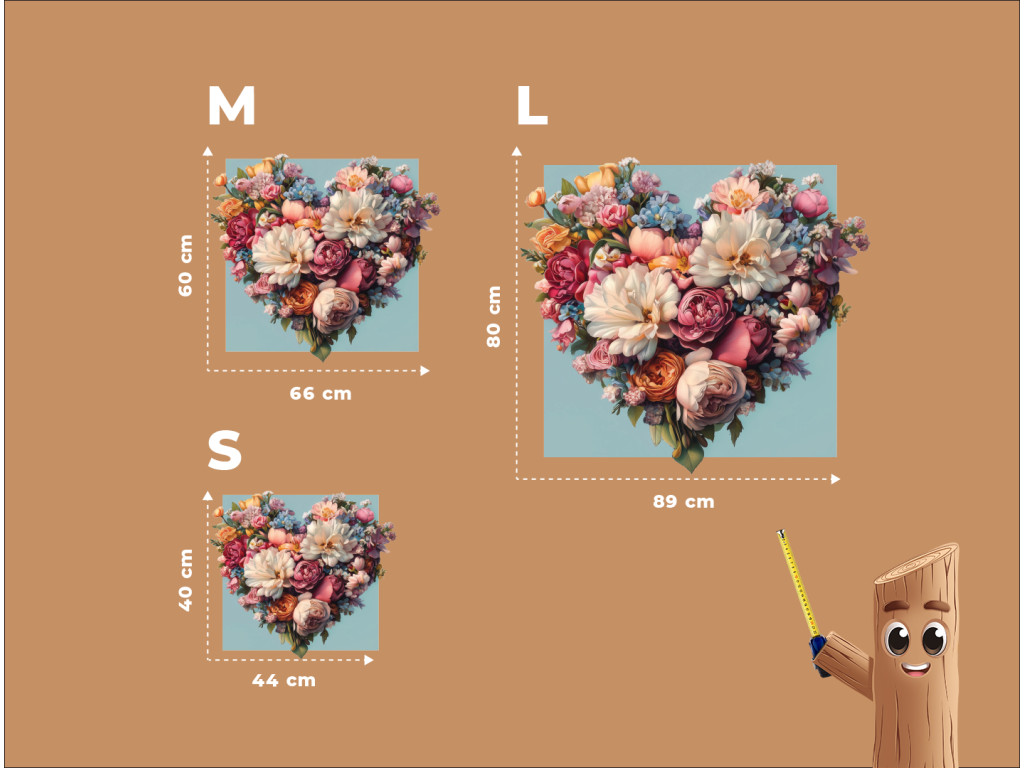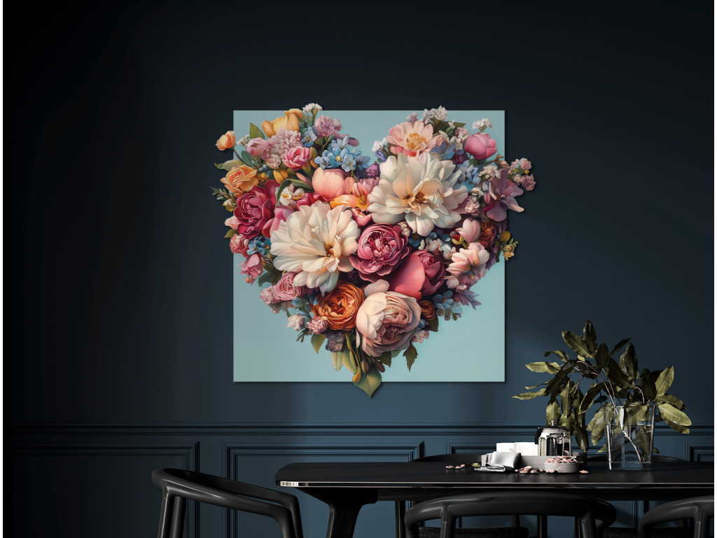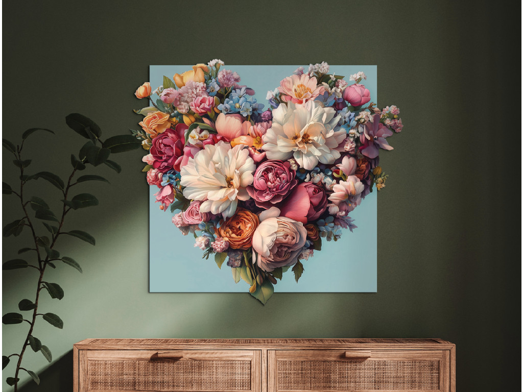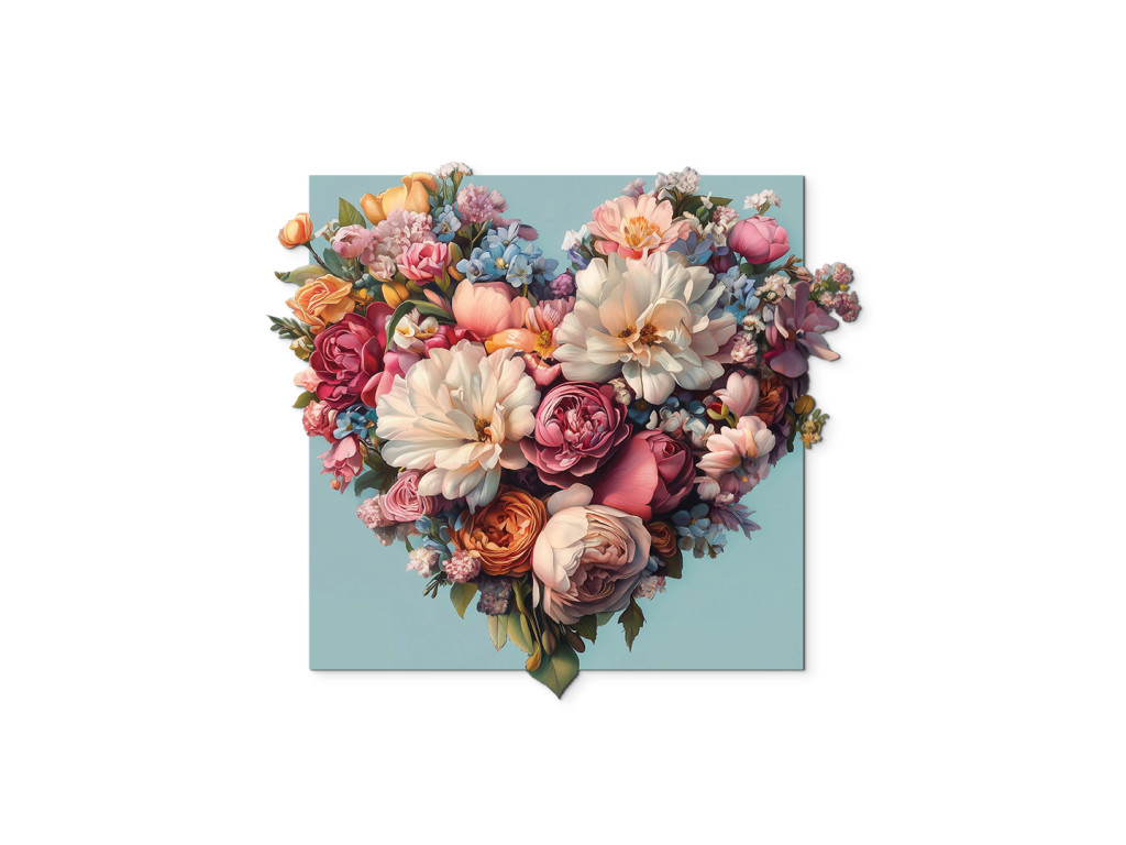 Das romantische Blumenarrangement in Herzform strahlt in zarten Rosa-, Weiß-, Blau- und Orangetönen, wobei Rosen und Pfingstrosen die dominierenden Blumen sind. Die Herzform und die hellen, freundlichen Farben drücken Zärtlichkeit, Zuneigung und tiefe Gefühle aus, was es zu einem idealen Symbol der Liebe für besondere Anlässe wie Hochzeiten, Jahrestage oder den Valentinstag macht. Das Herz in Blüte ist ein visuelles Bekenntnis, das ohne Worte spricht – aufrichtig und schön.