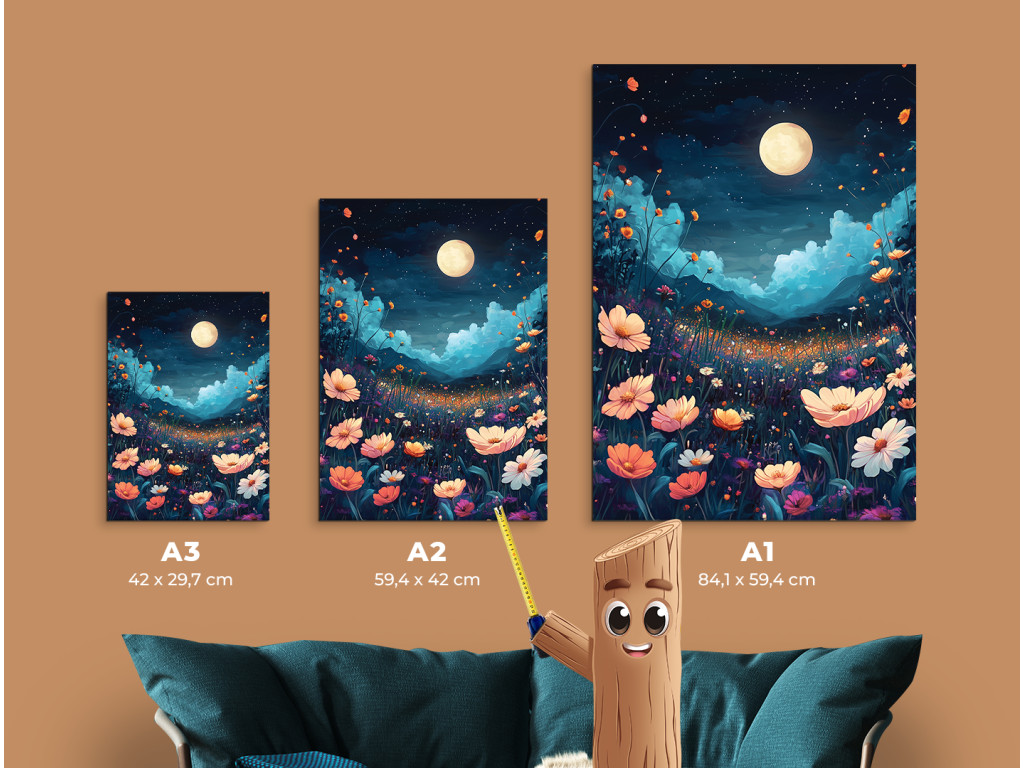 Mondwiese ist ein Bild voller Kontraste und sanfter Magie – bunte Wiesenblumen blühen in der Dunkelheit, beleuchtet nur vom gedämpften Mondlicht. Die Farben der Blumen auf dem dunklen Hintergrund wirken lebendig und traumhaft zugleich, als würde die Wiese in ihrem eigenen stillen Licht leuchten. Das Bild bringt Ruhe, Poesie und einen Hauch von nächtlicher Natur in den Raum – ideal für das Schlafzimmer, den Entspannungsbereich oder die Leseecke.