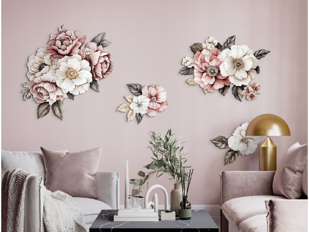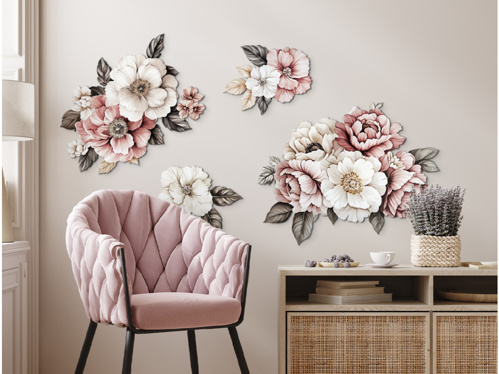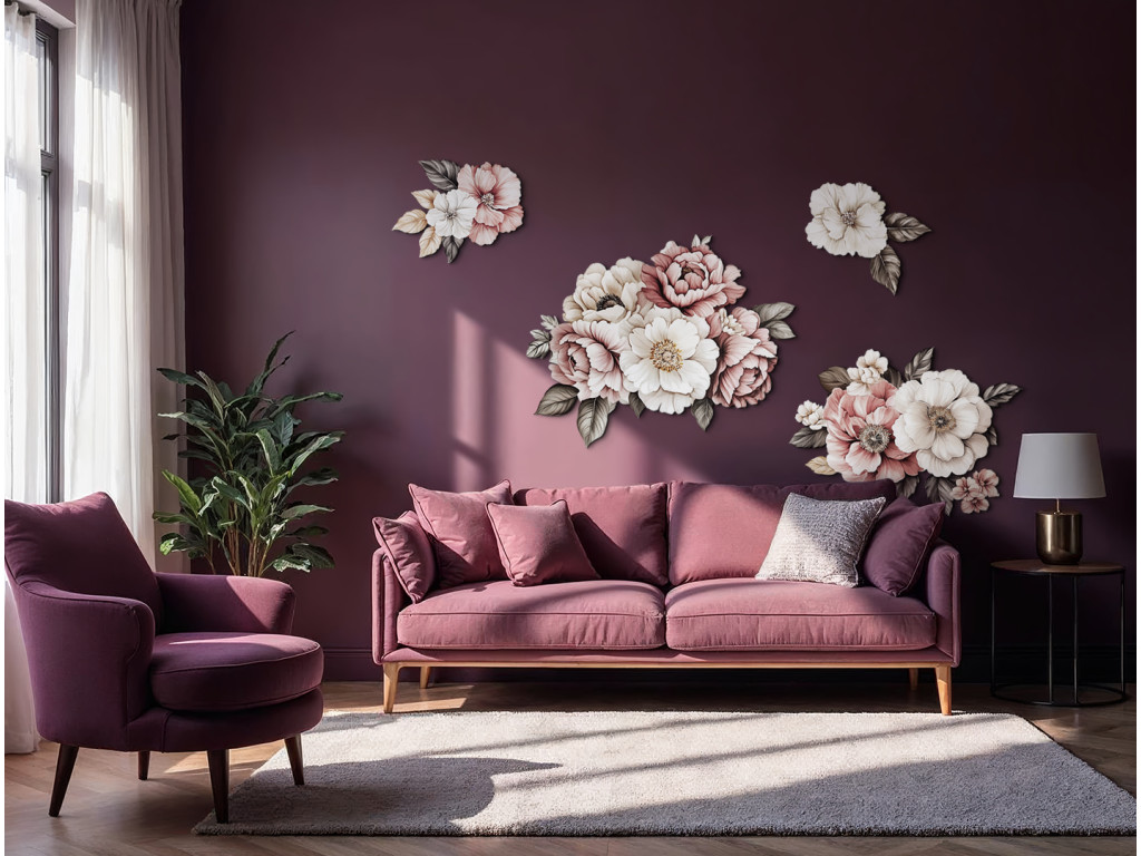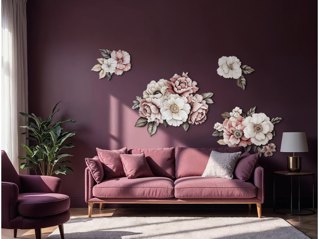 Die romantische Wanddekoration mit rosa und weißen Blumenmotiven schafft eine zarte und harmonische Atmosphäre im Raum. Die sanften Farbtöne und das Blumenmotiv wirken elegant, frisch und vermitteln ein Gefühl von Ruhe und Gemütlichkeit. Die ideale Ergänzung für Innenräume, die sich nach einem Hauch von Natur und Romantik sehnen.