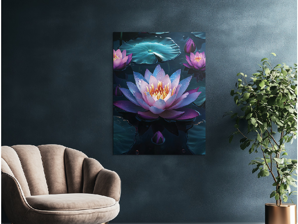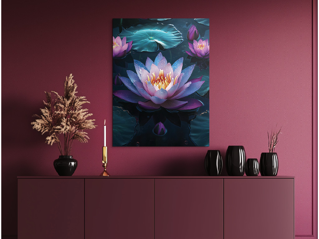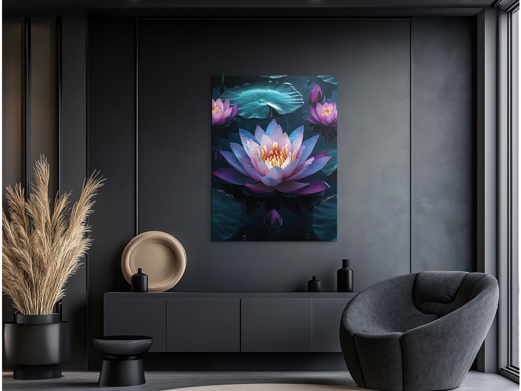 Seerose auf dem See ist ein Bild mit einer sanften und ausgewogenen Komposition, das die Schönheit einer einsamen Seerose einfängt, die auf einer ruhigen Oberfläche schwimmt. Die Lichtreflexe auf dem Wasser und die sanften Farbtöne des Bildes vermitteln ein Gefühl von Stille, Frieden und Verbundenheit mit der Natur. Eine ideale Ergänzung für Schlafzimmer, Badezimmer oder Entspannungsbereiche, wo es eine harmonische Atmosphäre schafft.