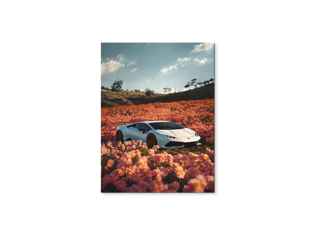 Wilde Zartheit ist ein Bild, das die Eleganz eines luxuriösen weißen Lamborghini Huracán mit der Zartheit eines blühenden Feldes voller rosa Blumen verbindet. Dieser unerwartete Kontrast zwischen Technik und Natur wird durch die malerische Hügellandschaft im Hintergrund und den ruhigen Himmel mit Wolken noch verstärkt. Das Bild wirkt modern, stilvoll und gleichzeitig poetisch – ideal für Liebhaber von Autos, Design und visuellen Effekten.