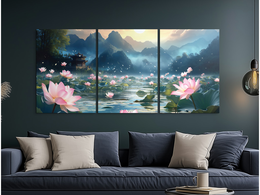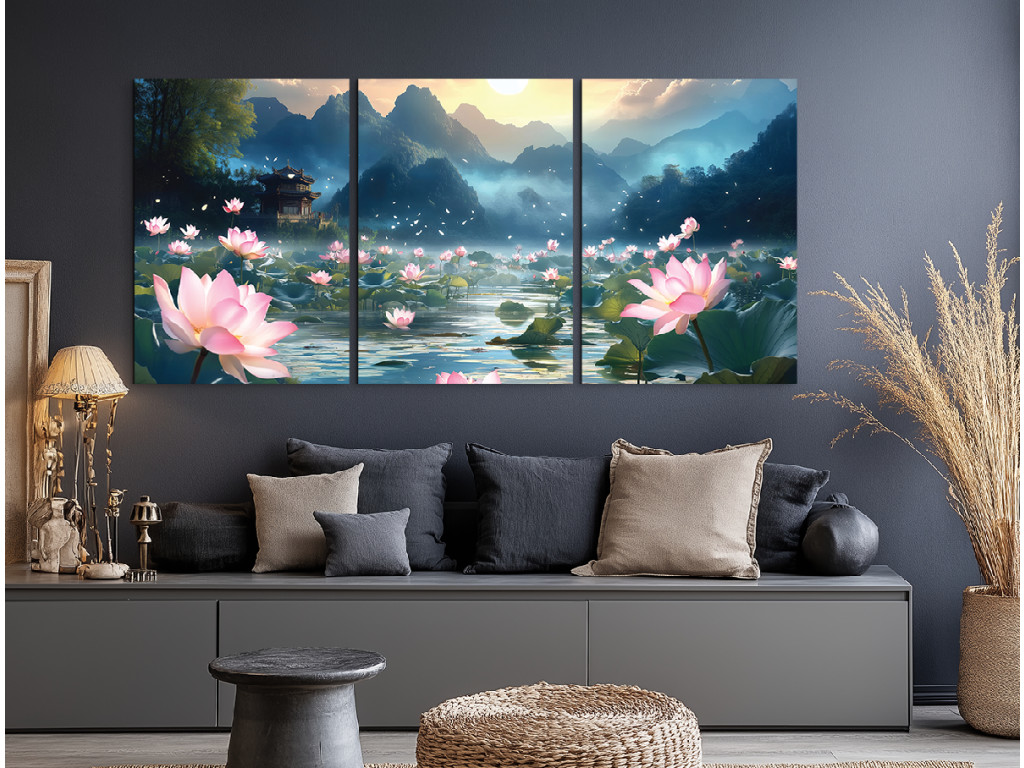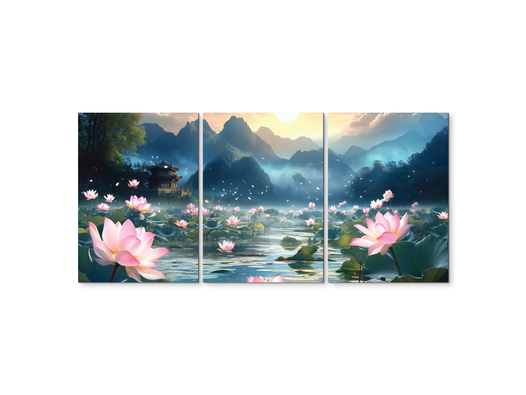 Die Stille des Sees ist ein dreiteiliges Bild, das einen ruhigen Blick auf einen See voller Wasserlilien unter der Silhouette der Berge einfängt, der vom warmen Abendlicht der untergehenden Sonne überflutet wird. Die goldenen Reflexe auf der Oberfläche und die sanfte Farbpalette schaffen eine beruhigende, romantische Atmosphäre.