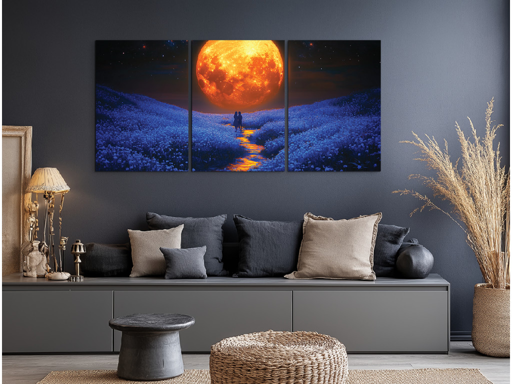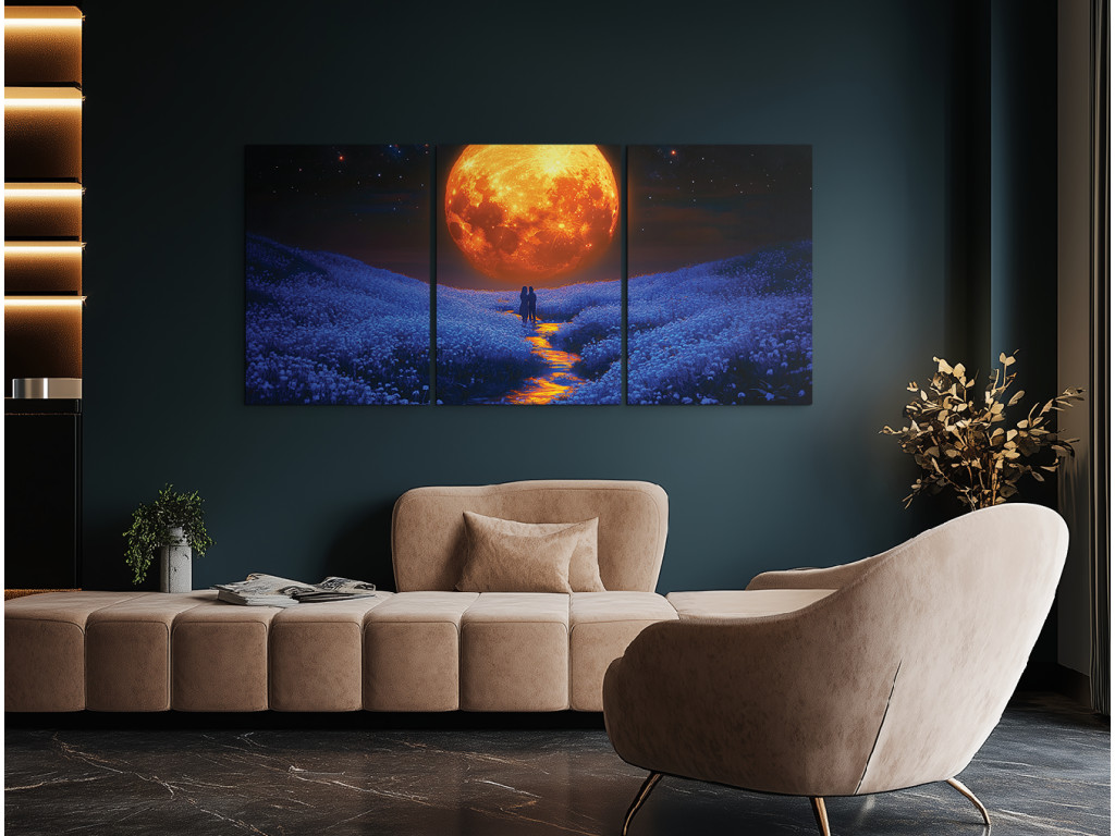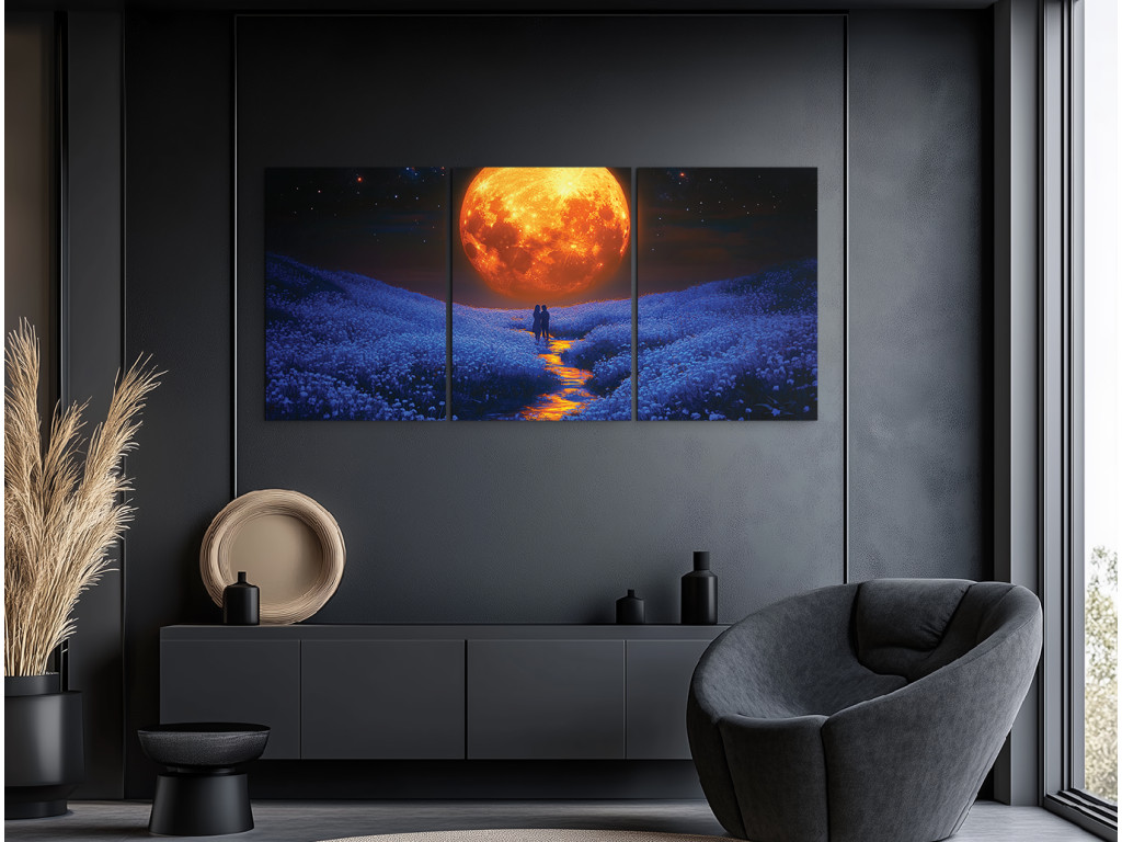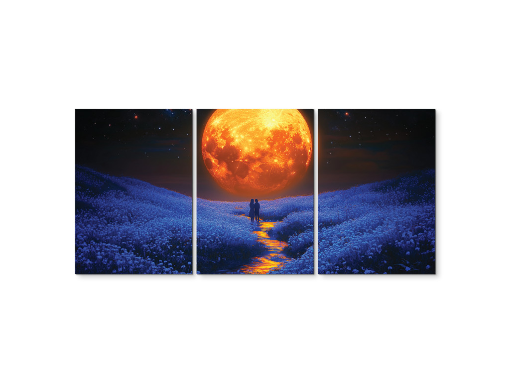 Unter dem Mondhimmel ist ein dreiteiliges Bild, das eine stille Geschichte von Liebe und Frieden erzählt – eine weitläufige Wiese voller Blumen badet im sanften Licht eines großen orangefarbenen Mondes, während ein Bach durch die Landschaft fließt und zwei Figuren unter dem Nachthimmel umarmt stehen.