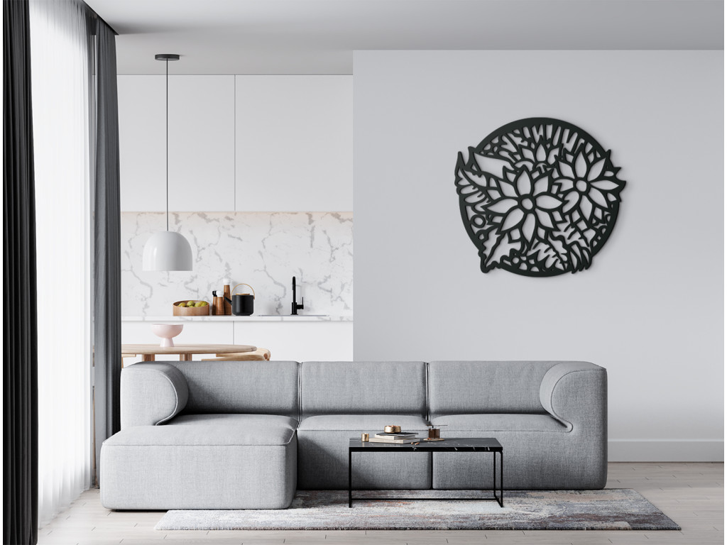 Das Holzbild Blumen verleiht dem Innenraum ein natürliches und ästhetisches Aussehen. Die Dekoration stellt Blumen mit Blättern dar. Das Bild wird die Aufmerksamkeit der Besucher auf sich ziehen, so dass Sie es im Flur und in der Diele sowie im Wohn- und Schlafzimmer aufhängen können. Es wird sowohl in modernen als auch in klassischen Innenräumen gut zur Geltung kommen.